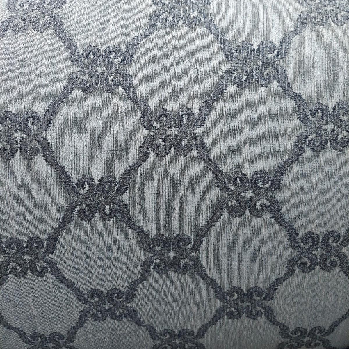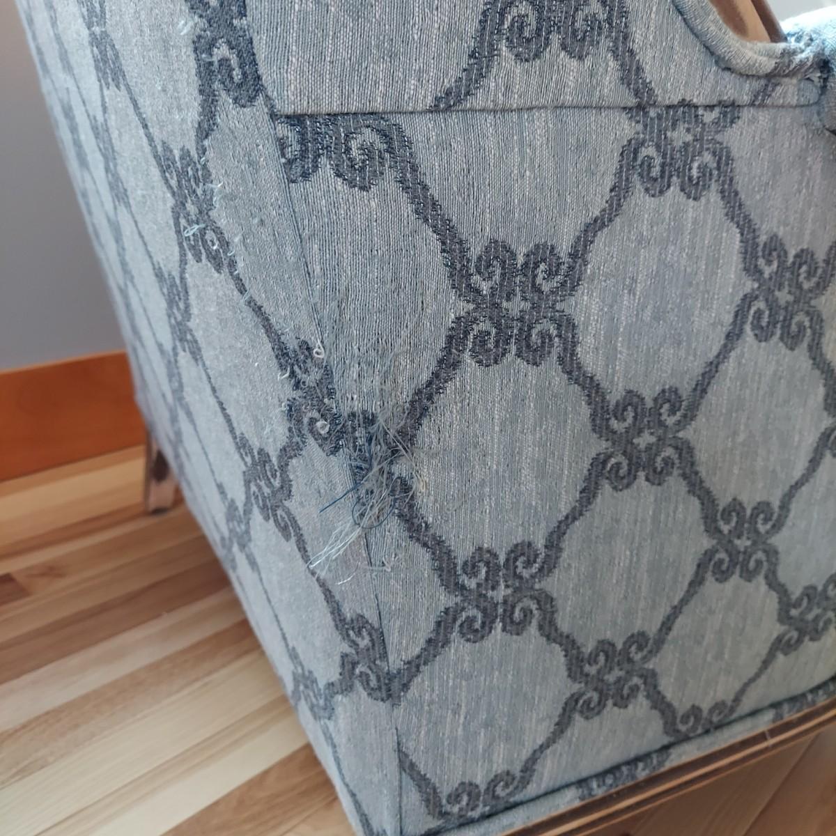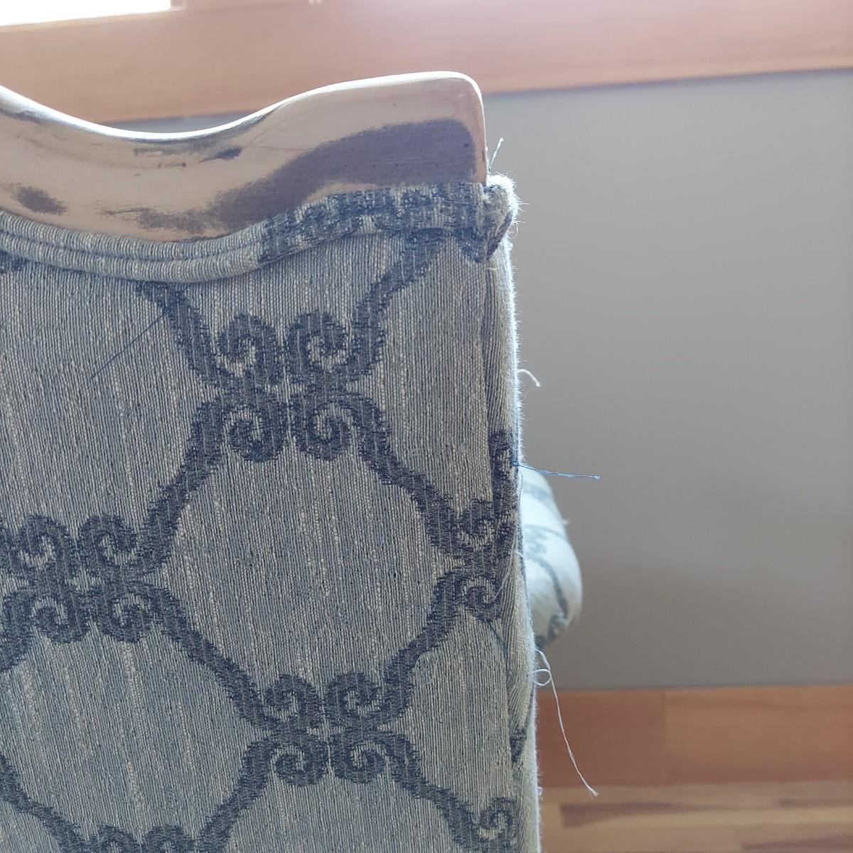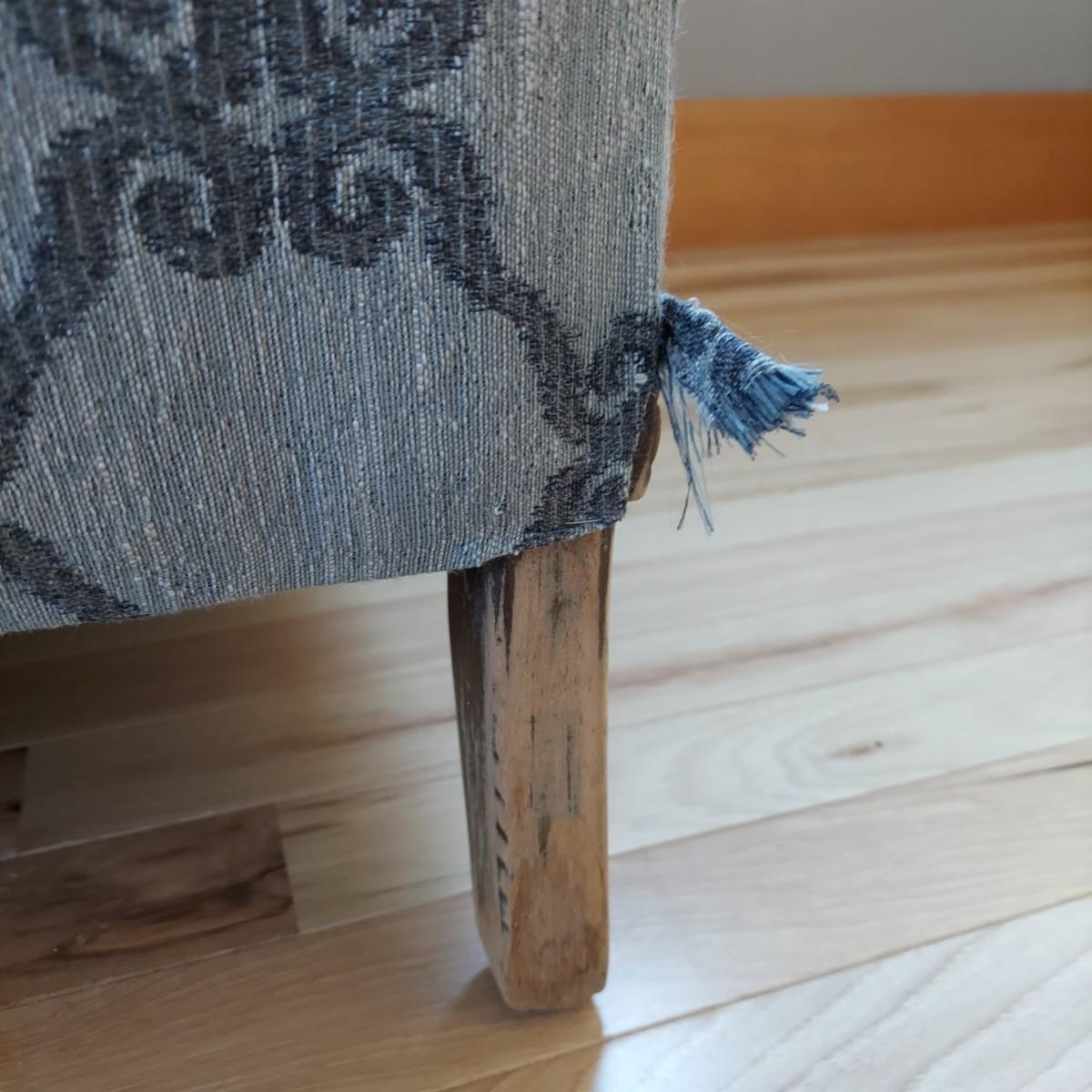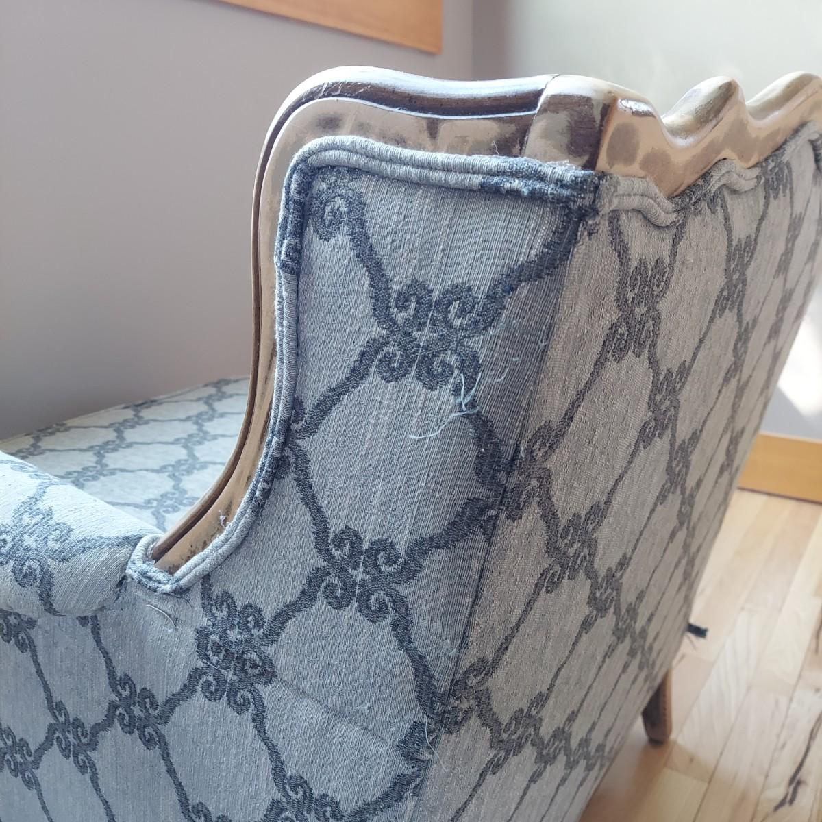 Blue on blue brocade covered armchair with distressed wood trim and legs. There is some wear overall but especially to back edges. Please note item is from a pet owned home. Measures approximately 32 x 32 x 31"H. Seat height is 18". Local Pickup Only.