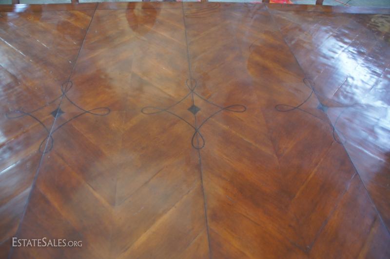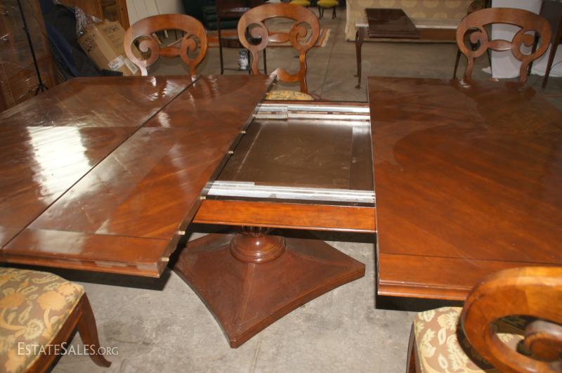 Baroque style large walnut dining table, contemporary + 8 Italian Neoclassical style walnut dining chairs, contemporary, expandable with 2 sections