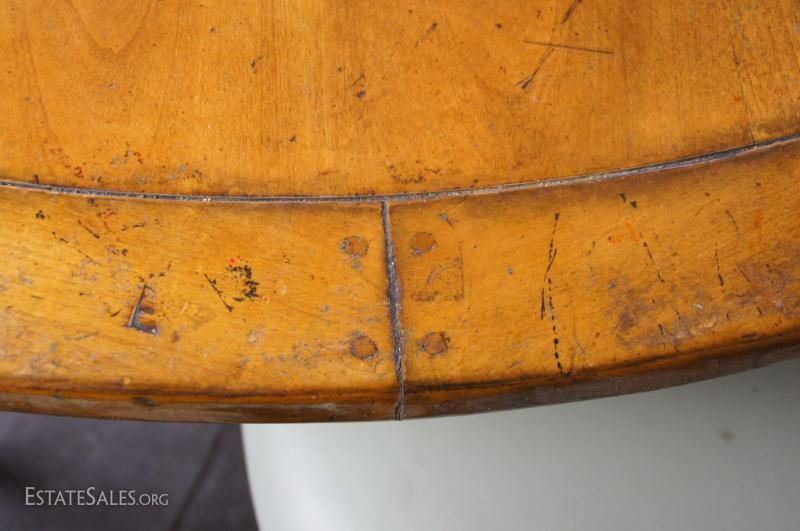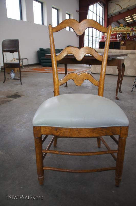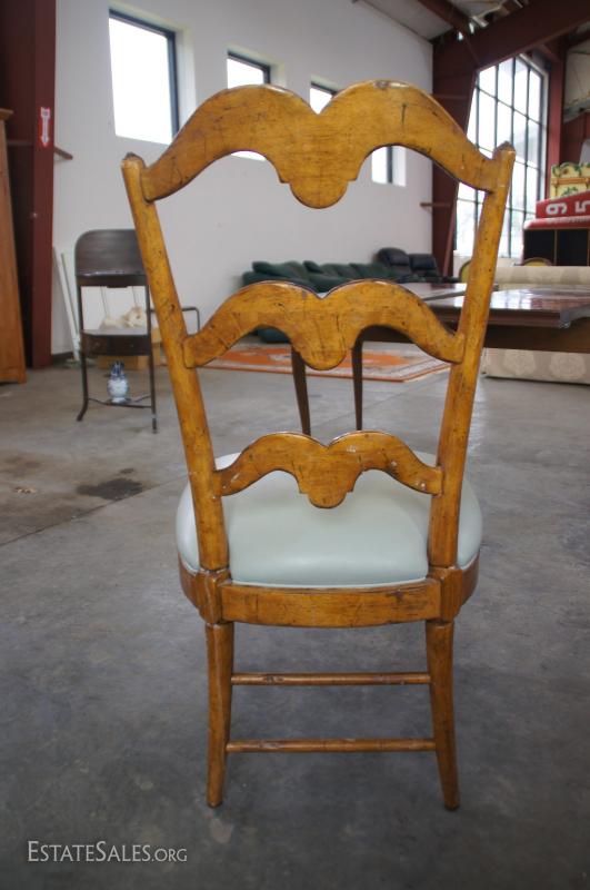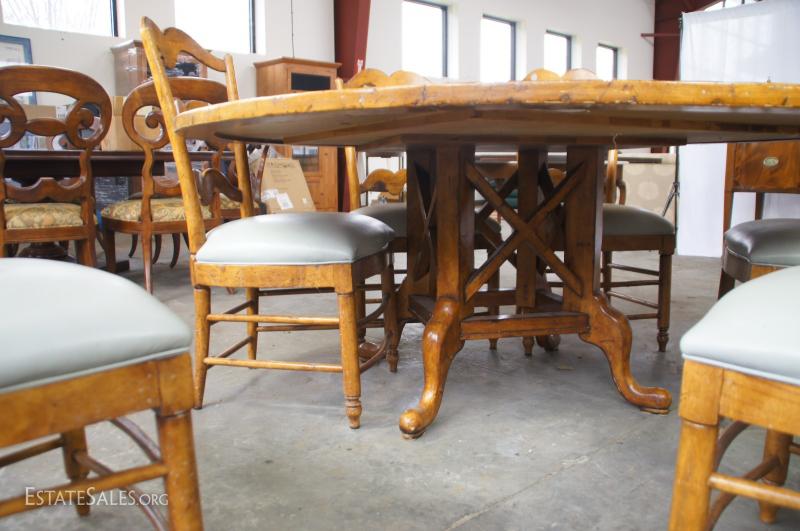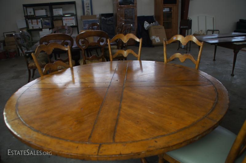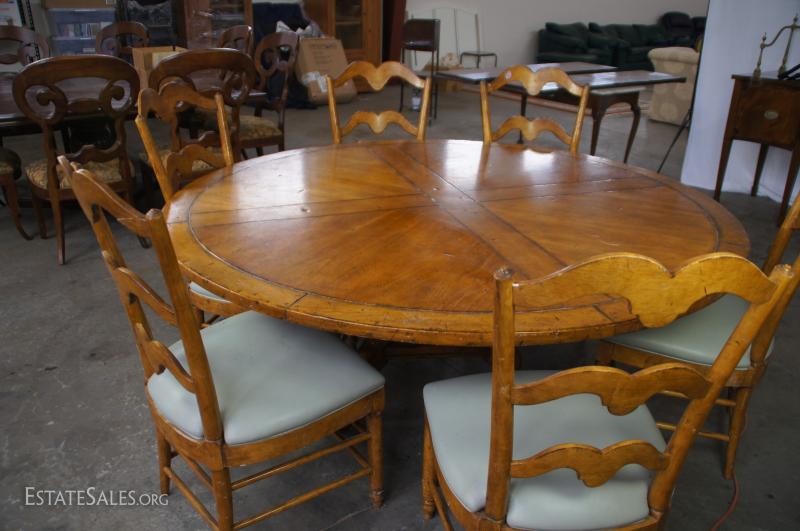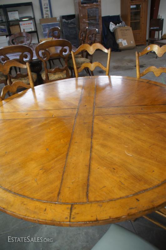 Baroque style mixed wood large circular dining table + 6 Louis XVI provincial style ladderback side chairs, some assembly is required as the table top is not screwed onto the base for easier moving