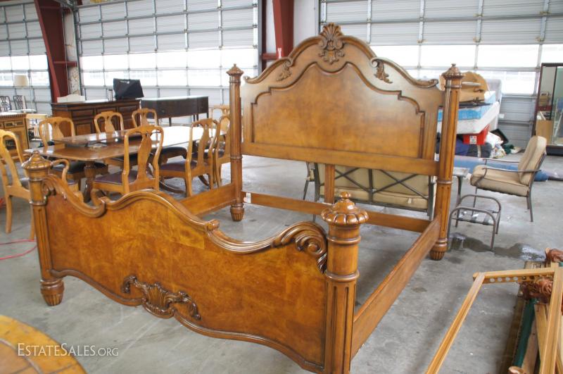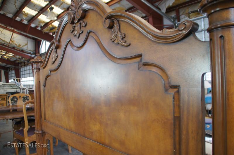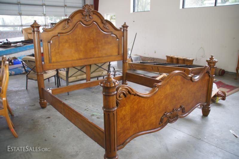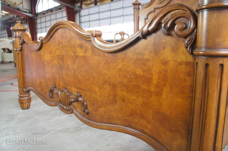Baroque style walnut and mixed wood king size bed - complete but no mattress