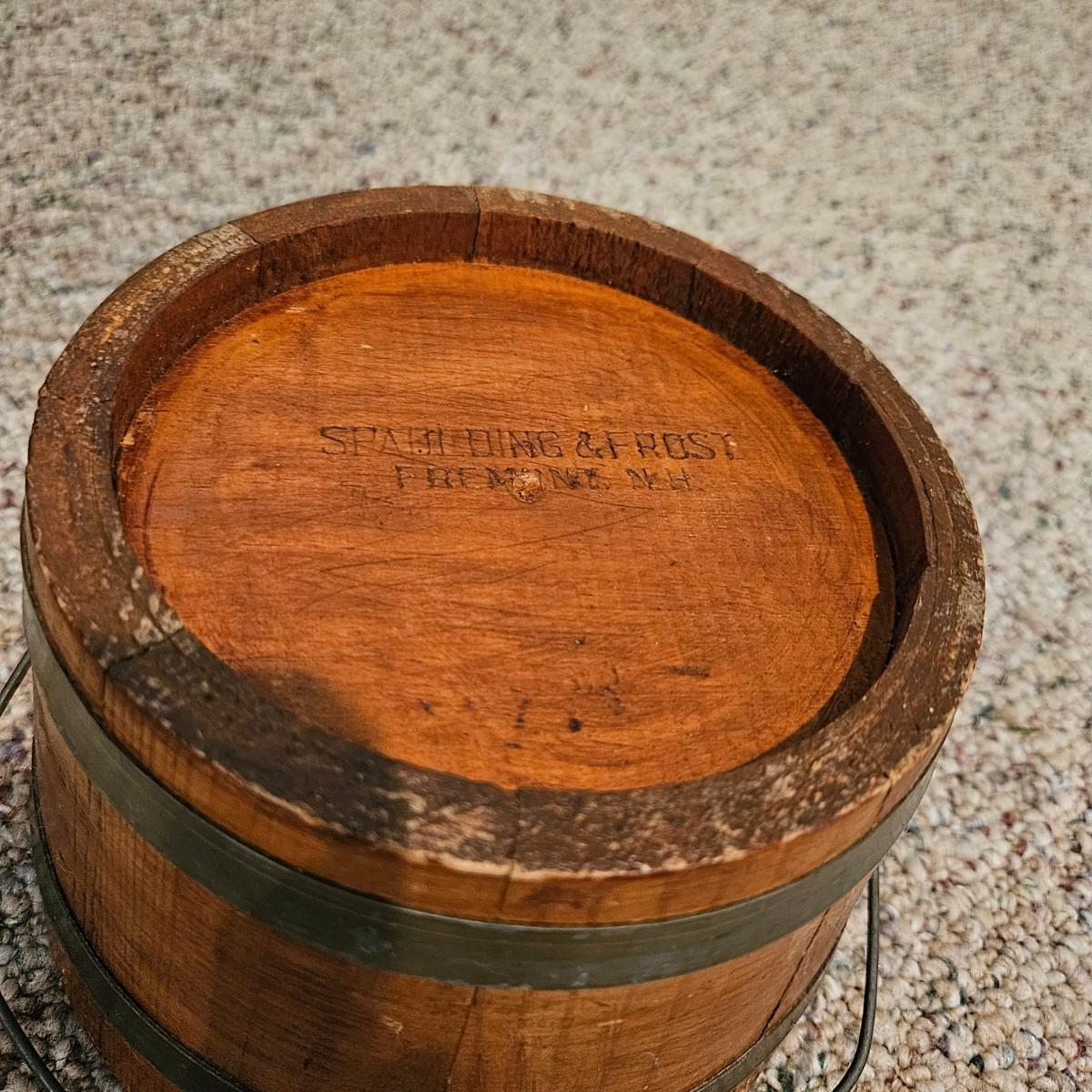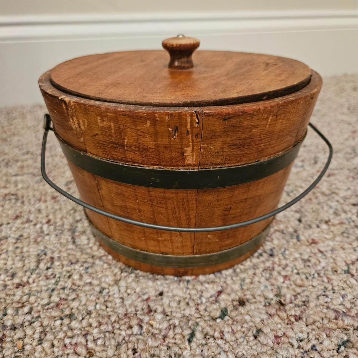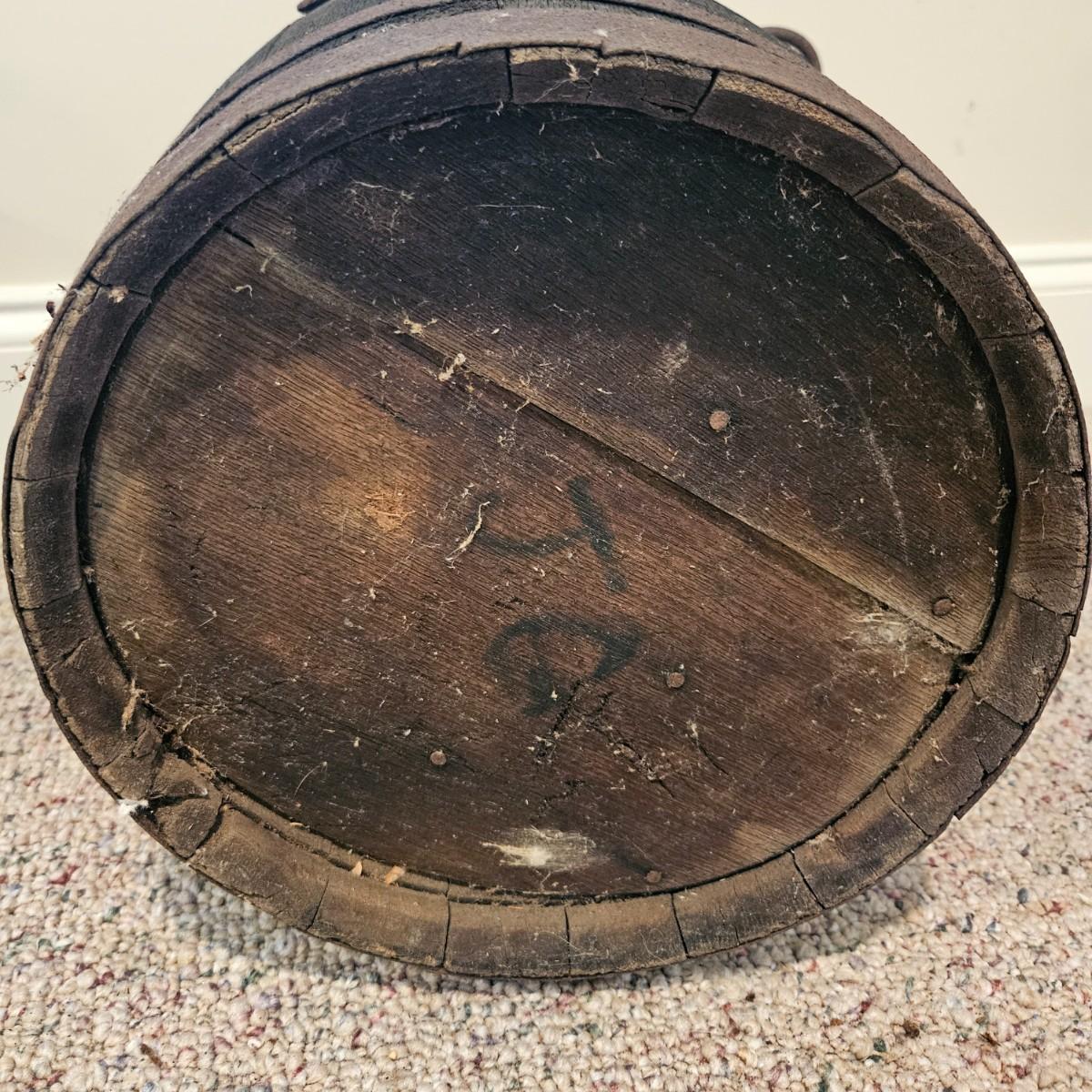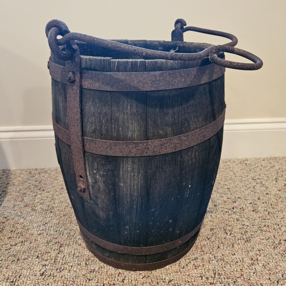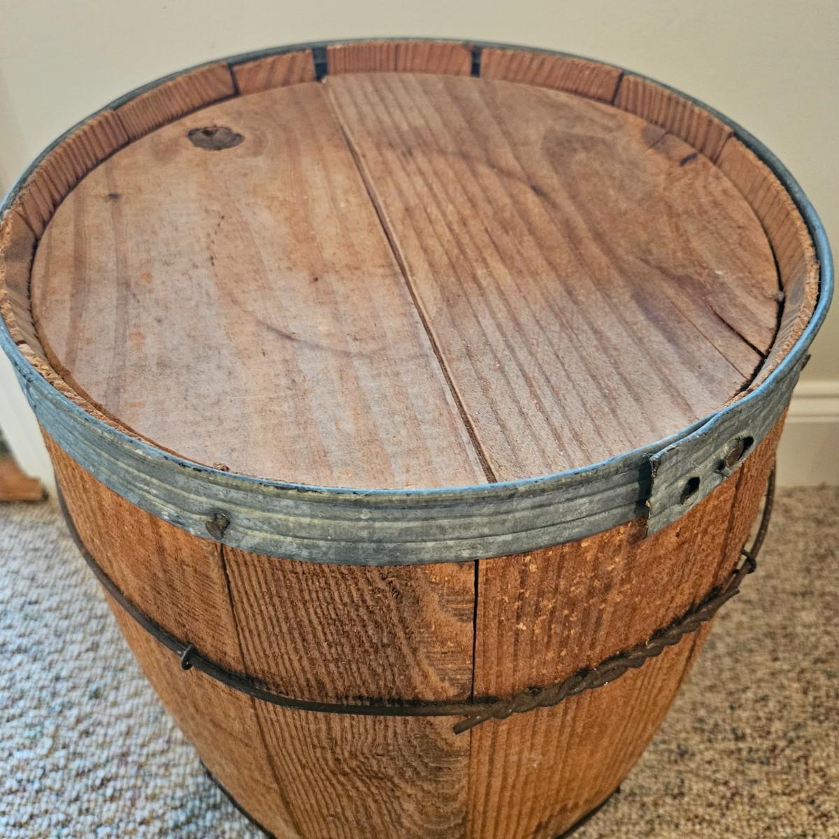 A pair barrels and a bucket made of wood. One barrel is made of a lighter wood with twisted metal for the rings and the other appears to made of oak with iron rings and handle. The larger of the two measures approximately 13"D x 18"H. Also included is a small lidded bucket with metal rings and a handle. Local pickup only