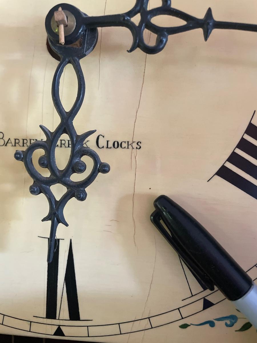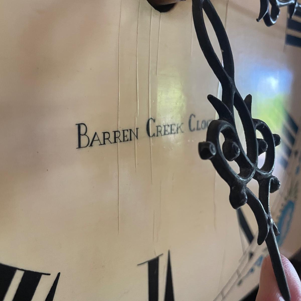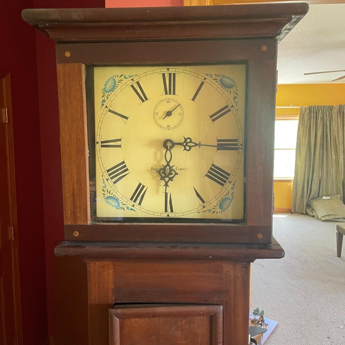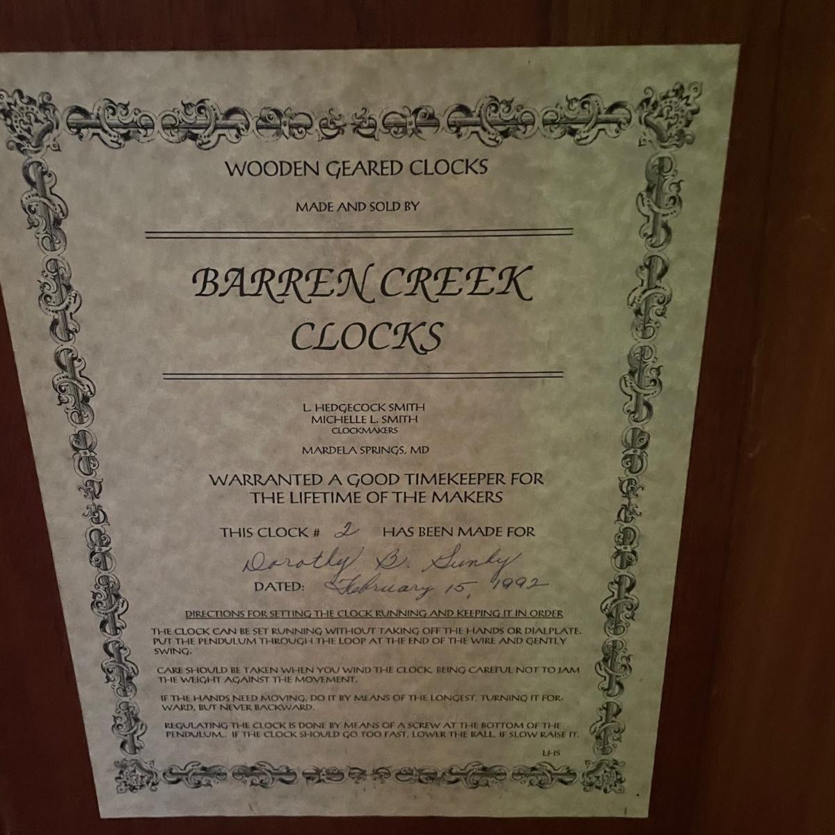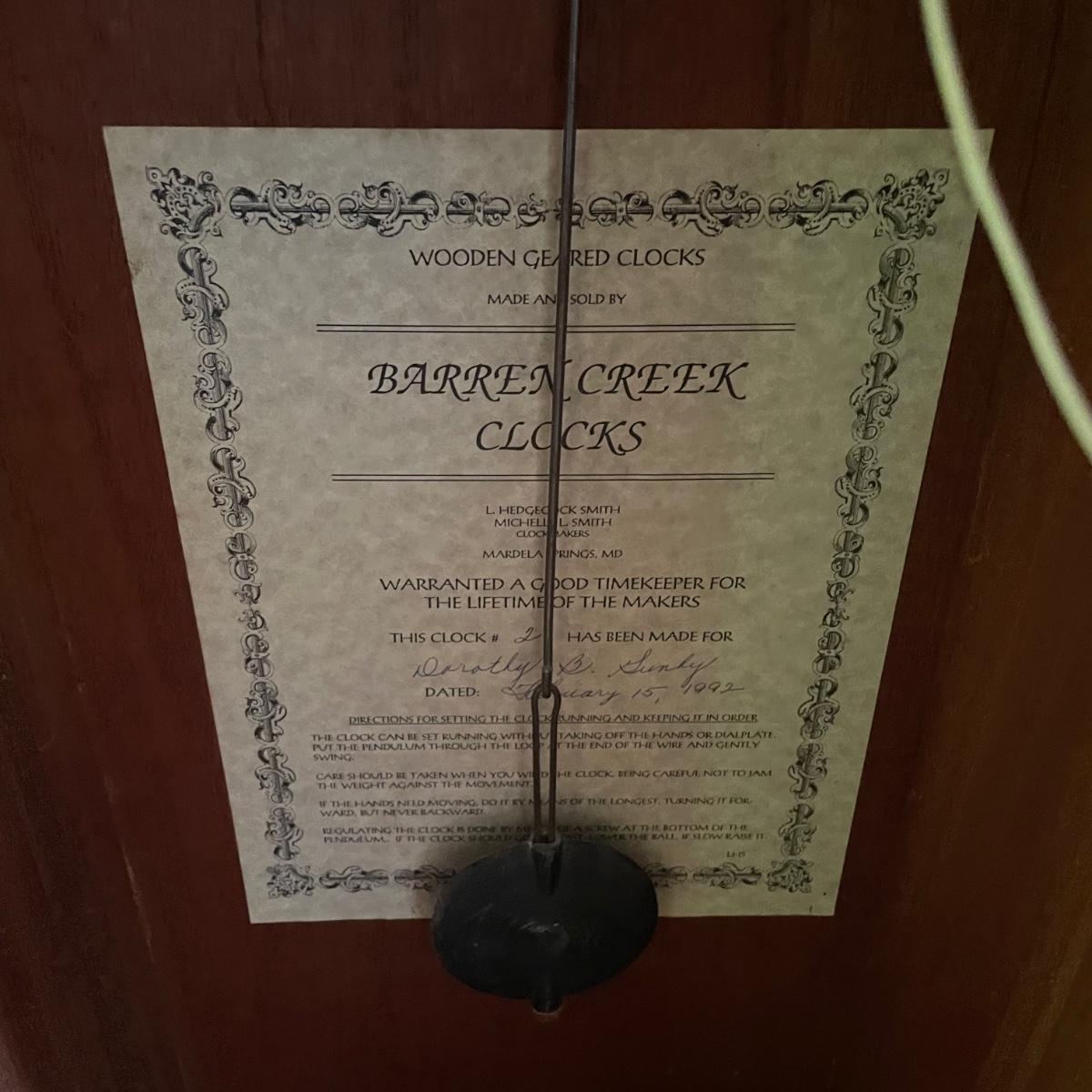 This Barren Creek long case clock is in good condition with just a few surface cracks on the clock face, see images. The chime works but the clock itself does not run, so it will need some work to get it up and running.