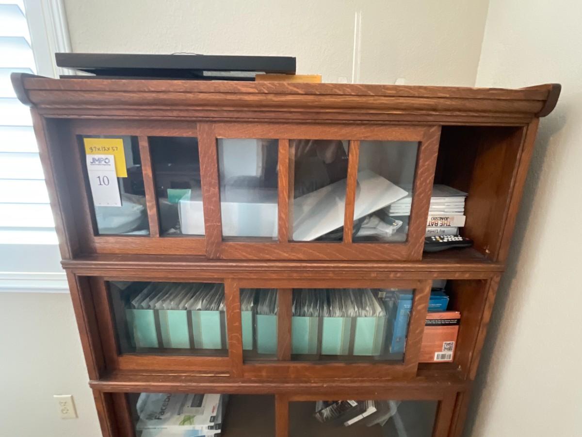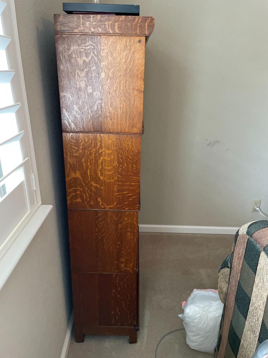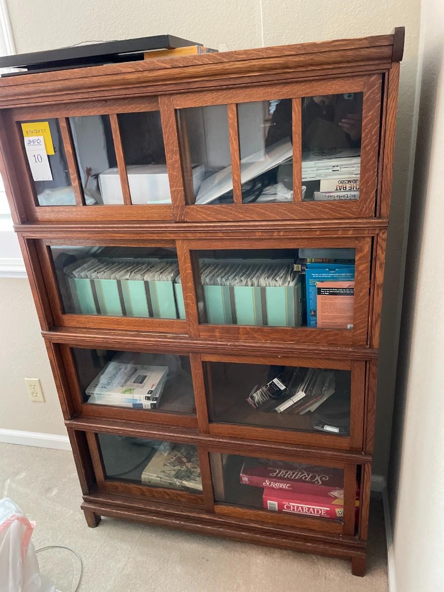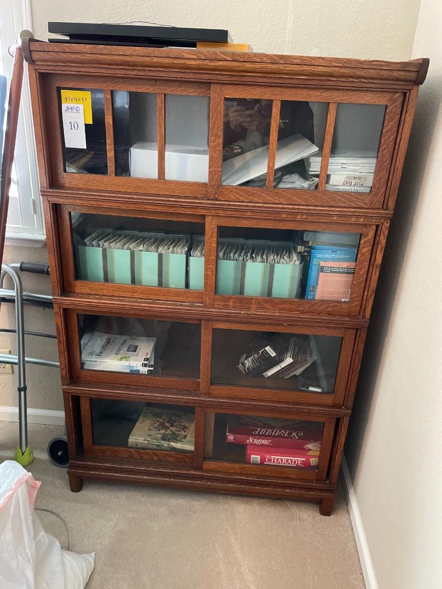 4 tier sectional barrister bookcase with sliding glass doors. Solid wood. 37 x 12 x 57. Minor nicks. Contents not included
