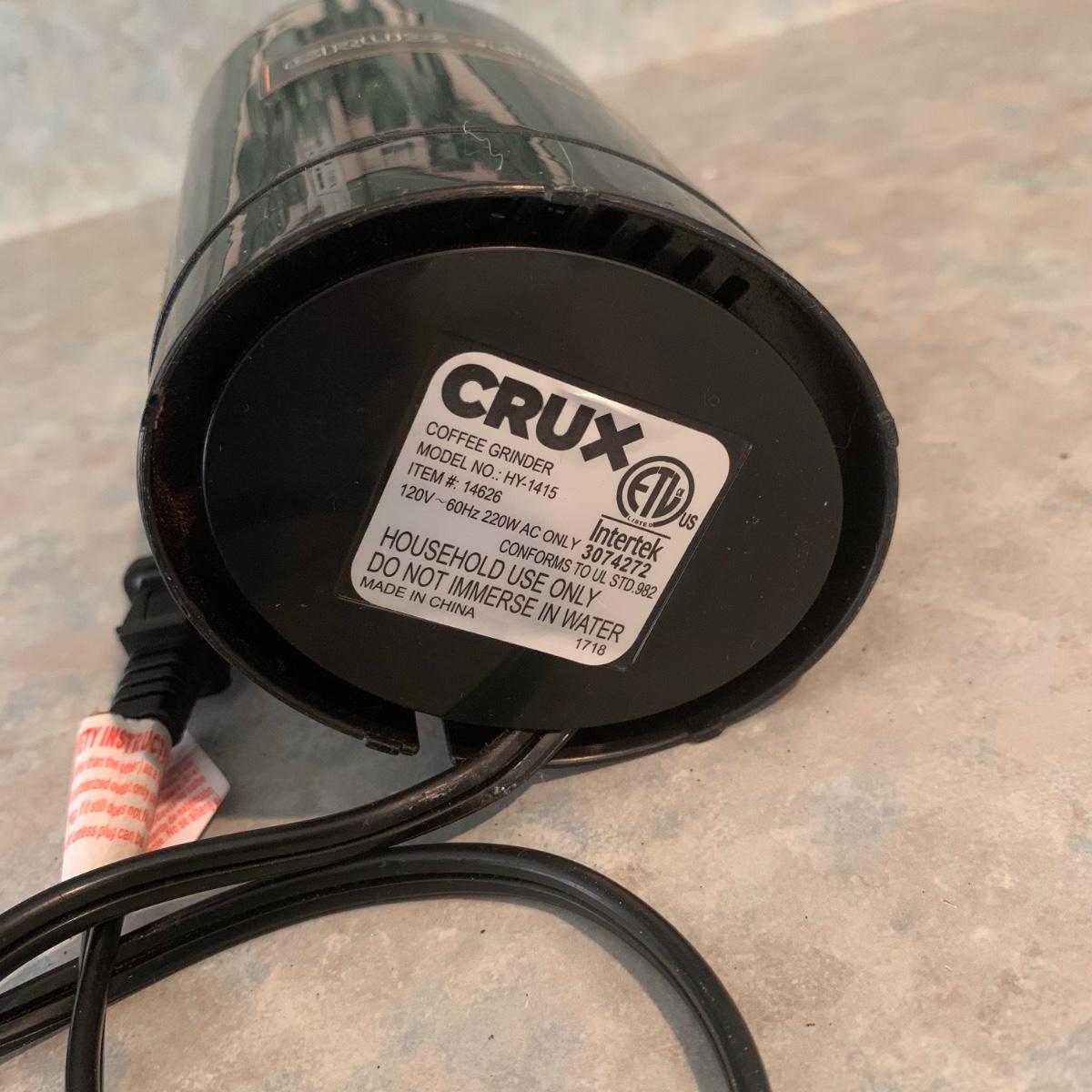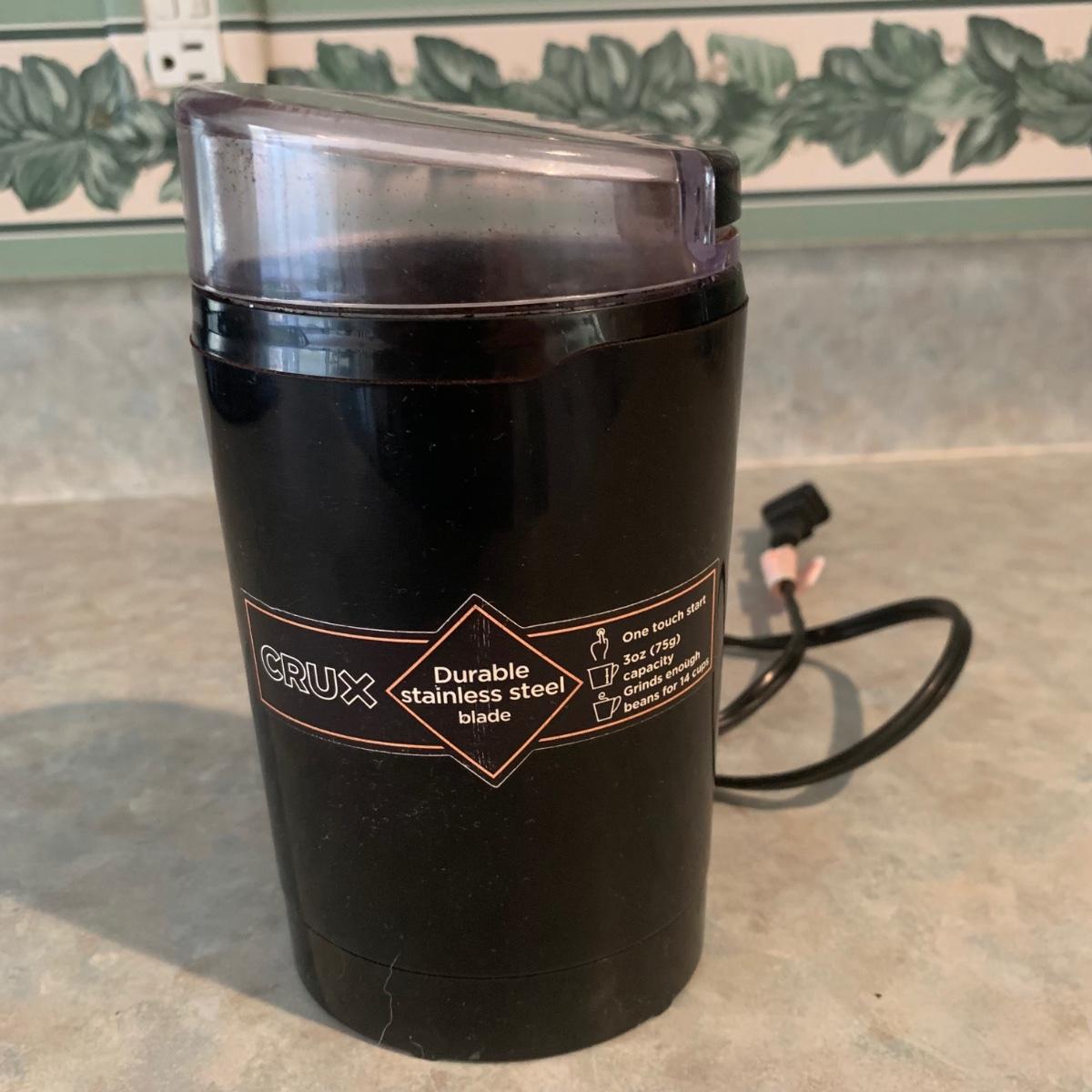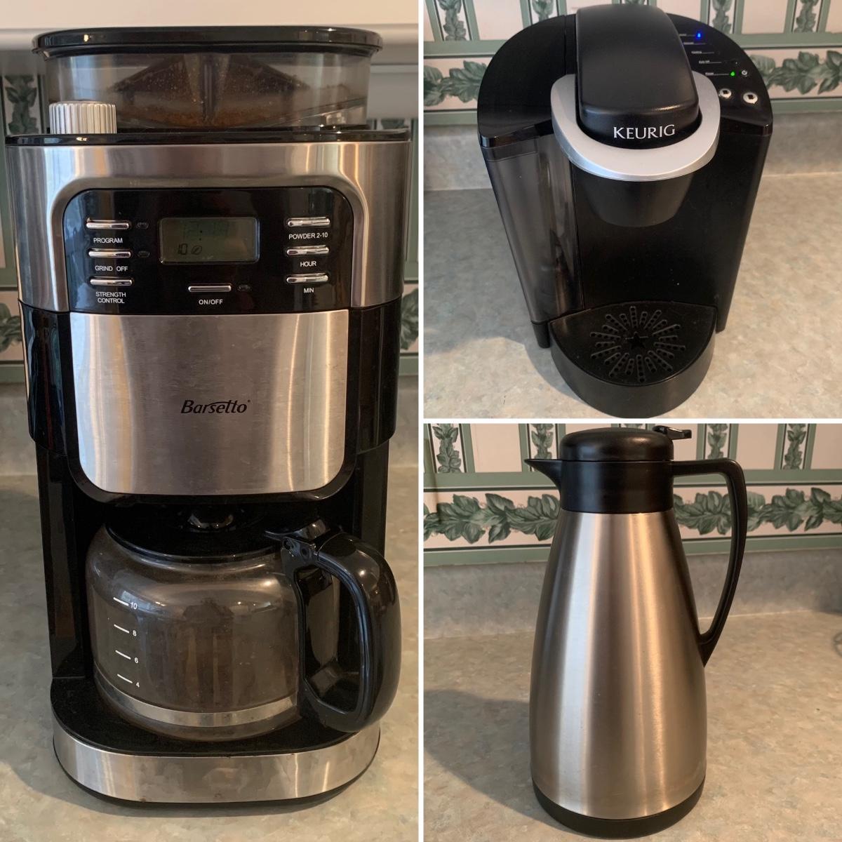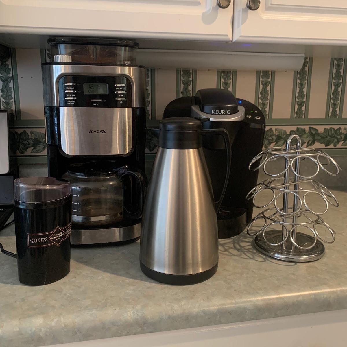 All things coffee! Included are: a Barsetto coffee maker, a Keurig coffee maker with rotating metal pod holder stand, a Crux coffee bean grinder, and a thermal carafe. All electric items powered on when plugged in. The Barsetto coffee maker has a built-in grinder; some coffee beans remain. This item measures 8.25” x 9.5” x 17”H.