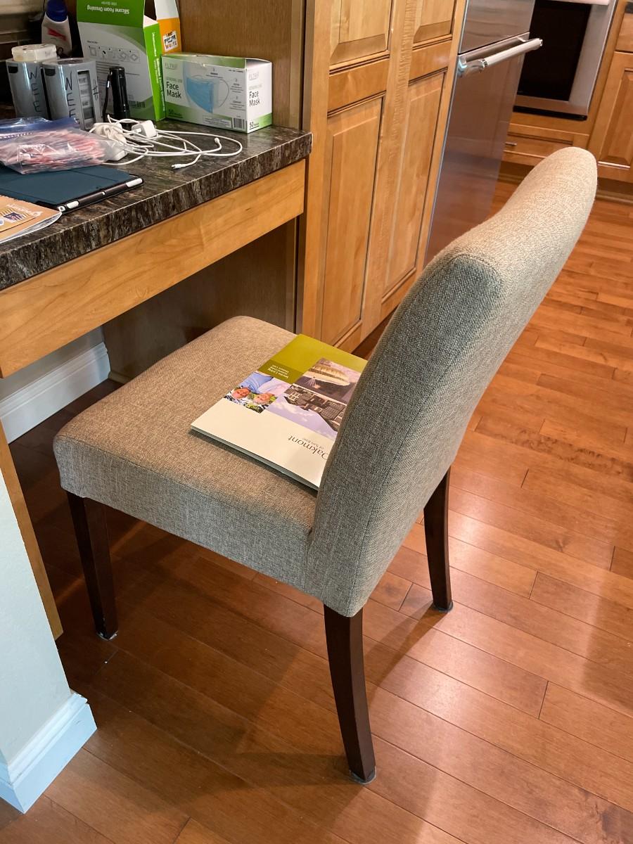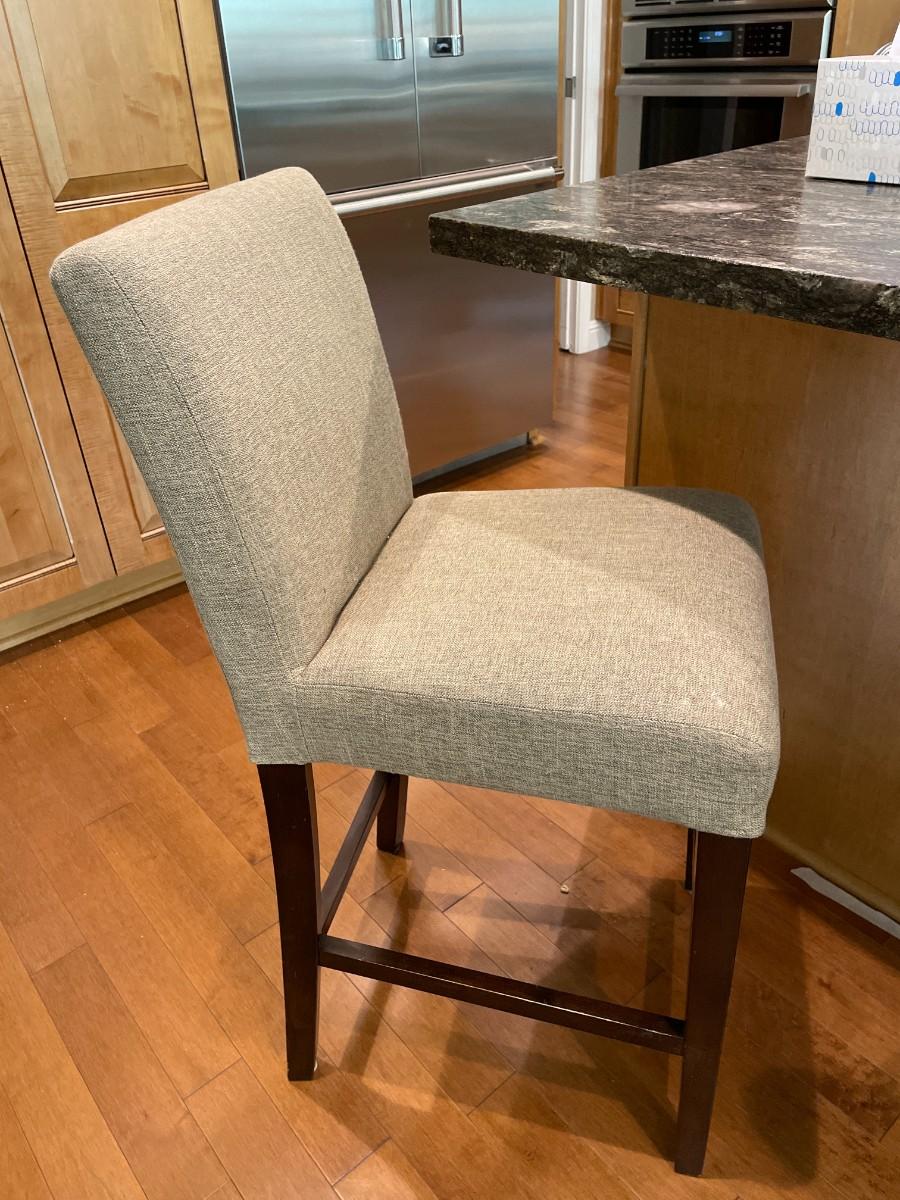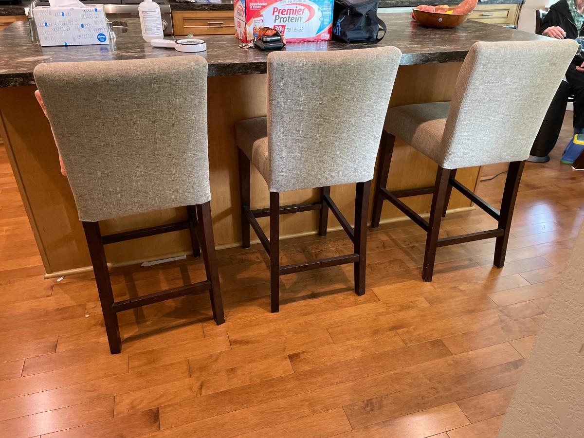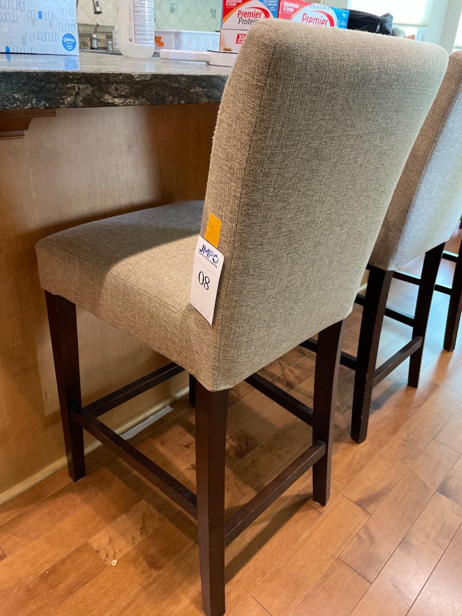 3 upholstered high back counter stools & matching chair. Fabric in very good condition. Some nicks on wood legs.