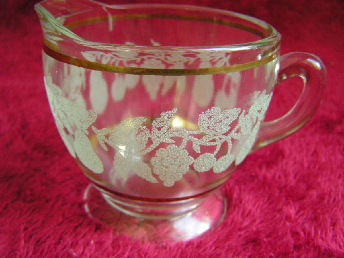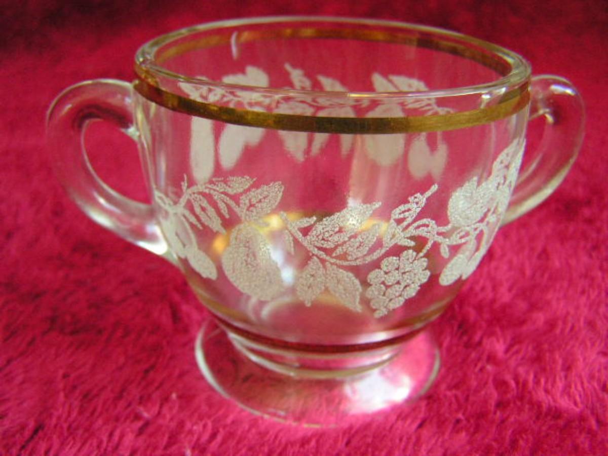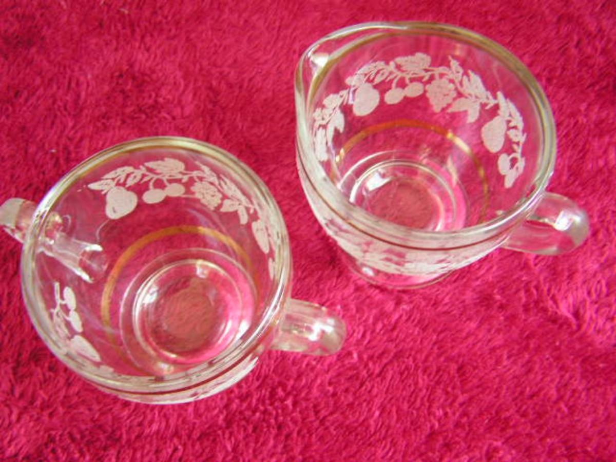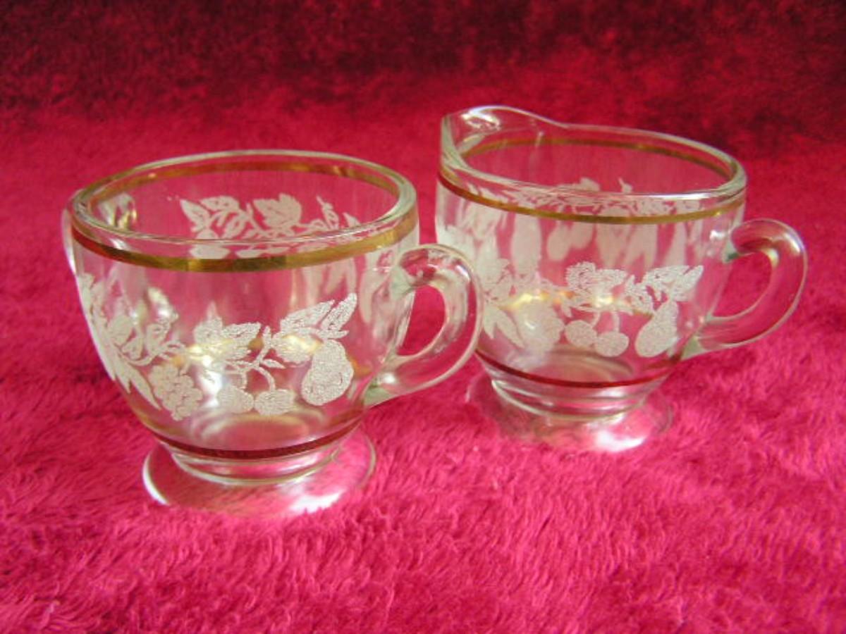 (1of2) Bartlett Collins vintage gold trimmed leaf & grape etched galss cream & sugar set. c.1940s-50s. Good to VG.
