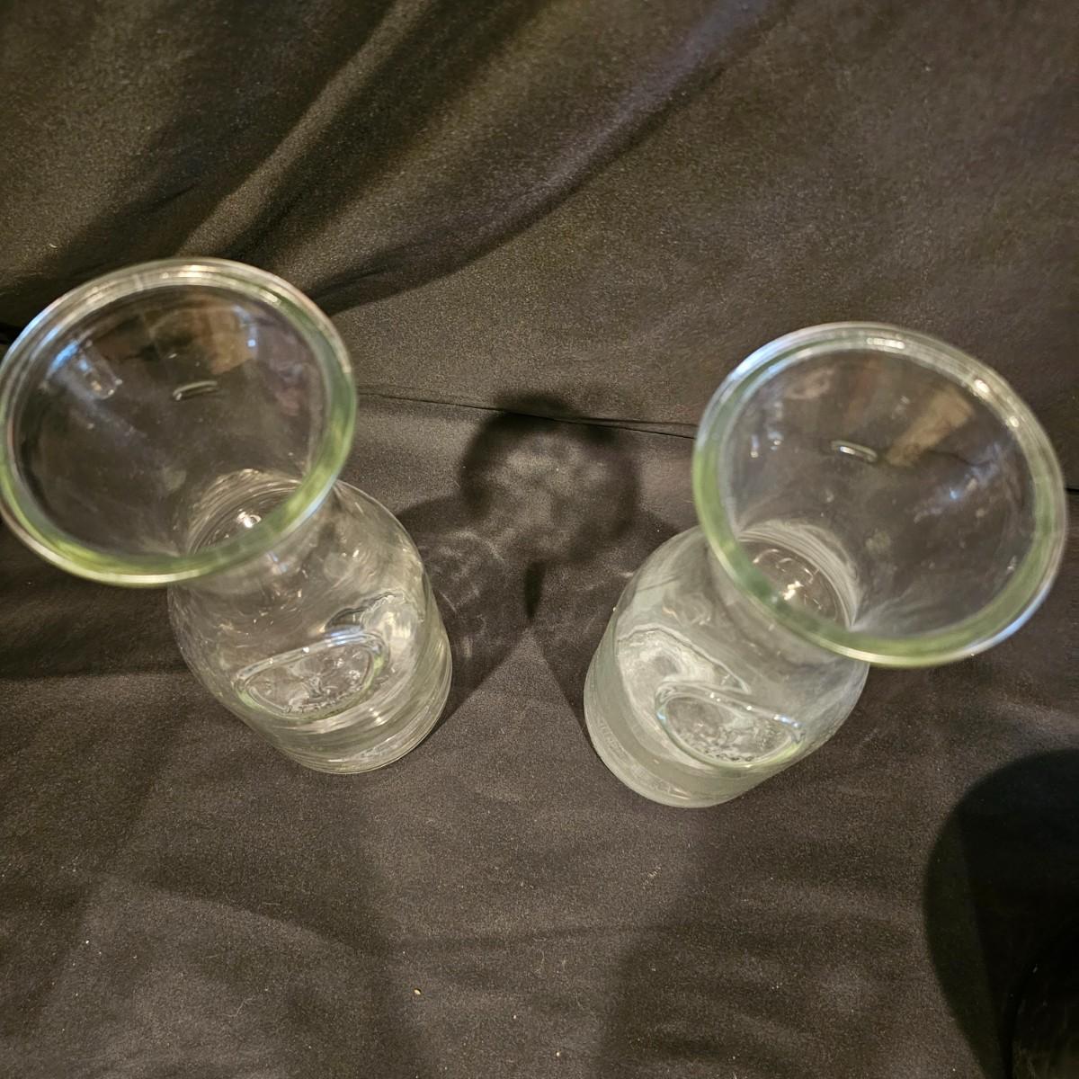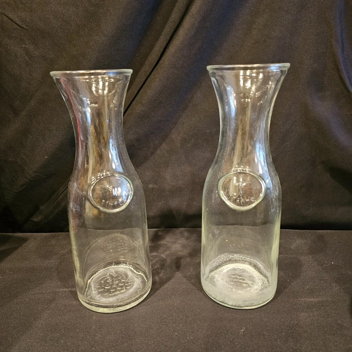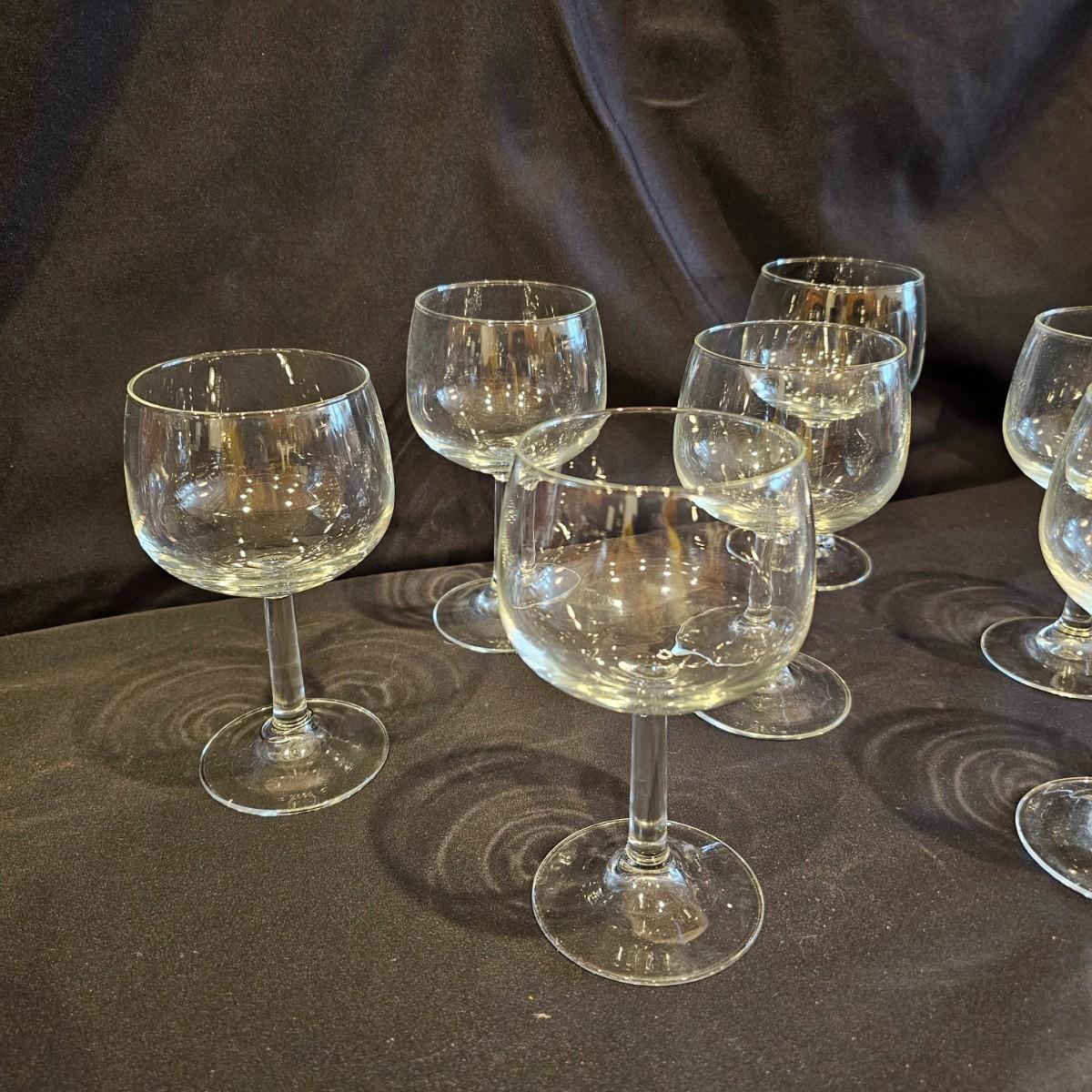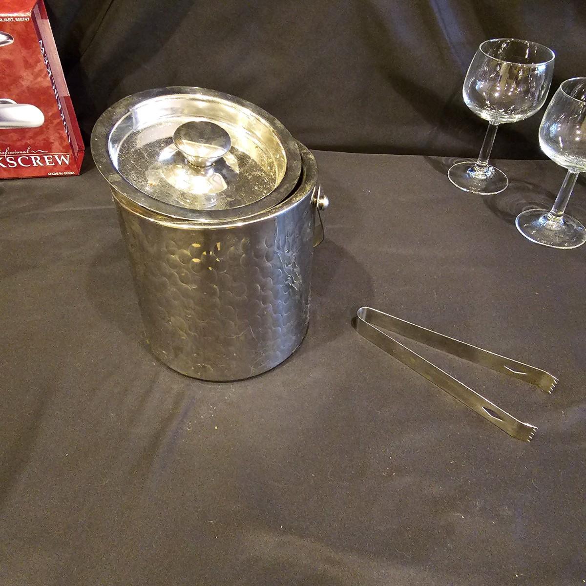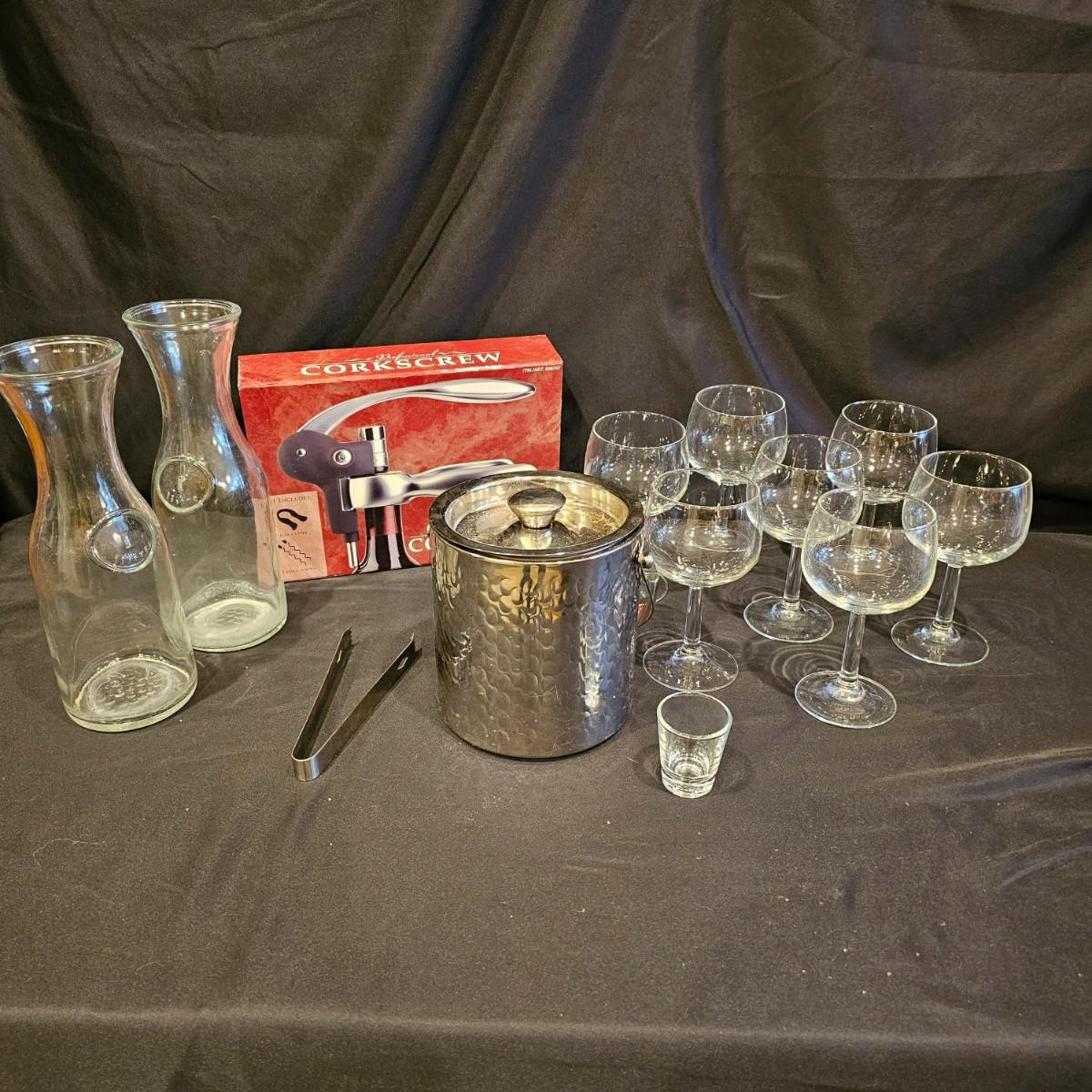 Seven wine glasses, 6.25"H. Two 1 liter wine carafes, 3.75" x 10.5"H. One aluminum ice bucket with tongs, 6.25"D x 7"H. And one professional corkscrew set with two extra screws. Note that the foil cutter piece is missing. Also one shot glass. See photos for details. Shipping available. Shipping can be costly. We suggest contacting our preferred local shipping provider, Postage Express, with dimensions and getting an estimate before bidding: (828) 670-5501 or postageexpress@yahoo.com.