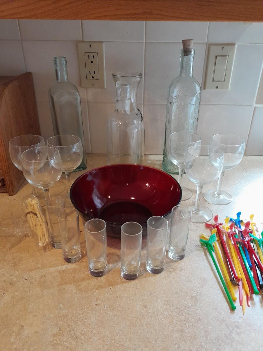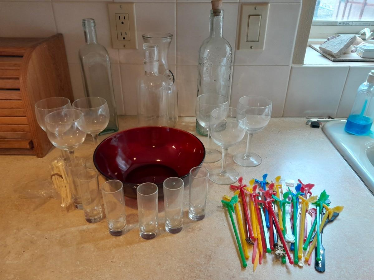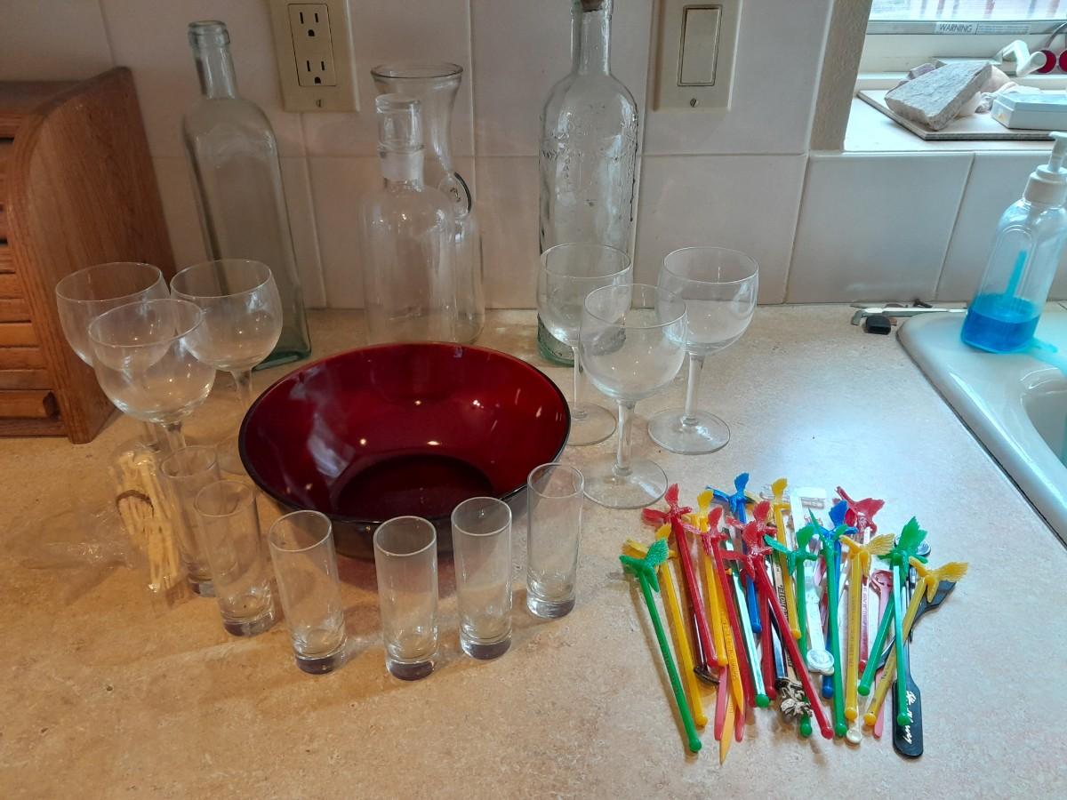 BARWARE GLASSES AND DECANTER SET, OTHER STEMWARE GLASSES, BOTTLES AND SWIZZLE STICKS