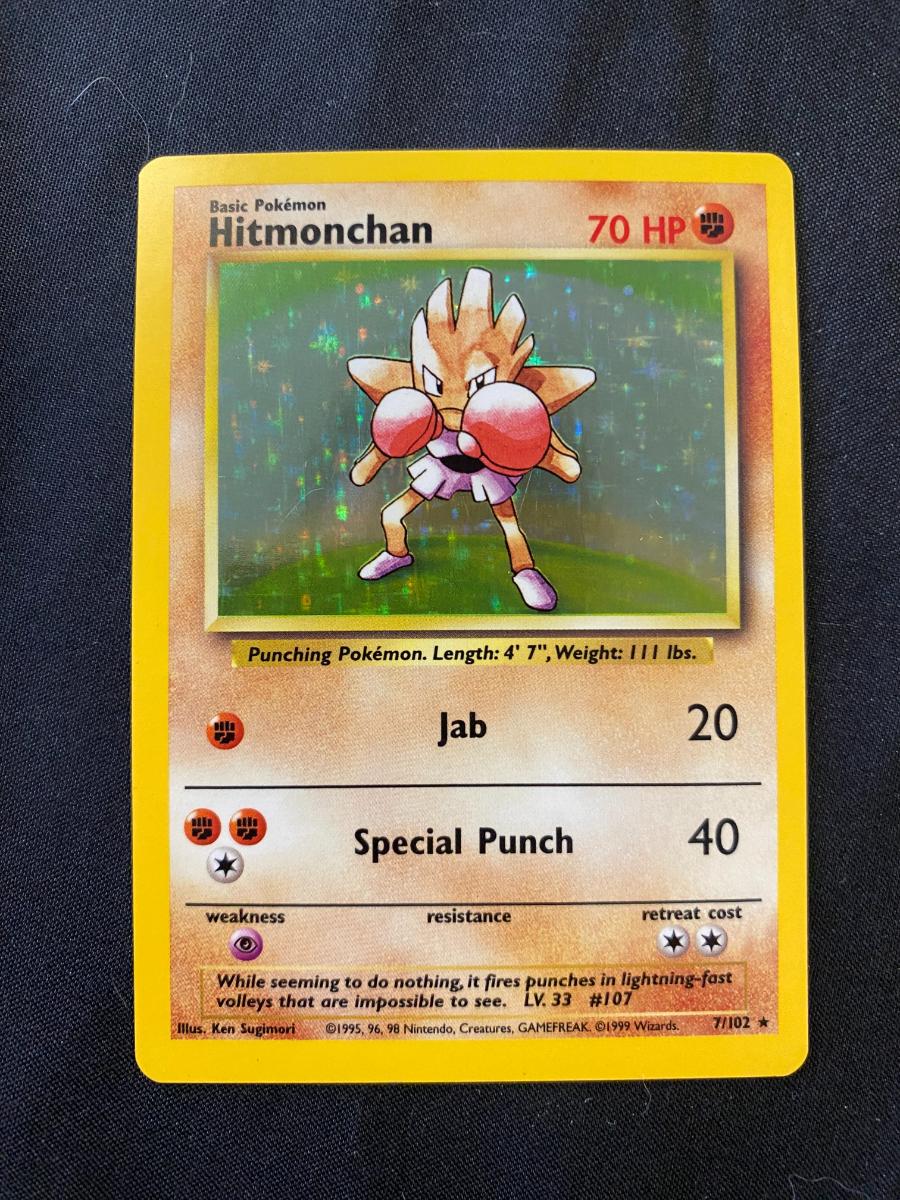 Pokemon TCG Hitmonchan card from the Base Set, numbered 7/102. This is a holographic (holo) card featuring classic artwork. The card is in light play condition, showing mild handling wear. A renowned collectible for enthusiasts of the Base Set series.