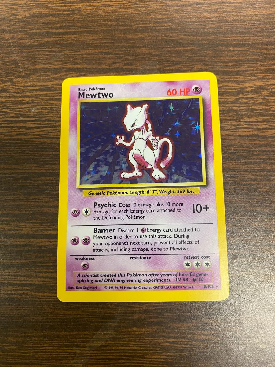 Pokemon Base Set Holo Mewtwo card featuring 60 HP. The card has a condition of light play, with visible handling wear. Displays its distinctive holographic artwork and is identified as part of the original Pokemon Base Set series. A sought-after collectible for enthusiasts.