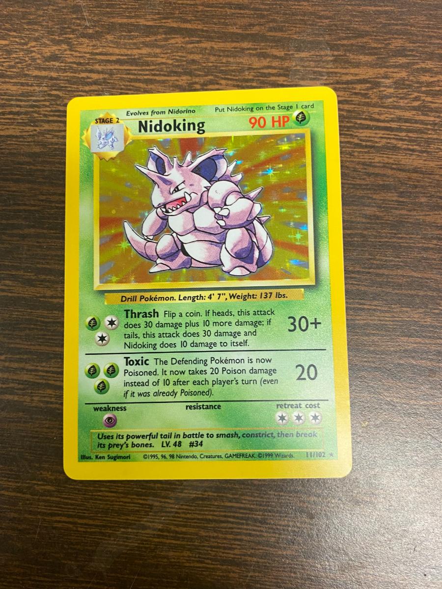 Pokemon Base Set Nidoking card, 90 HP, with a light play condition. Text includes the moves Thrash and Toxic with corresponding effects detailed. Edition is Base Set. Back shows moderate signs of handling. Ideal for collectors or players seeking original Pokemon cards.
