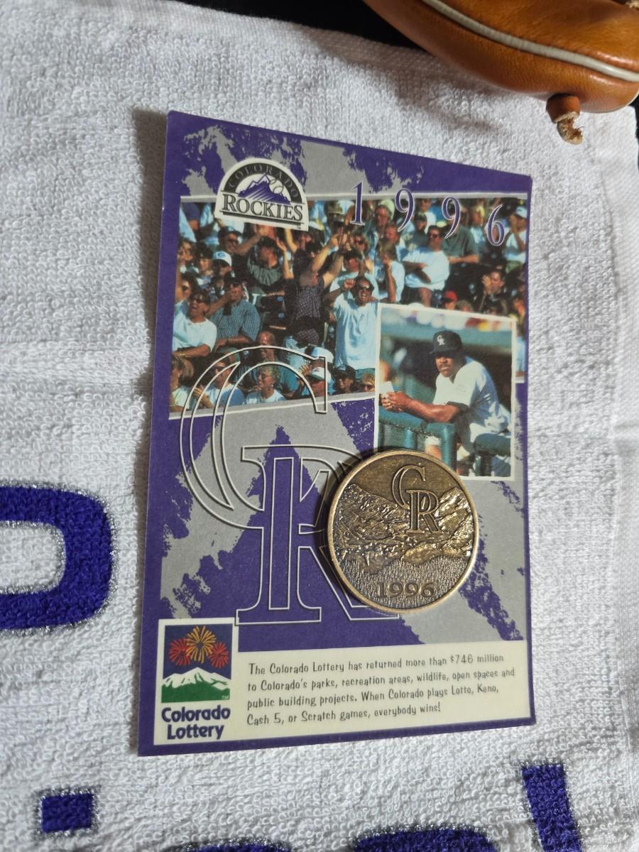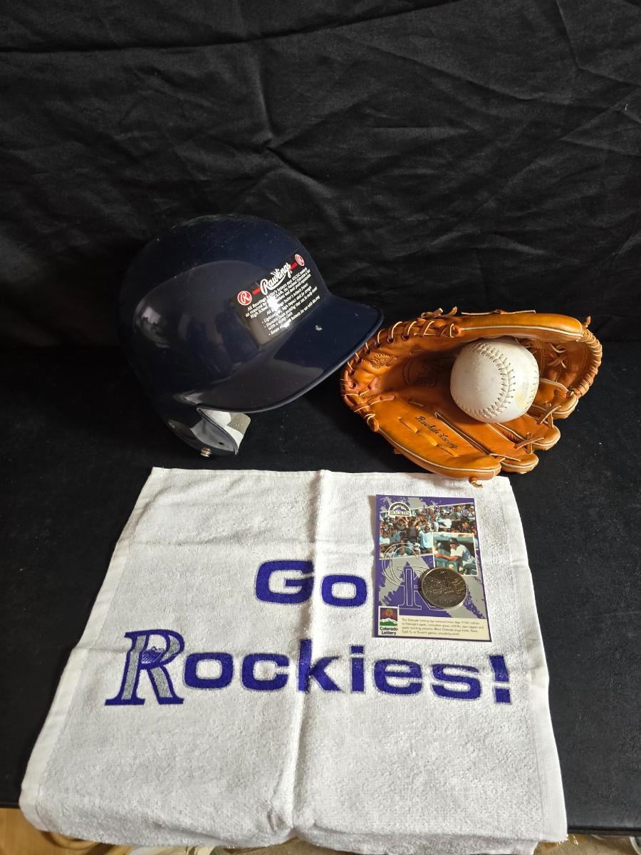 Baseball - brand new Rawlings batter helmet - leather baseball glove with ball and Rockies memorabilia
