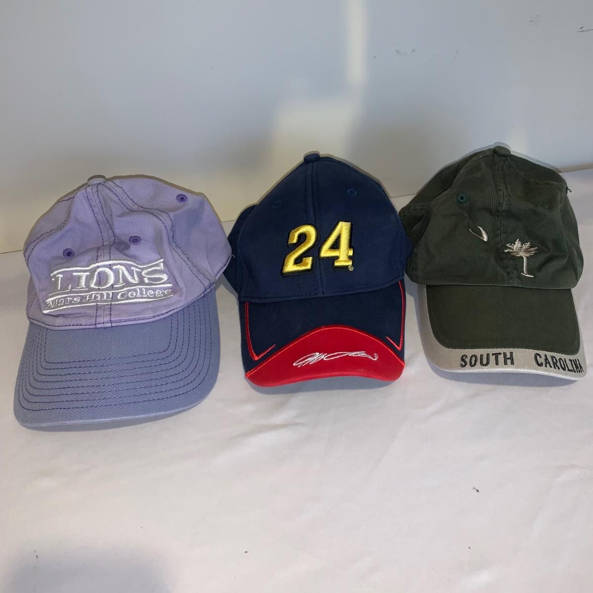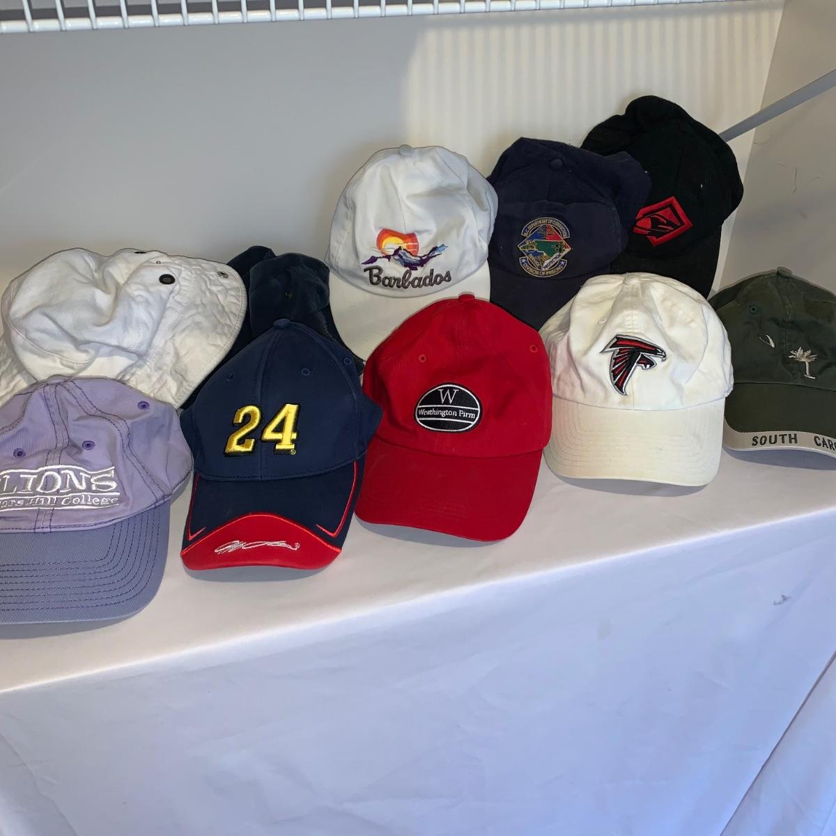 This lot includes 8 baseball caps and 2 bucket hats. Some of the brands included in this lot is Marlboro, Winners Circle, FourtySeven, and more. Some of the hats are a bit worn (see photos). All the caps are one size fits all and the bucket hats have no size but appear to be smaller. The white bucket hat has some slight stains (see photos). The largest cap measures about 10.5in. Shipping available.