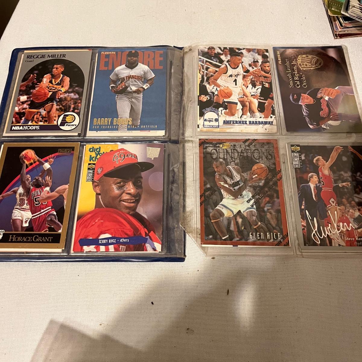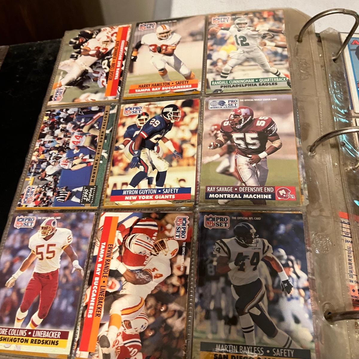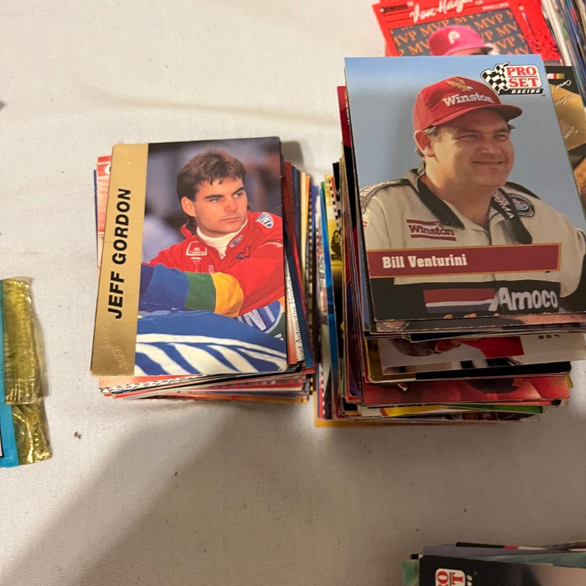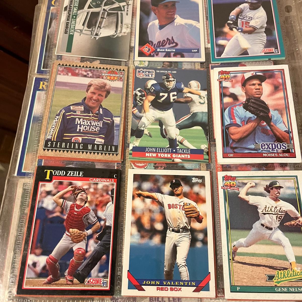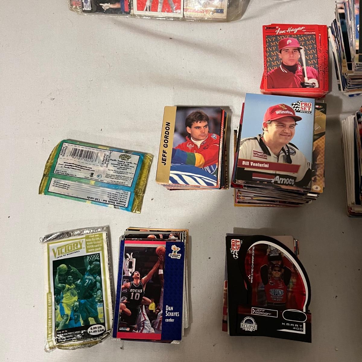 Lot includes a large collection of baseball, football, racing, and basketball cards. Cards appear to be from late eighties and early nineties and are made by Topps, Fleer, Score, Pinnacle and more.