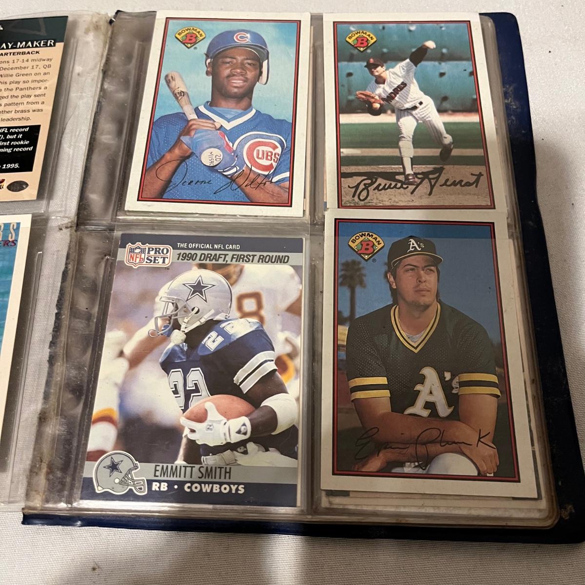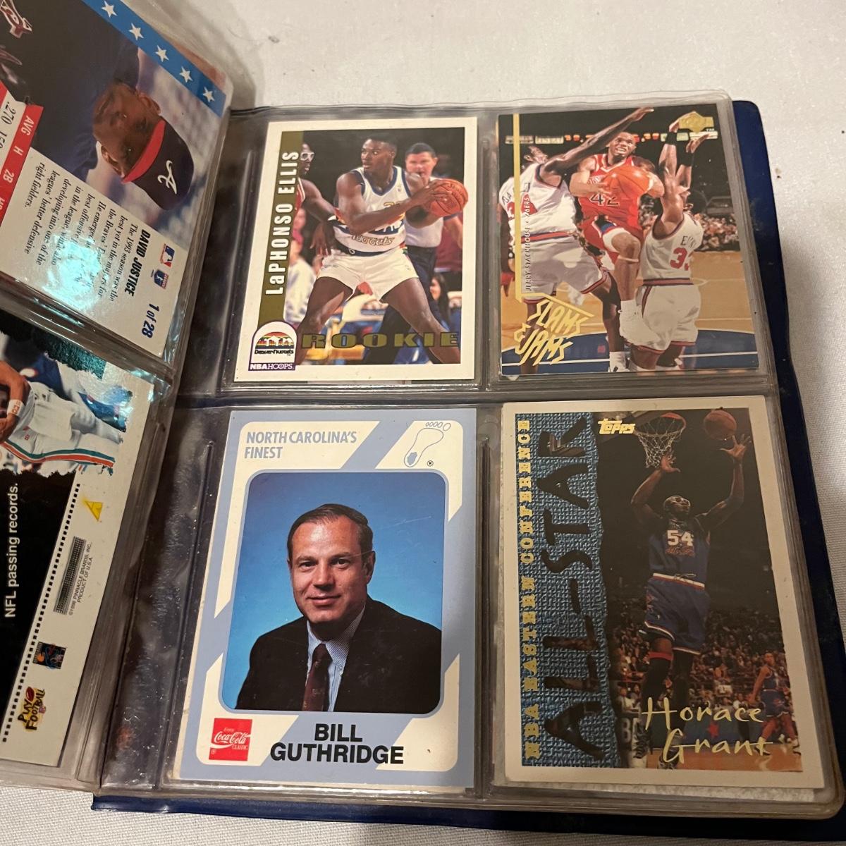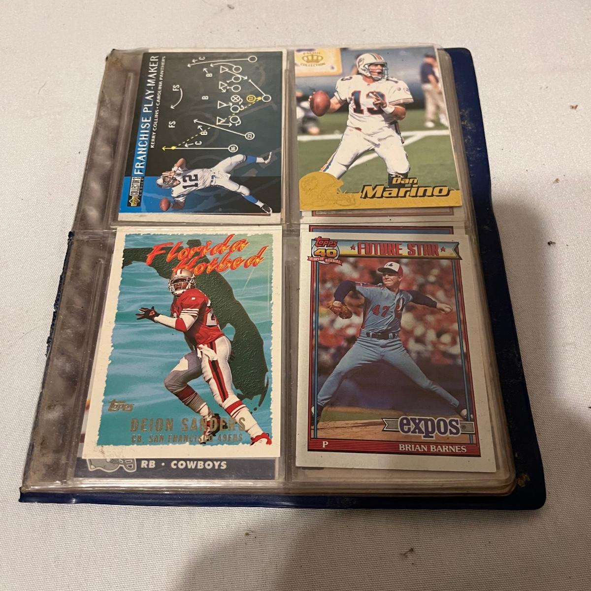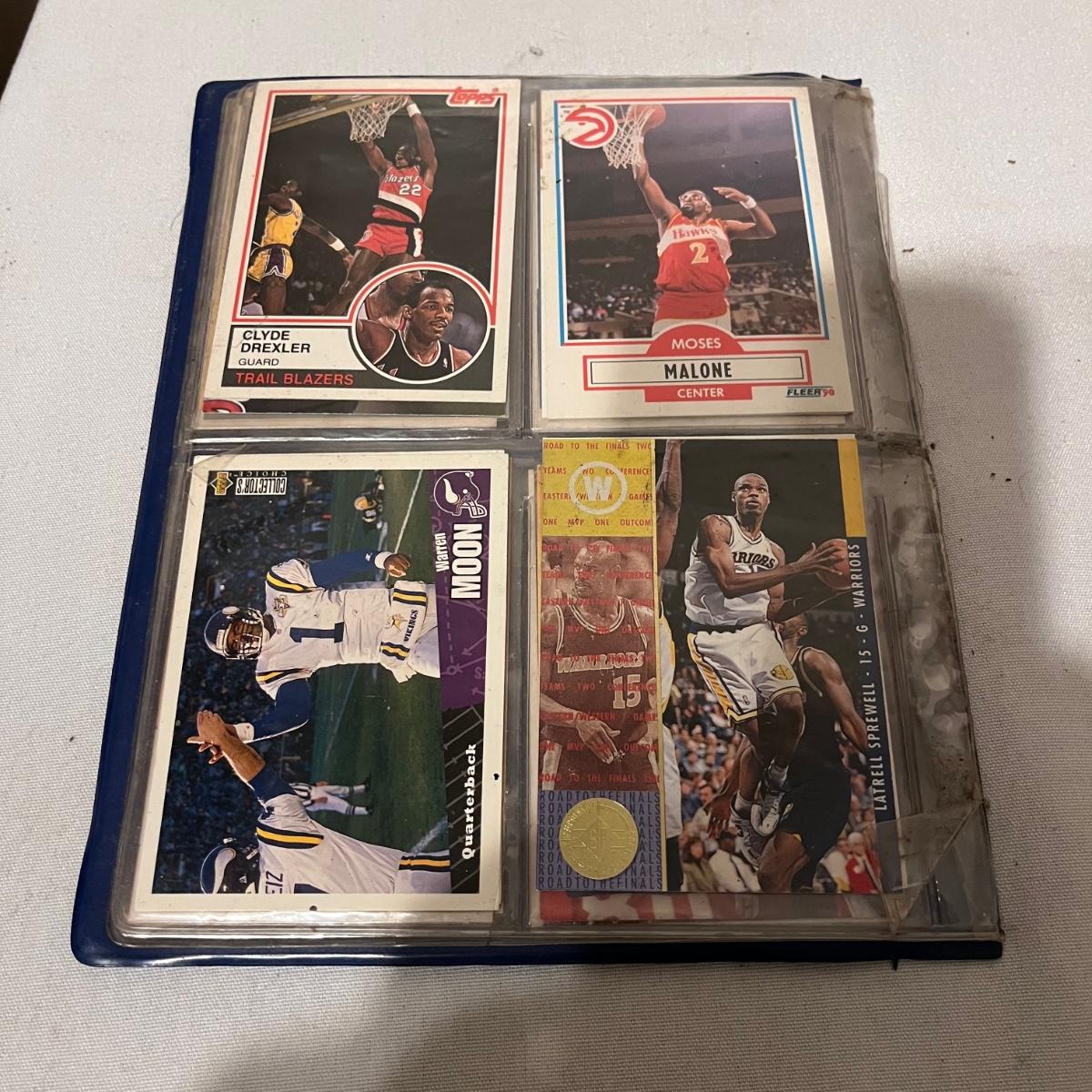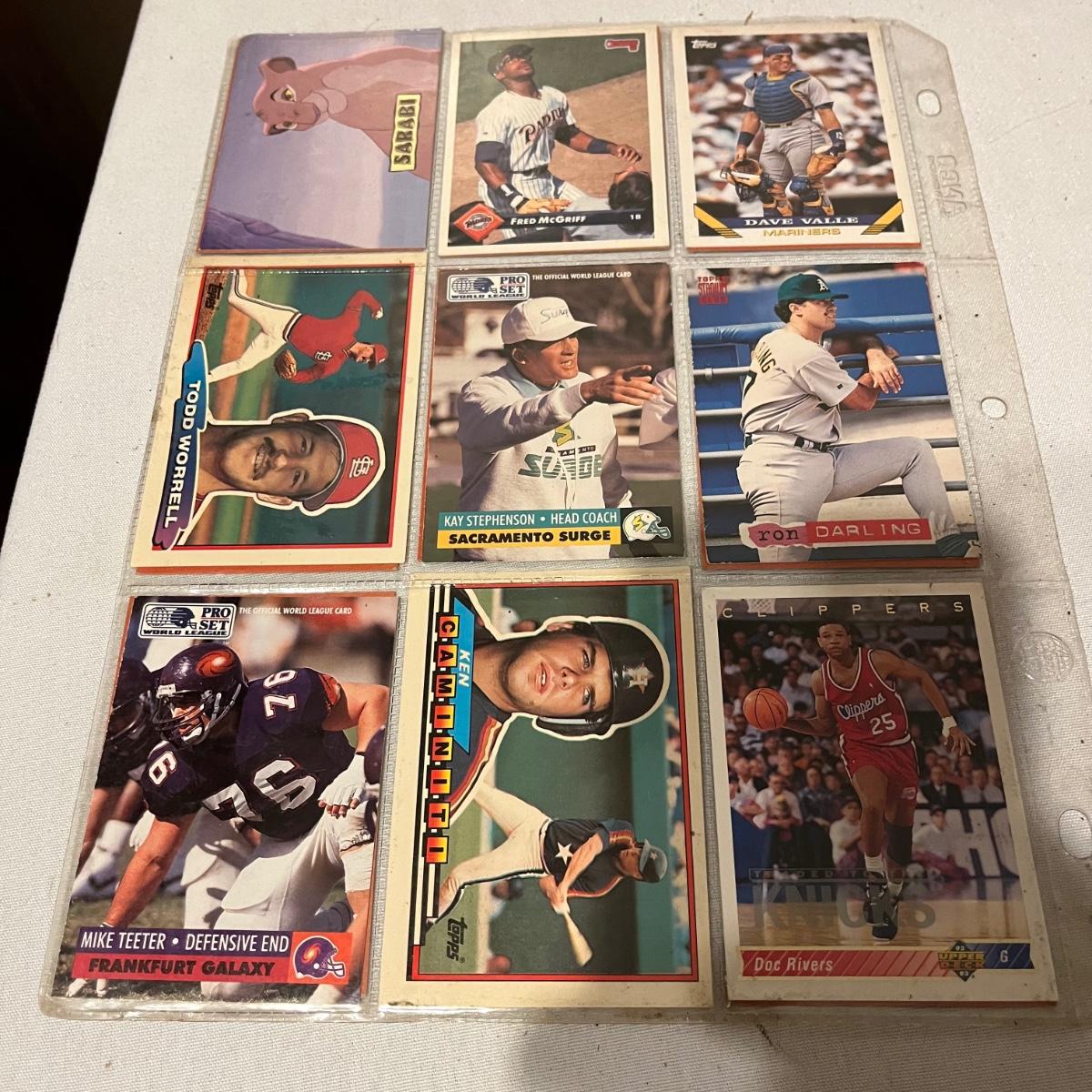 Lot includes a large collection of baseball, football, racing, and basketball cards. Cards appear to be from late eighties and early nineties and are made by Topps, Fleer, Score, Pinnacle and more.