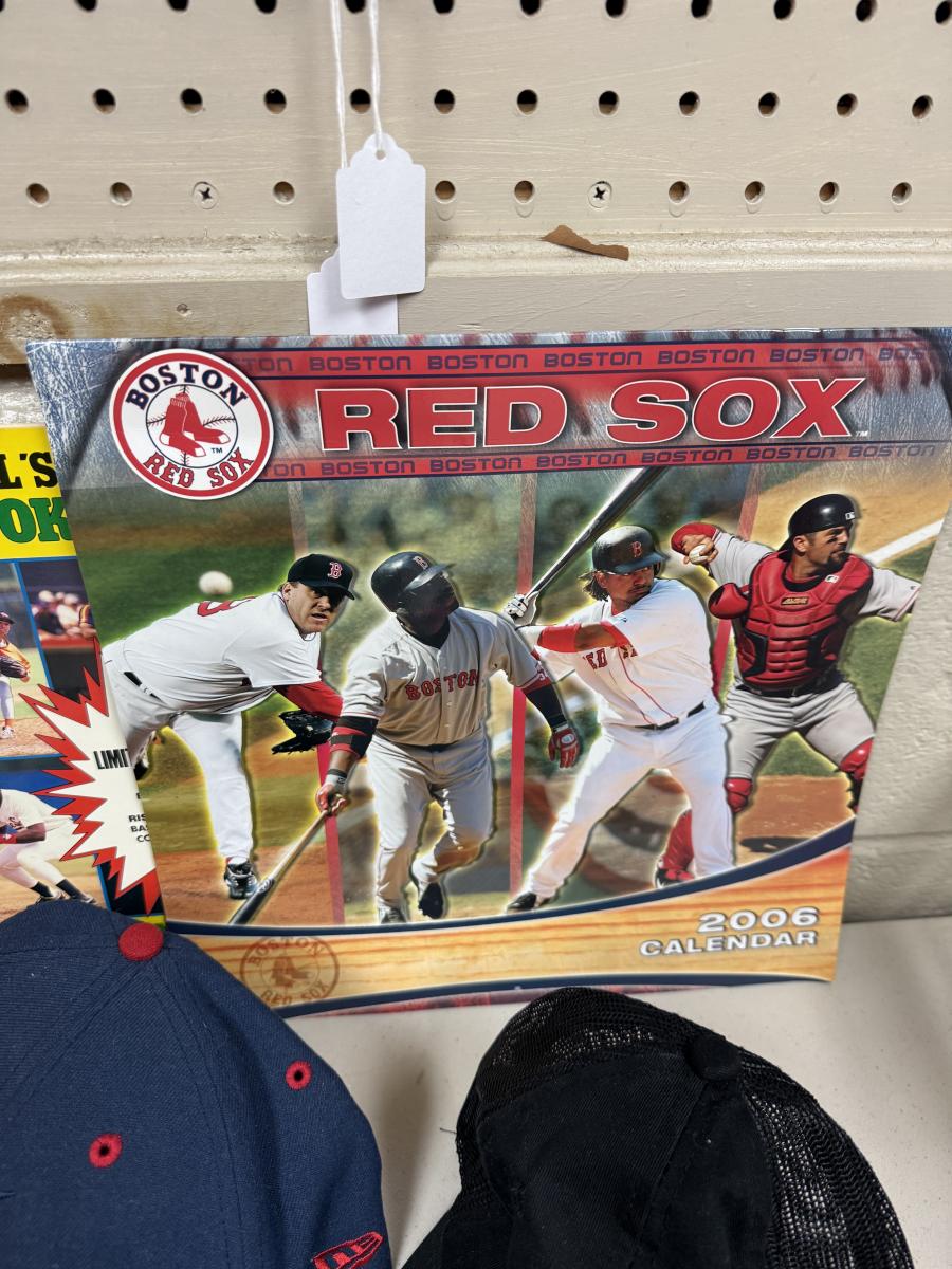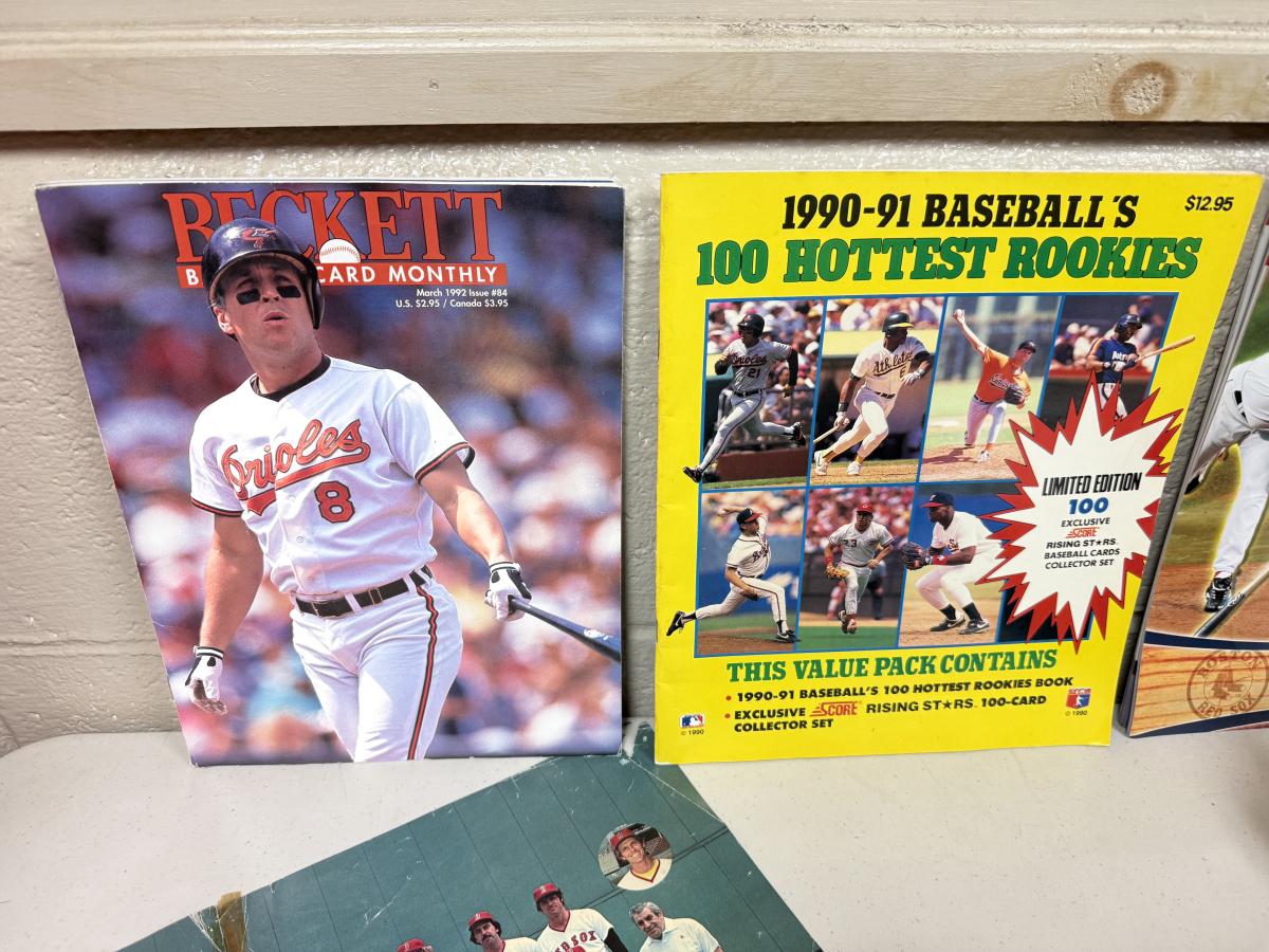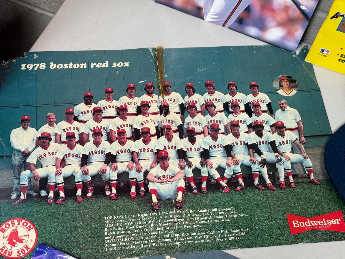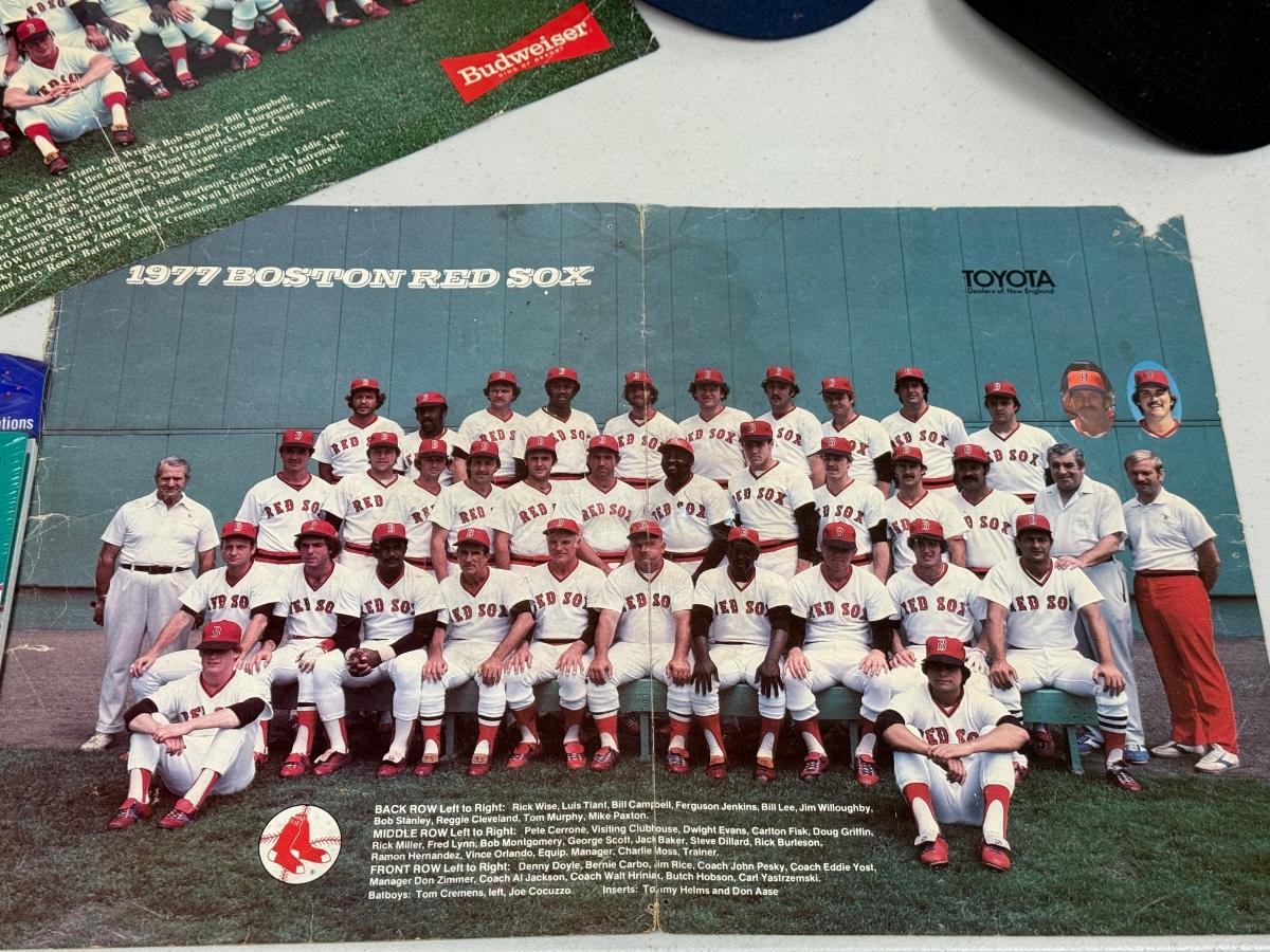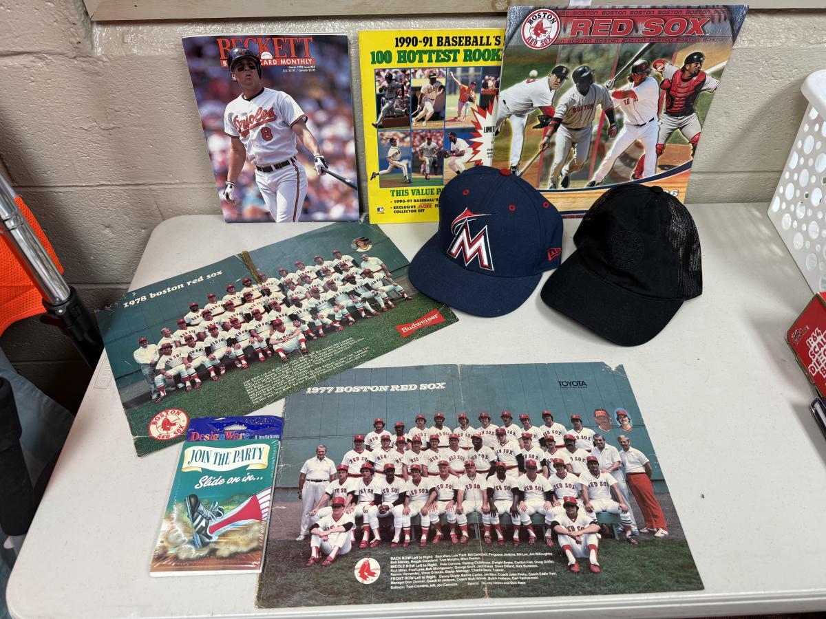 Magazines, vintage centerfold team pictures of RedSox 1977 & 1978, vintage invitations, 1996 calendar, Marlin hat