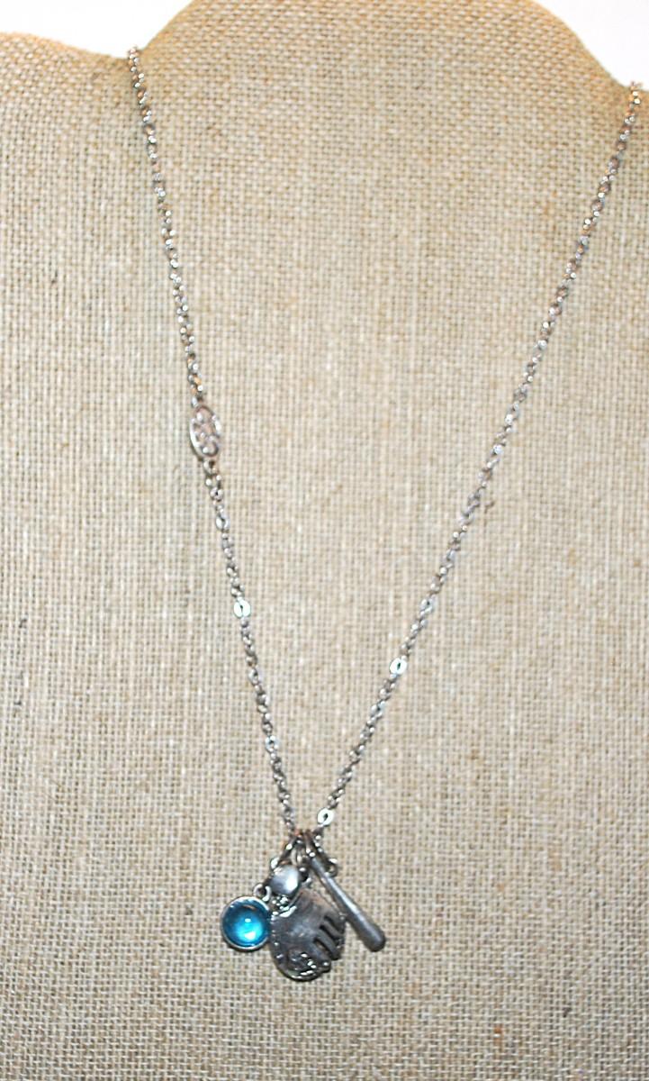 BASEBALL NECKLACE with Glove & Ball, Bat, Heart and Stone Accents on a Silver Tone Necklace Chain 17" L