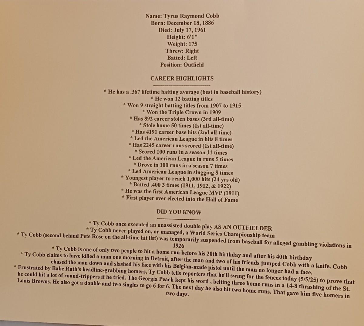 Photo of base player Ty Cobb numbered 367/5000 with signature. Ty has a .367 lifetime batting average (best in baseball history) Born 12/18/1986 died 7/17/1961 refer to fact sheet. Purchase receipt. Professionally framed and matted in high gloss black wood frame. 19" wide 17" hgth