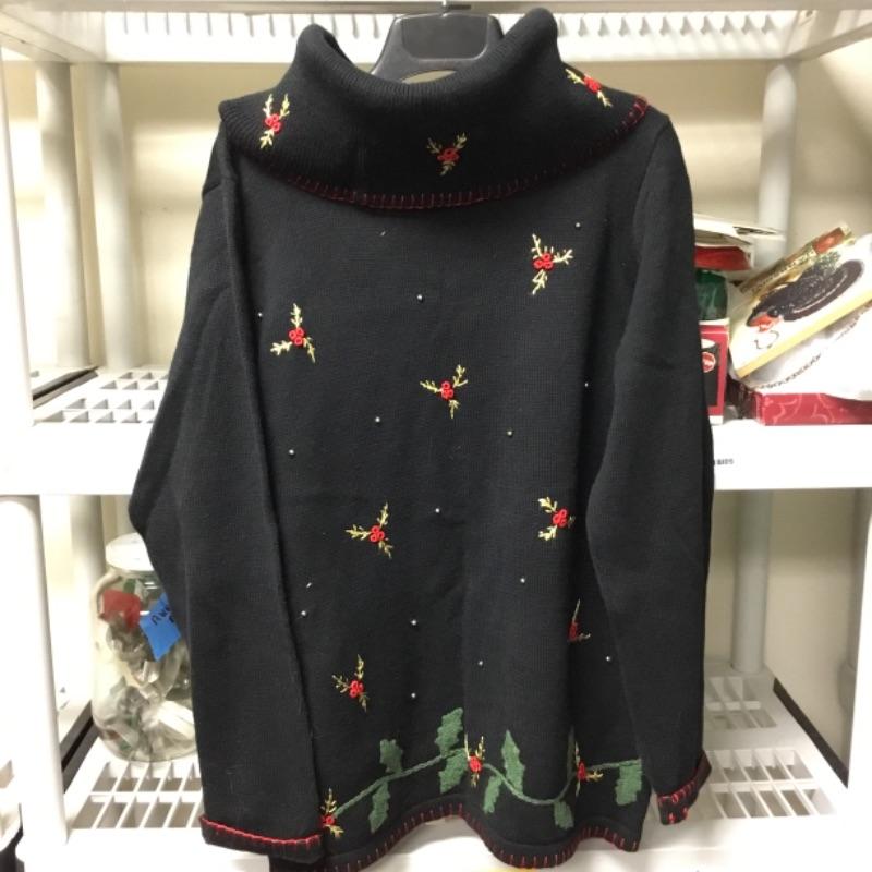 Sweater is in good condition with no visible damage. The designs on the front are a combination of embroidery and beadwork. The neck of the turtleneck is extremely long and wide; see pictures.