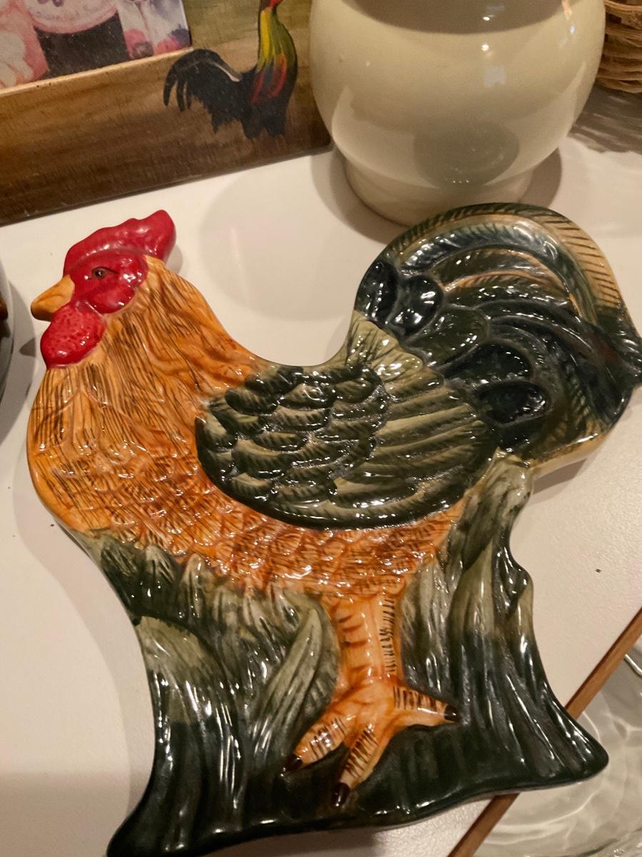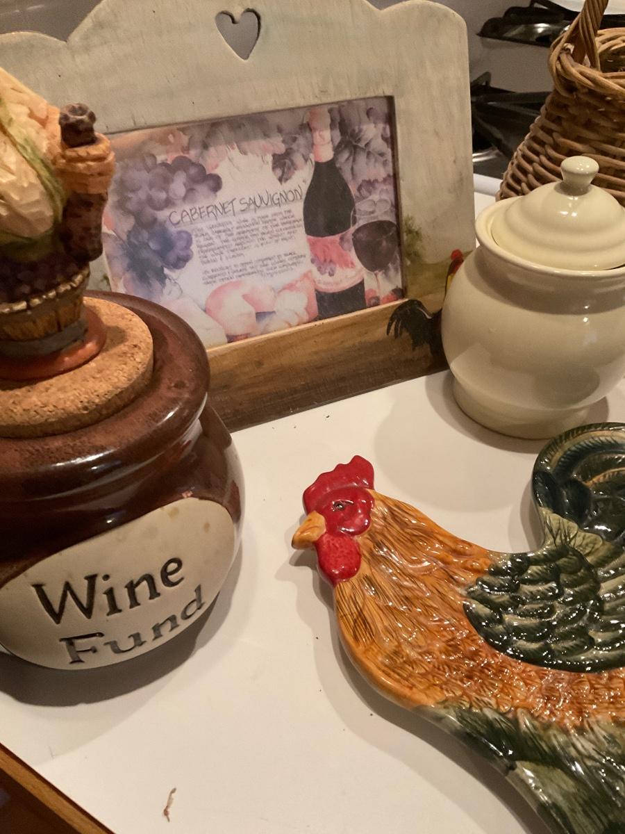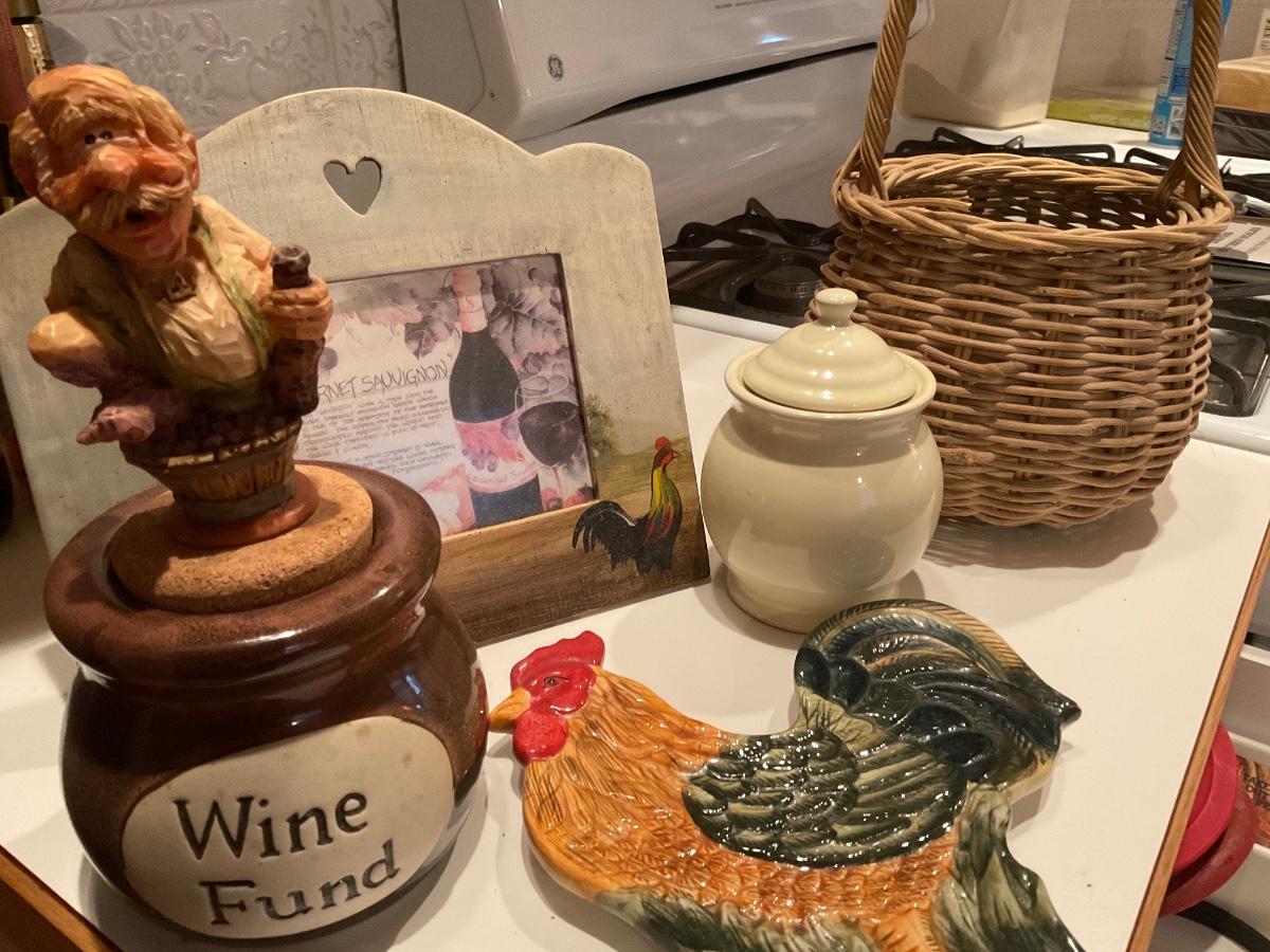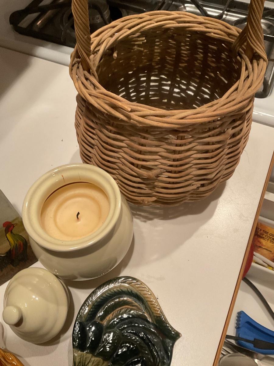 Basket, Candle, Wine Fund, Picture Frame and Ceramic Rooster..