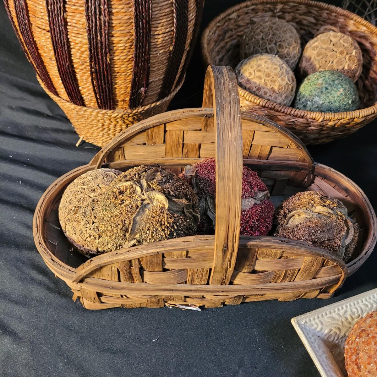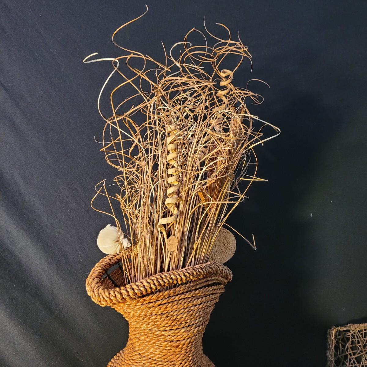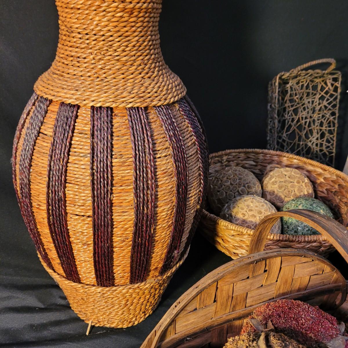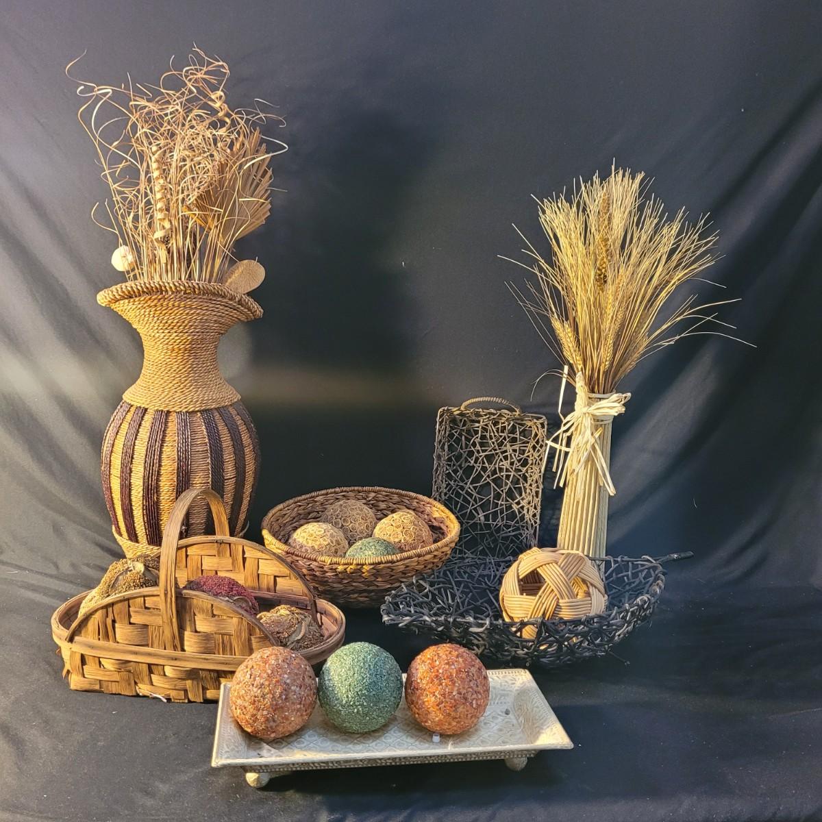 This lovely assortment of home decor includes woven baskets and vases, decorative dried flora and pebble balls, and dried grass arrangements. Large vase measures approximately 10” x 21”H. Shipping available.