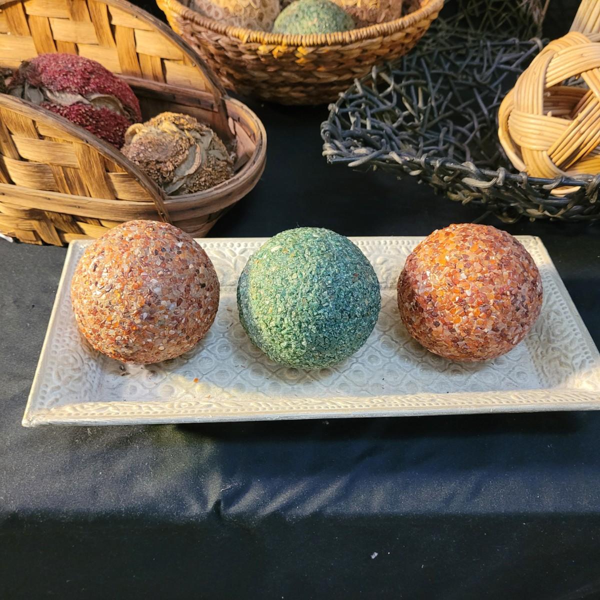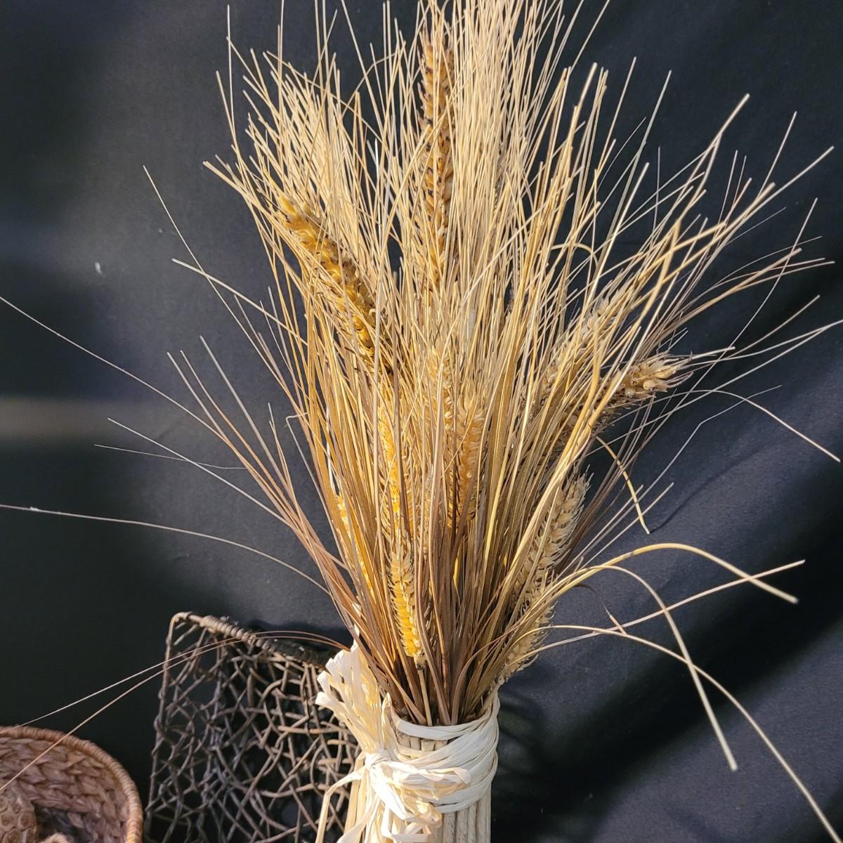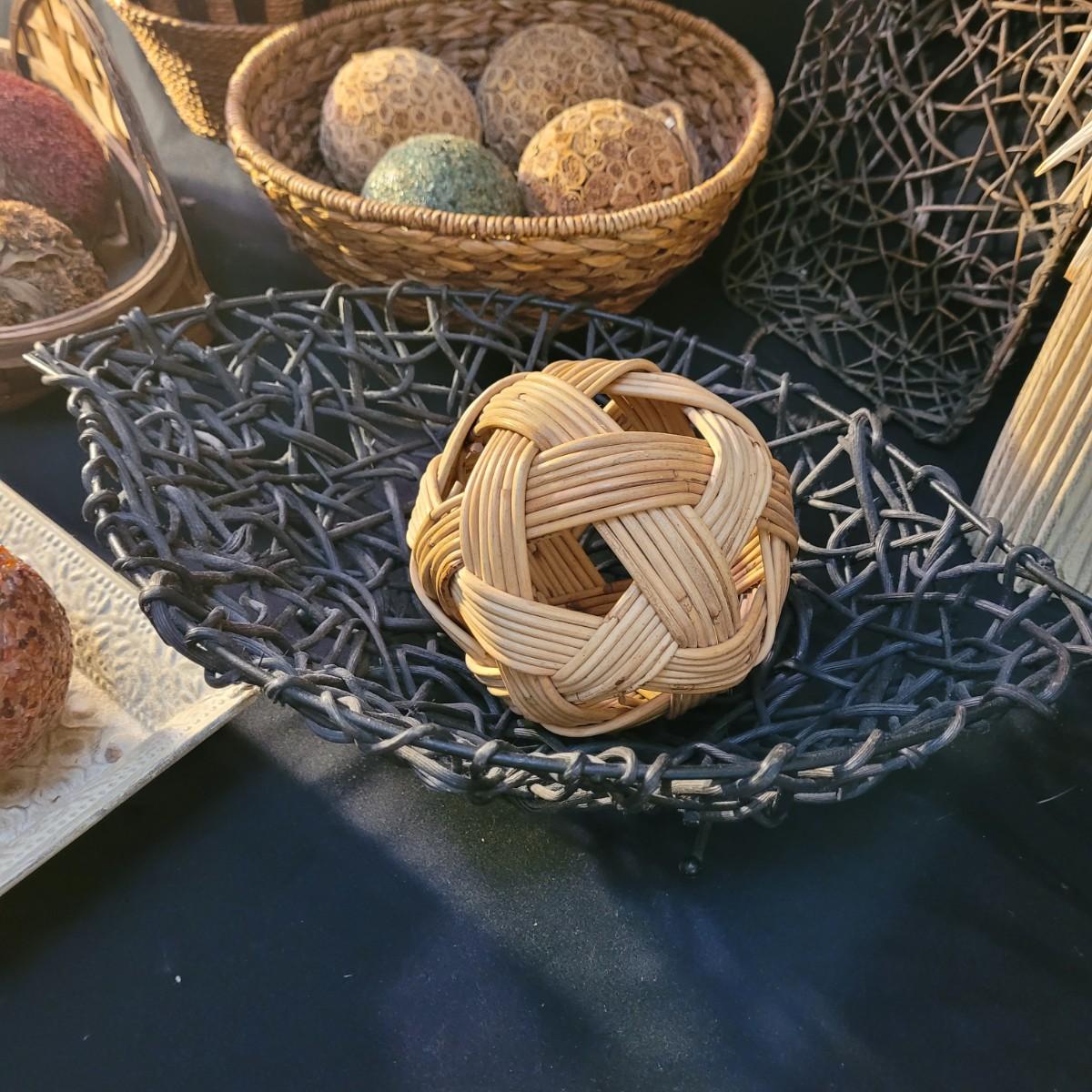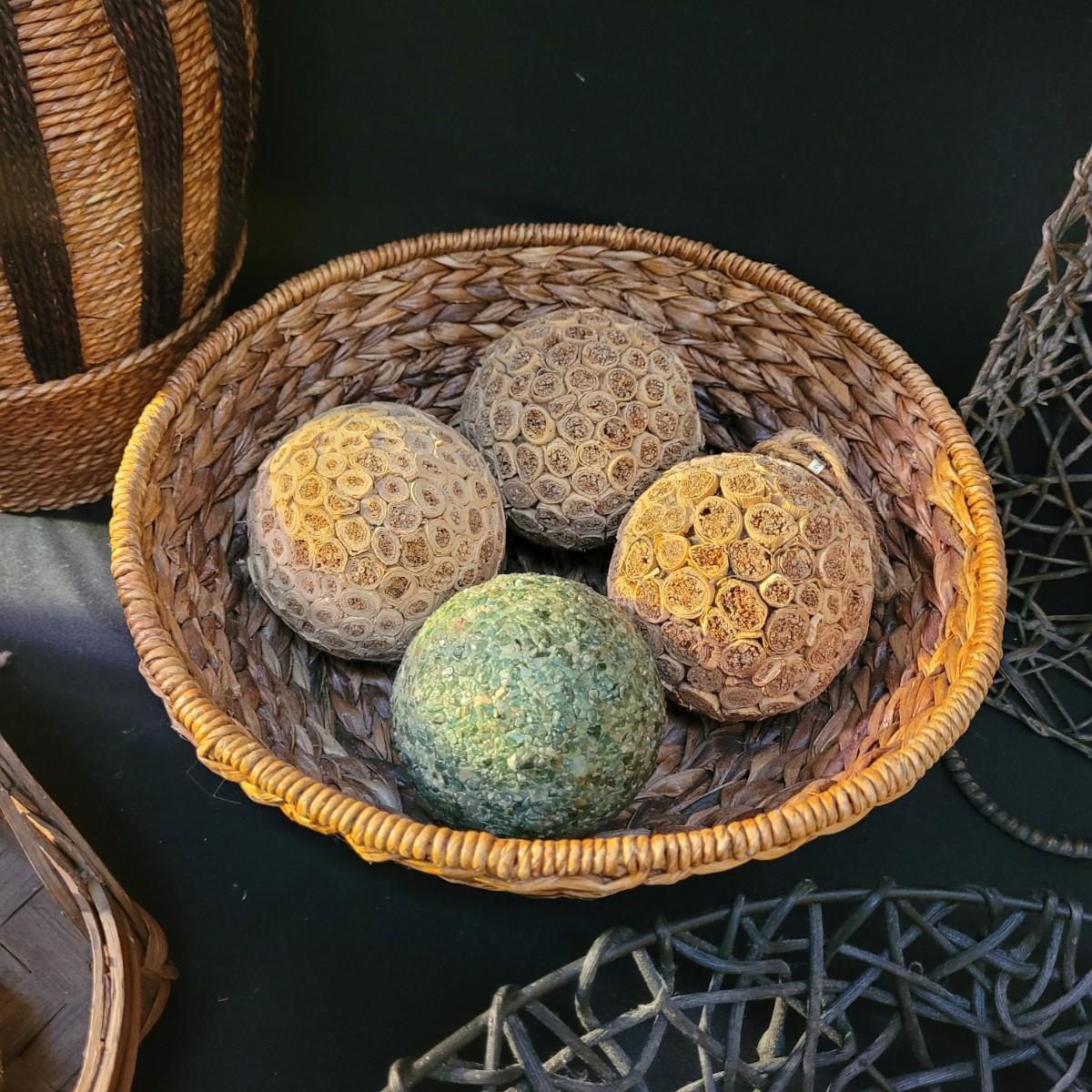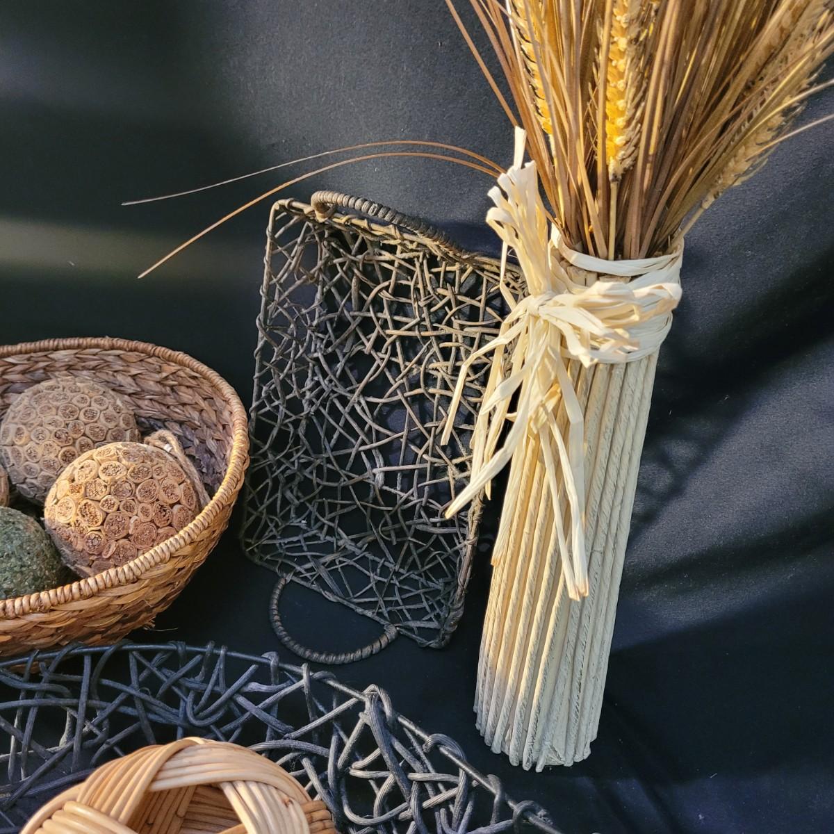 This lovely assortment of home decor includes woven baskets and vases, decorative dried flora and pebble balls, and dried grass arrangements. Large vase measures approximately 10” x 21”H. Shipping available.