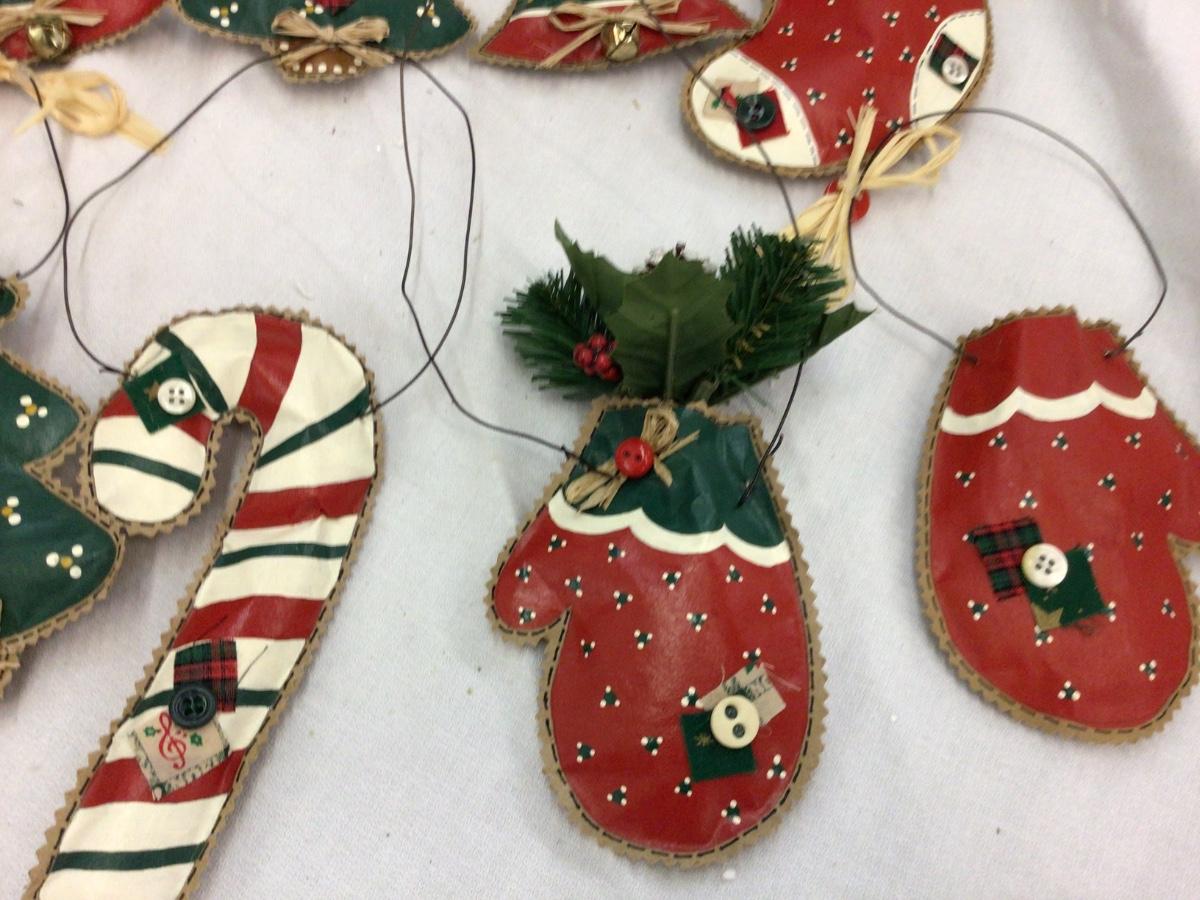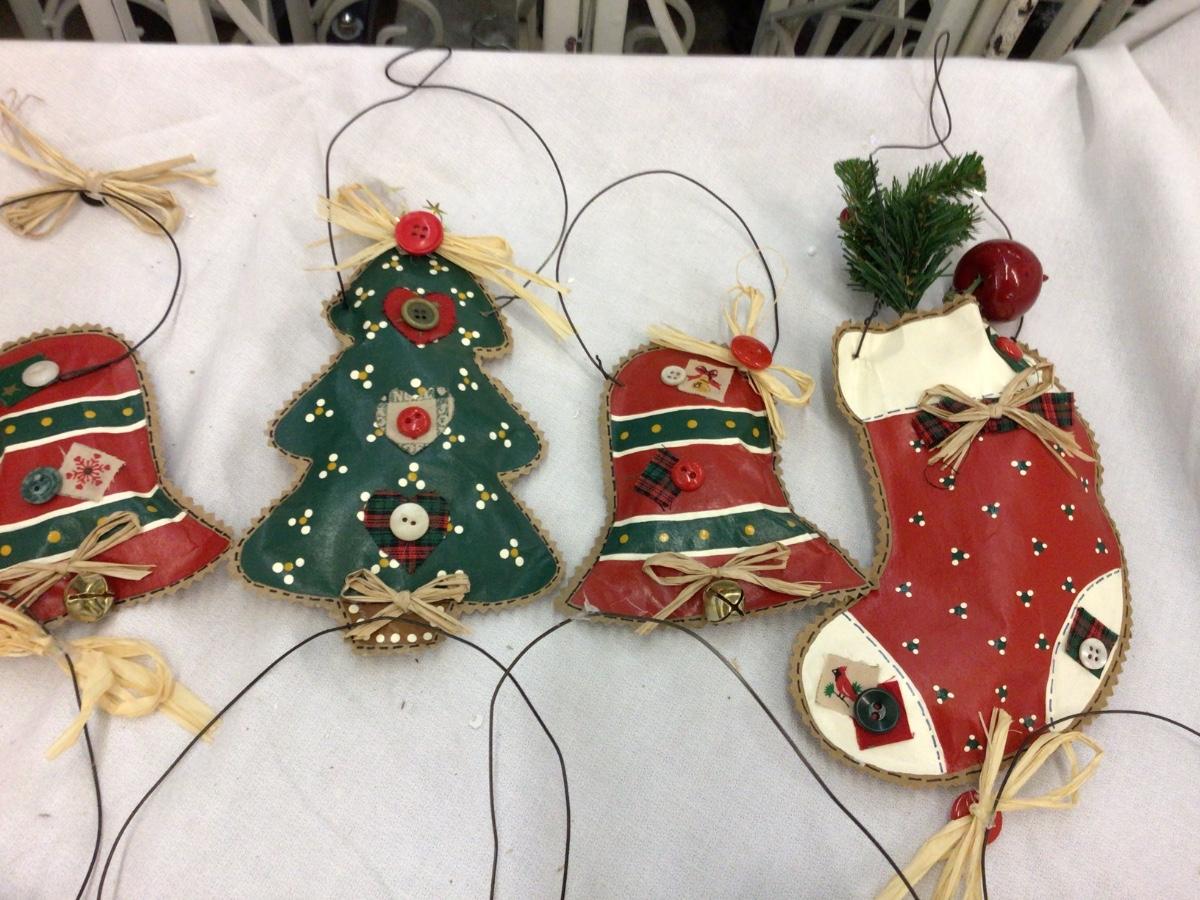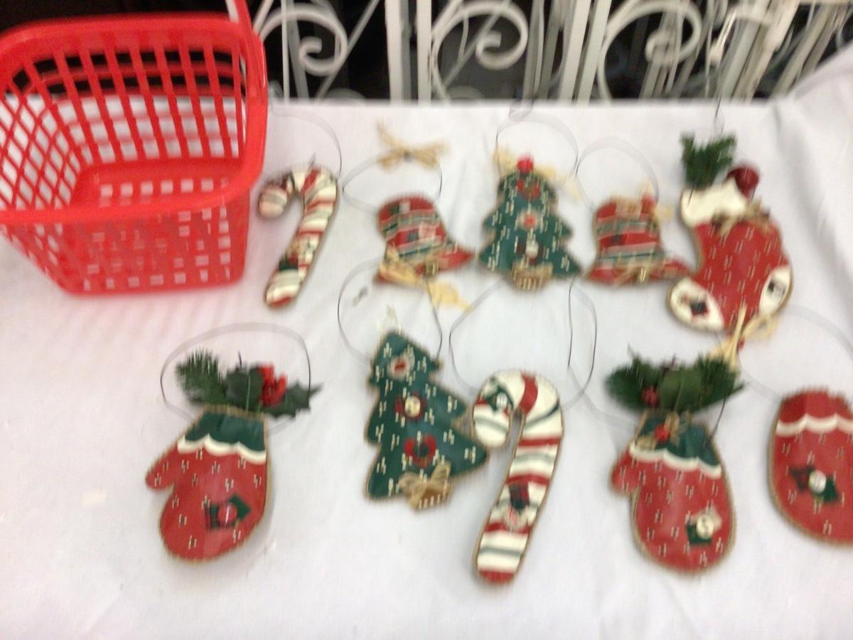 You get 10 vinyl Christmas ornaments. There are two trees, two mittens, two candy canes, two bells, and one stocking.