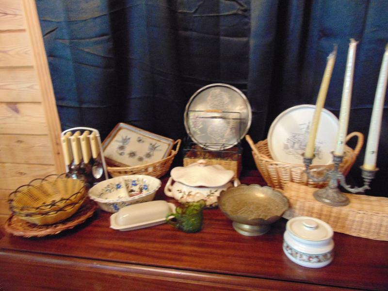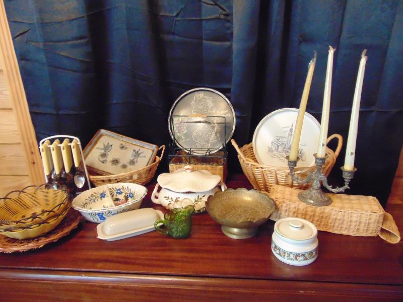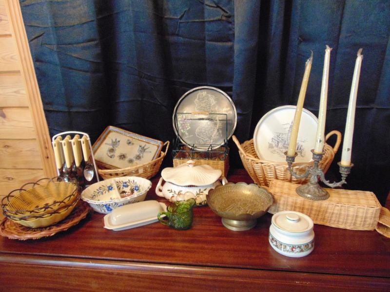 Baskets, Brass Dish,Collectible metal trays, Soup Tureen with mushroom design, brown Butter dish and floral bowl have some chips silverware