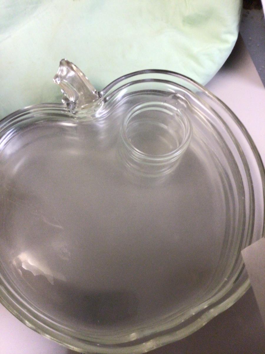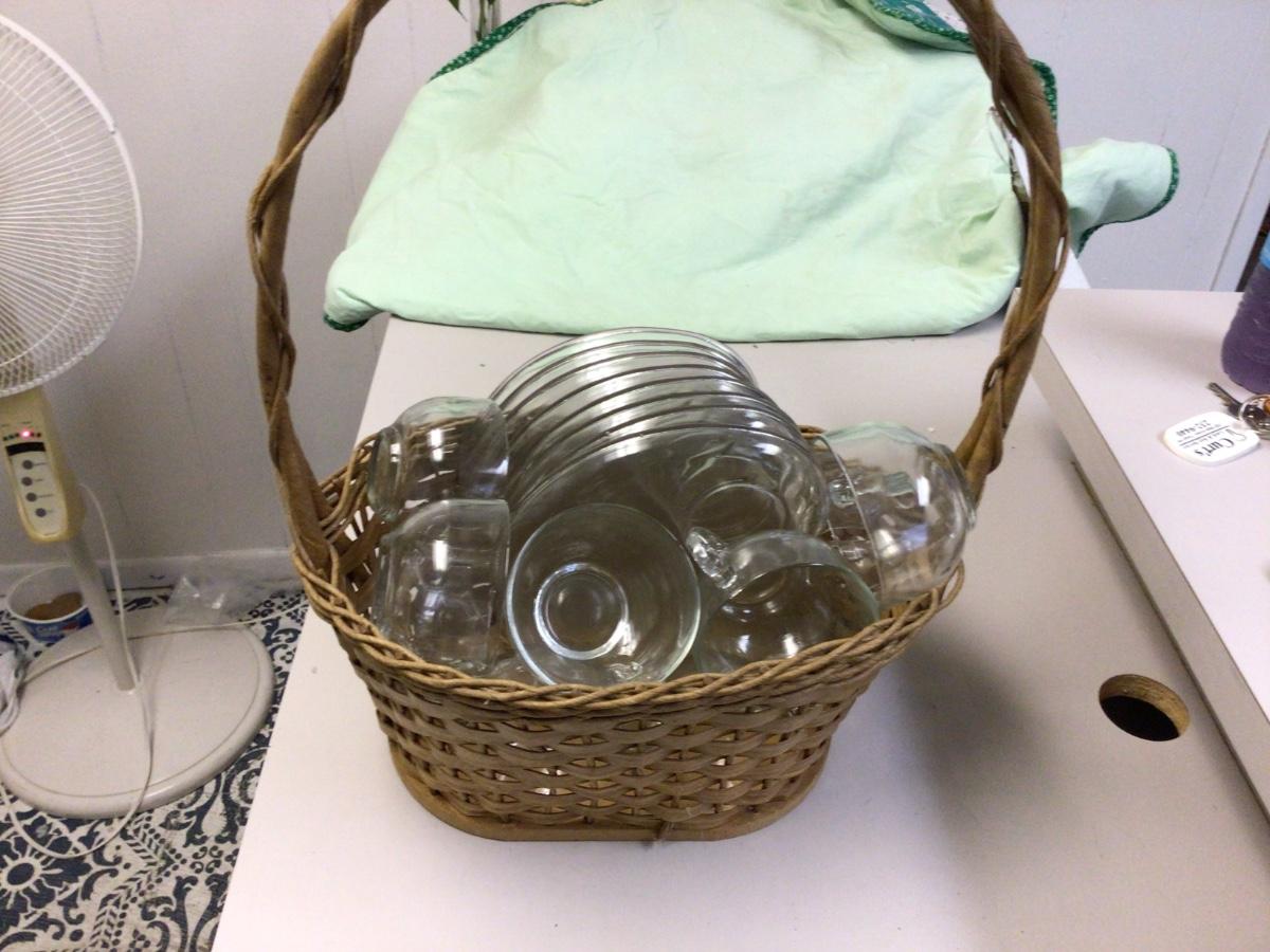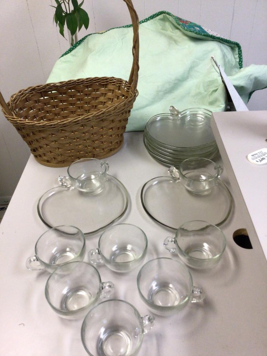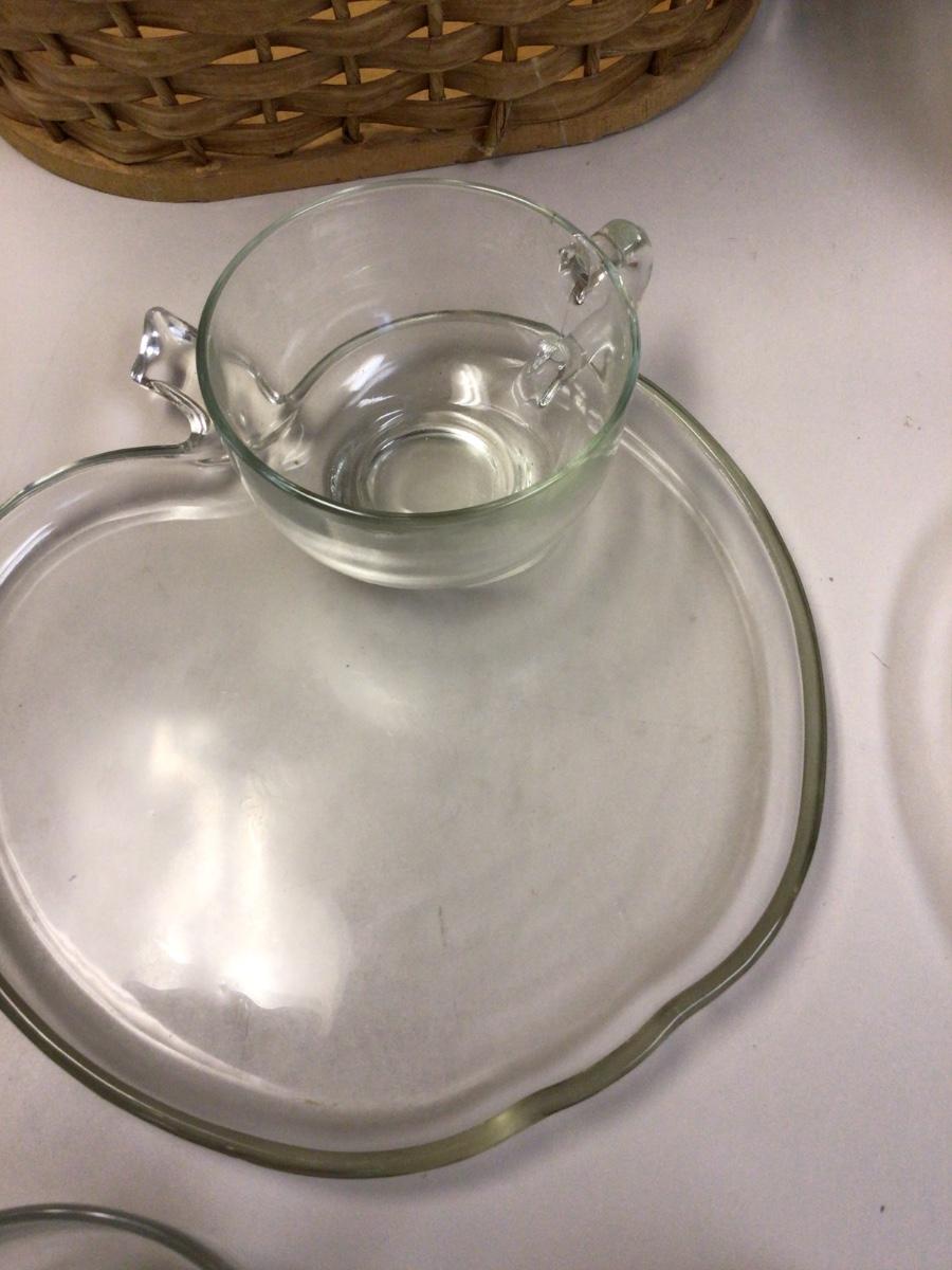 Great set of snack trays and coffee cup. Clear glass in good condition and you get the basket as well.