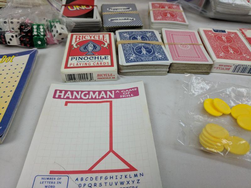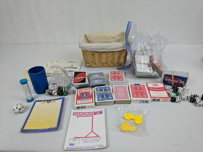 Basket of Cards & Dice Games, Uno, Phase 10, Flash Cards, Dot to Dot Pad, Etc.