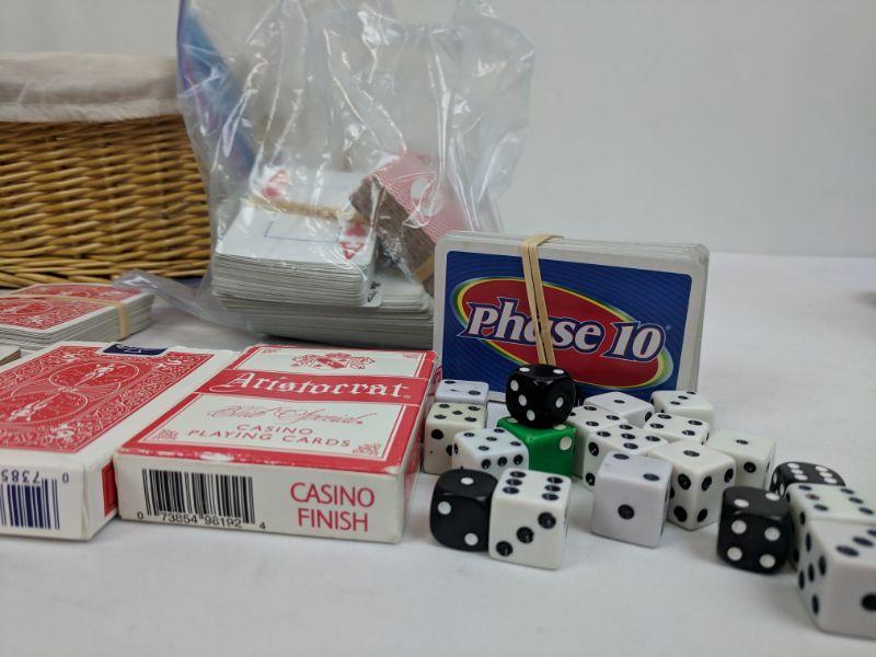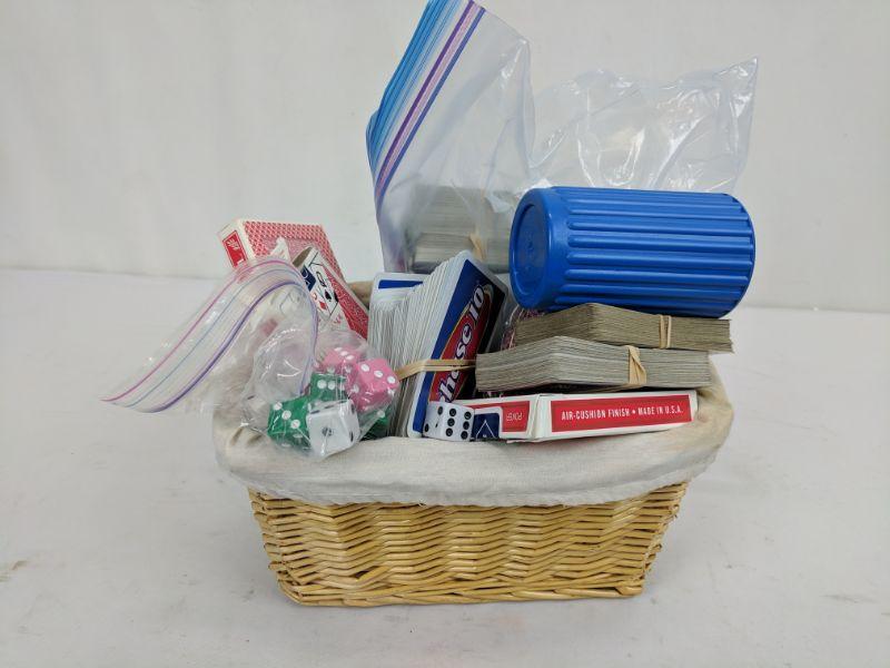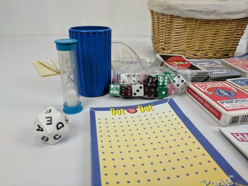 Basket of Cards & Dice Games, Includes: Uno, Phase 10, Flash Cards, Dot to Dot Pad, Etc.