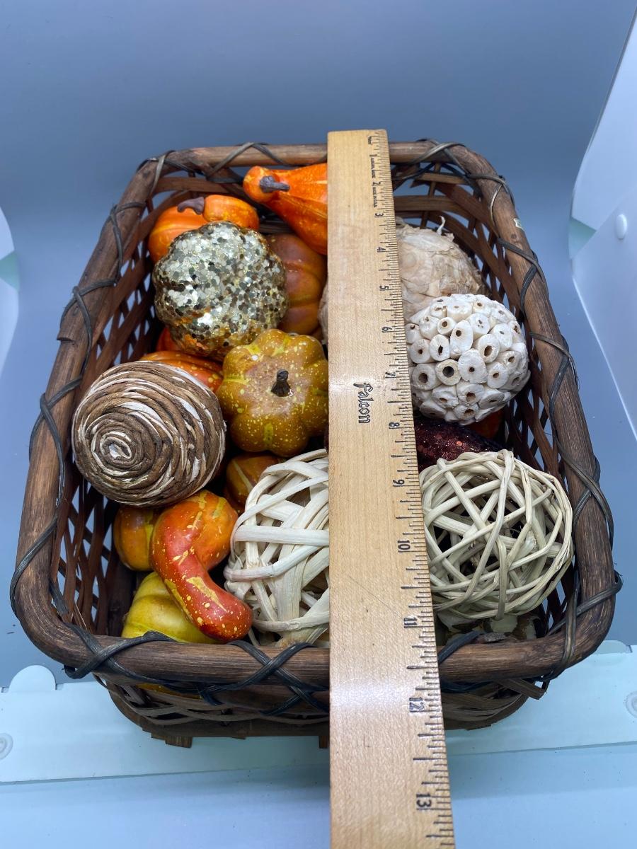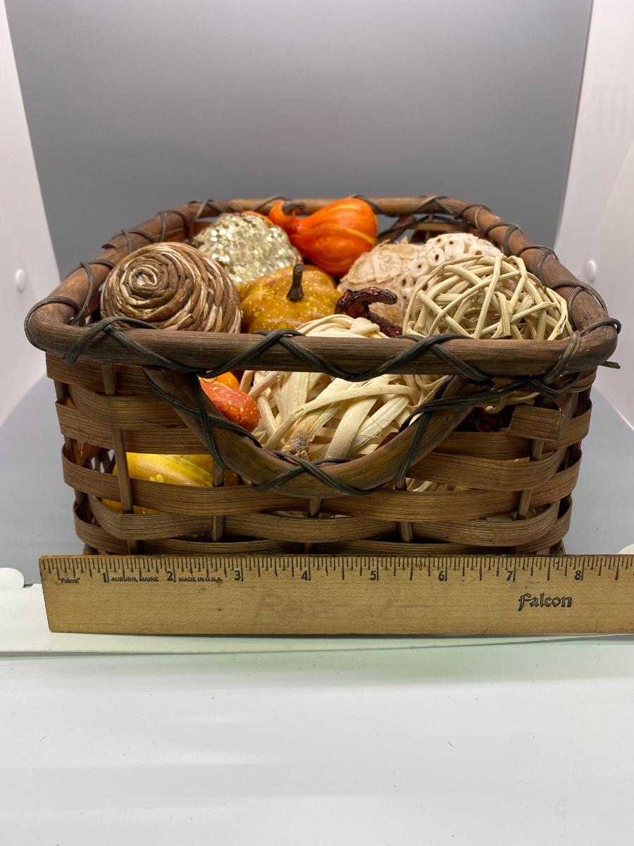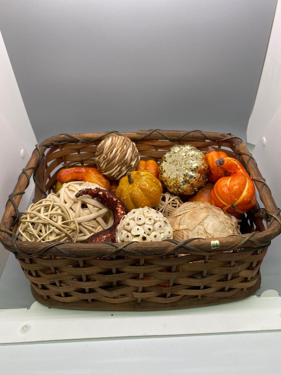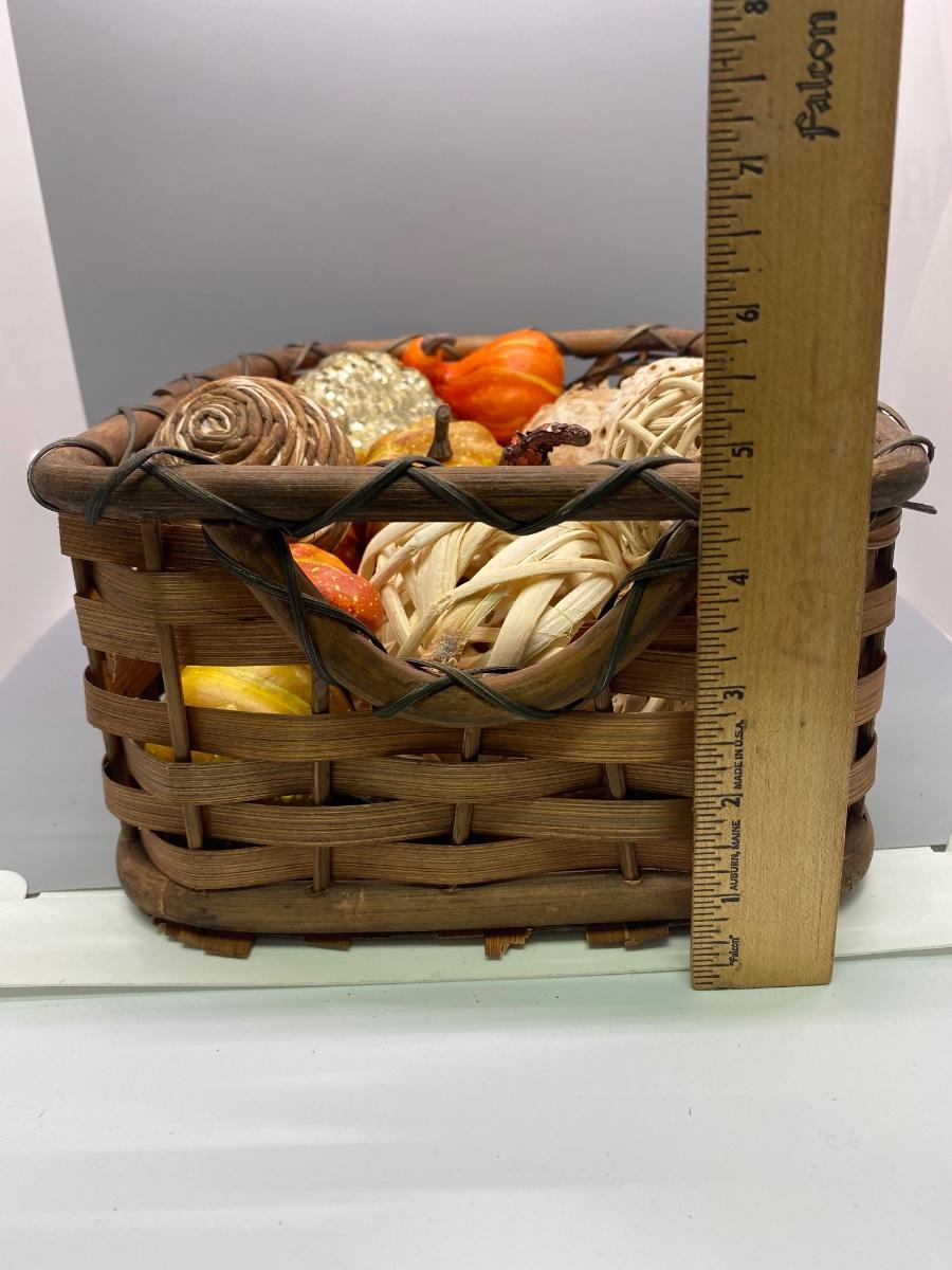 Small rectangular basket filled with various natural fiber and artificial Autumn seasonal decor items. Basket is almost 12" length and 5" deep.