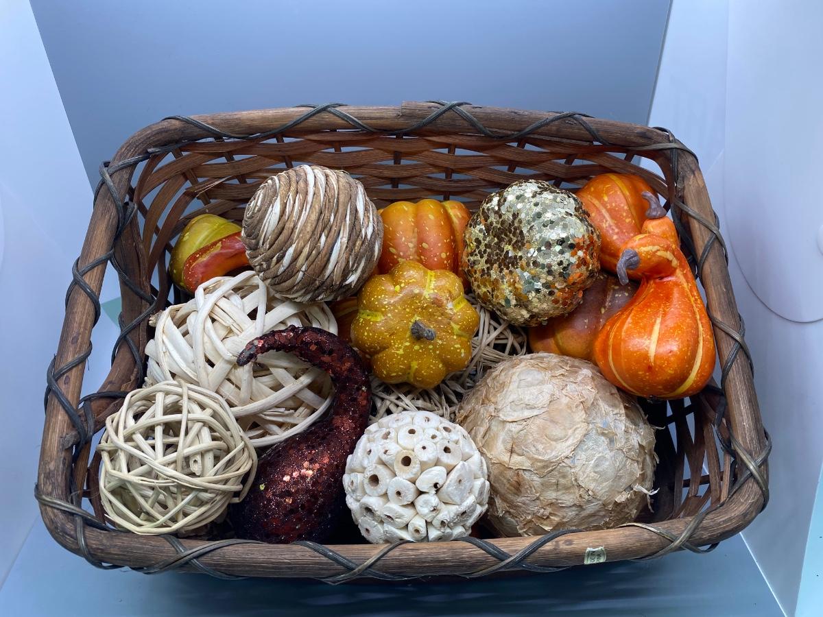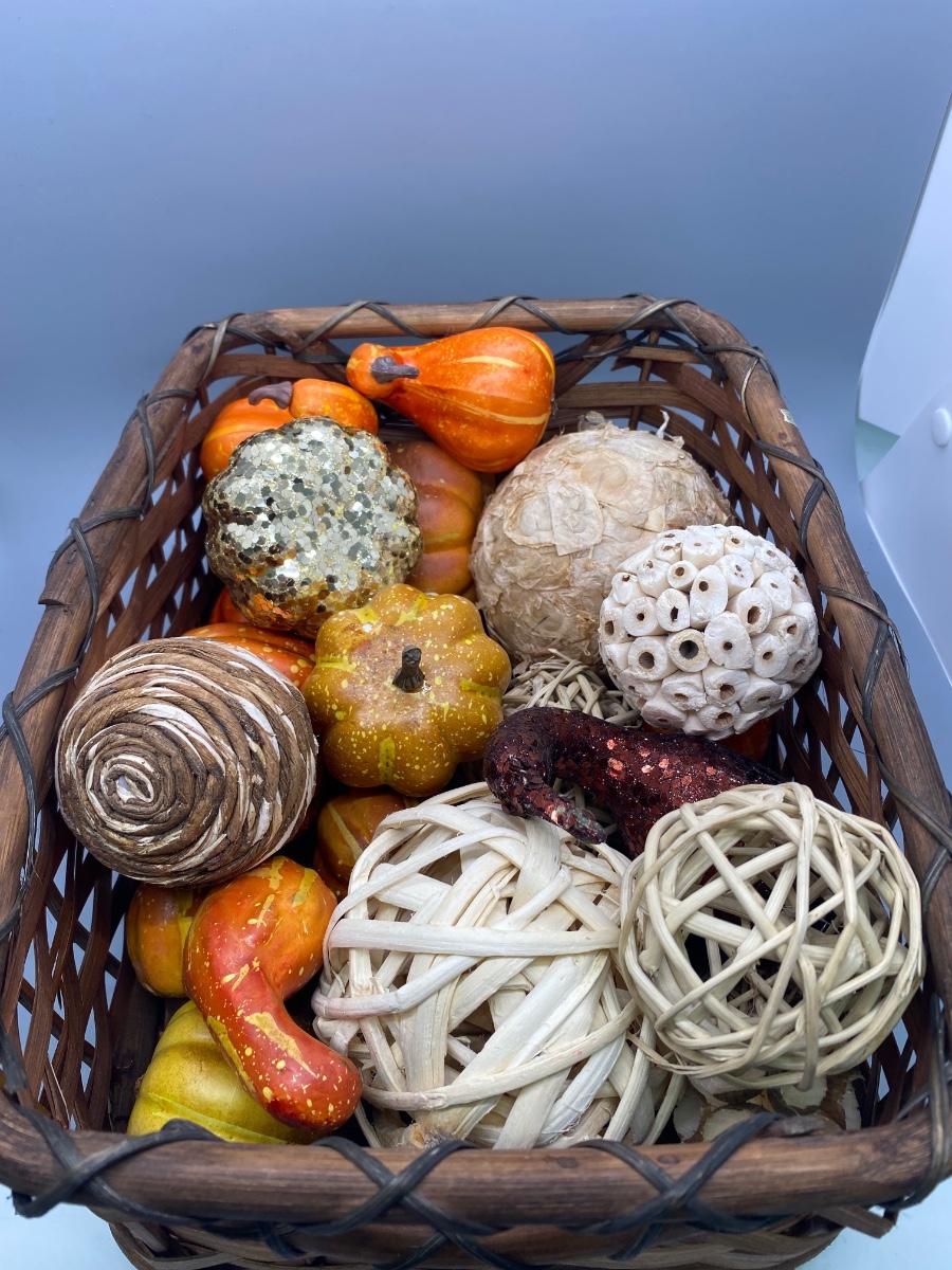 Basket of Natural and Artificial Fall Autumn Decor Gourds Reed Balls