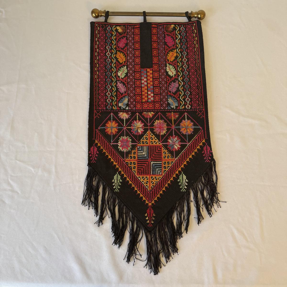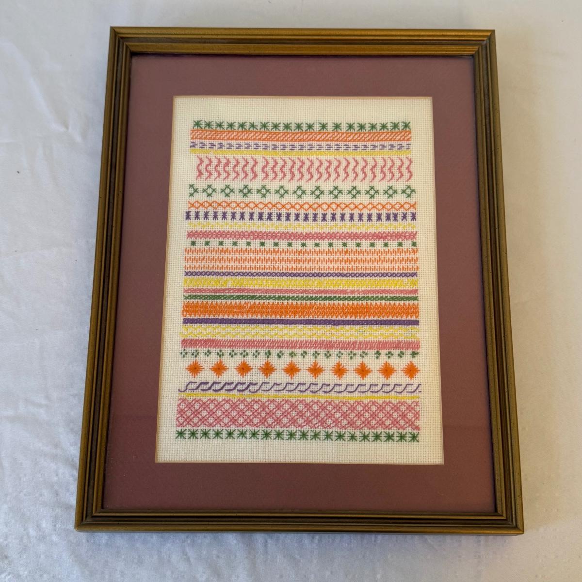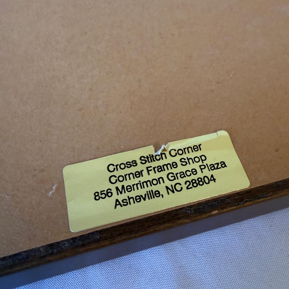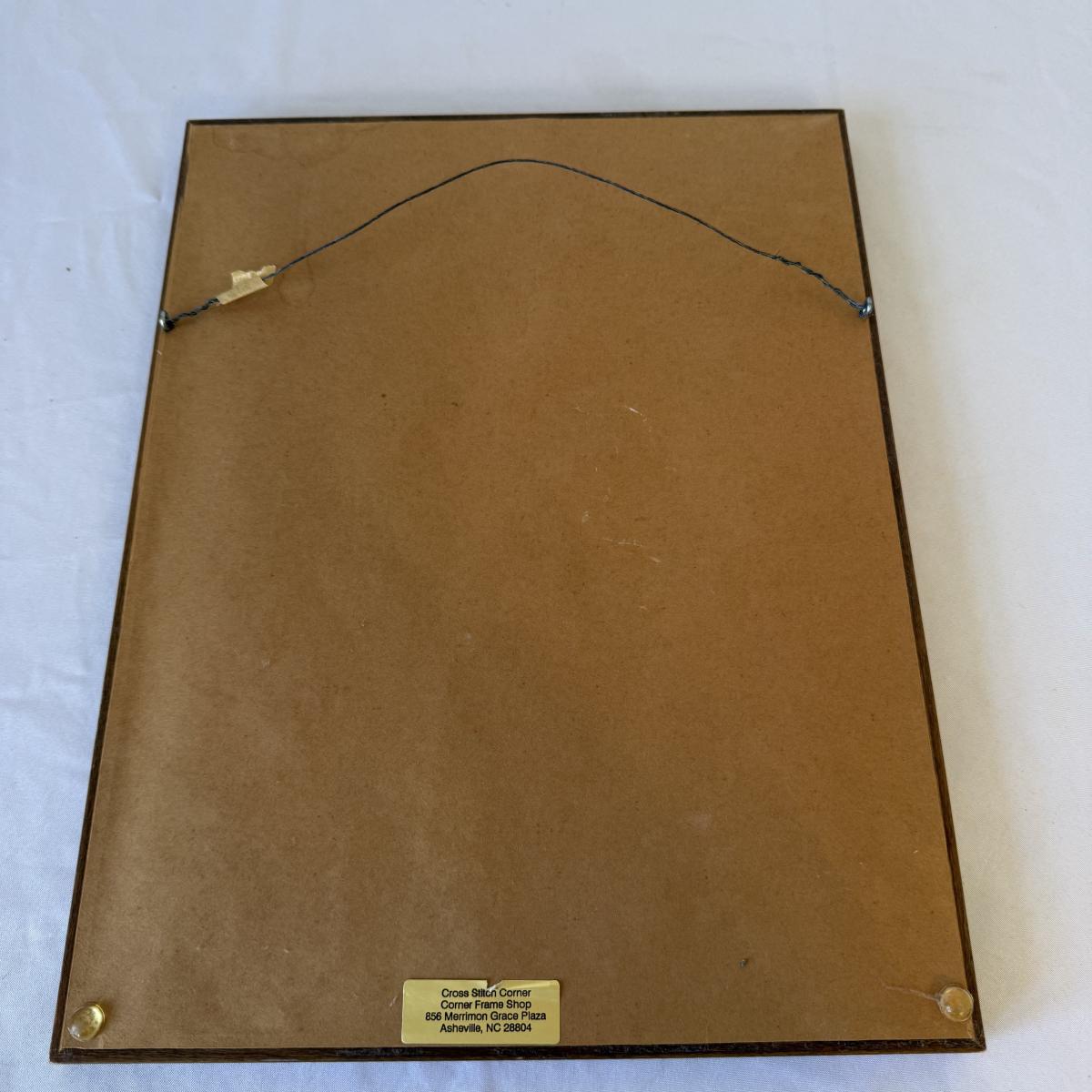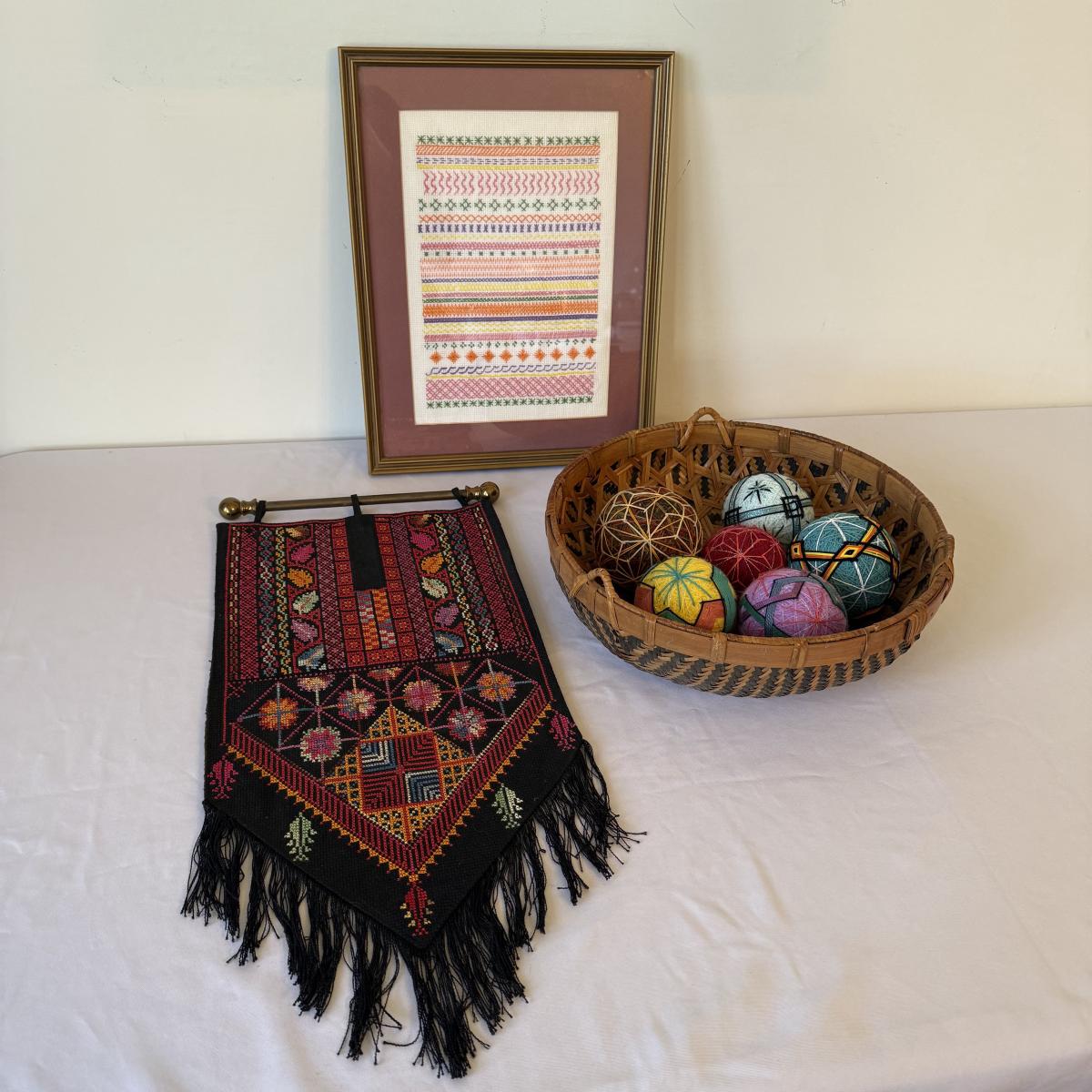 The shallow handwoven basket (13”D x 4”H) holds six Temari-style threaded balls. Basket has some small flaws shown in photos and one of the balls has a loose thread. Two cross stitch wall hangings are included as well. The black one hangs on a brass bar, and the other is matted and behind glass in a golden wood frame that measures 12” x 15.5”.