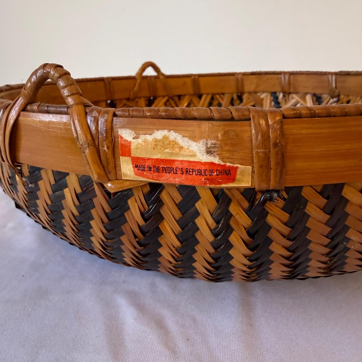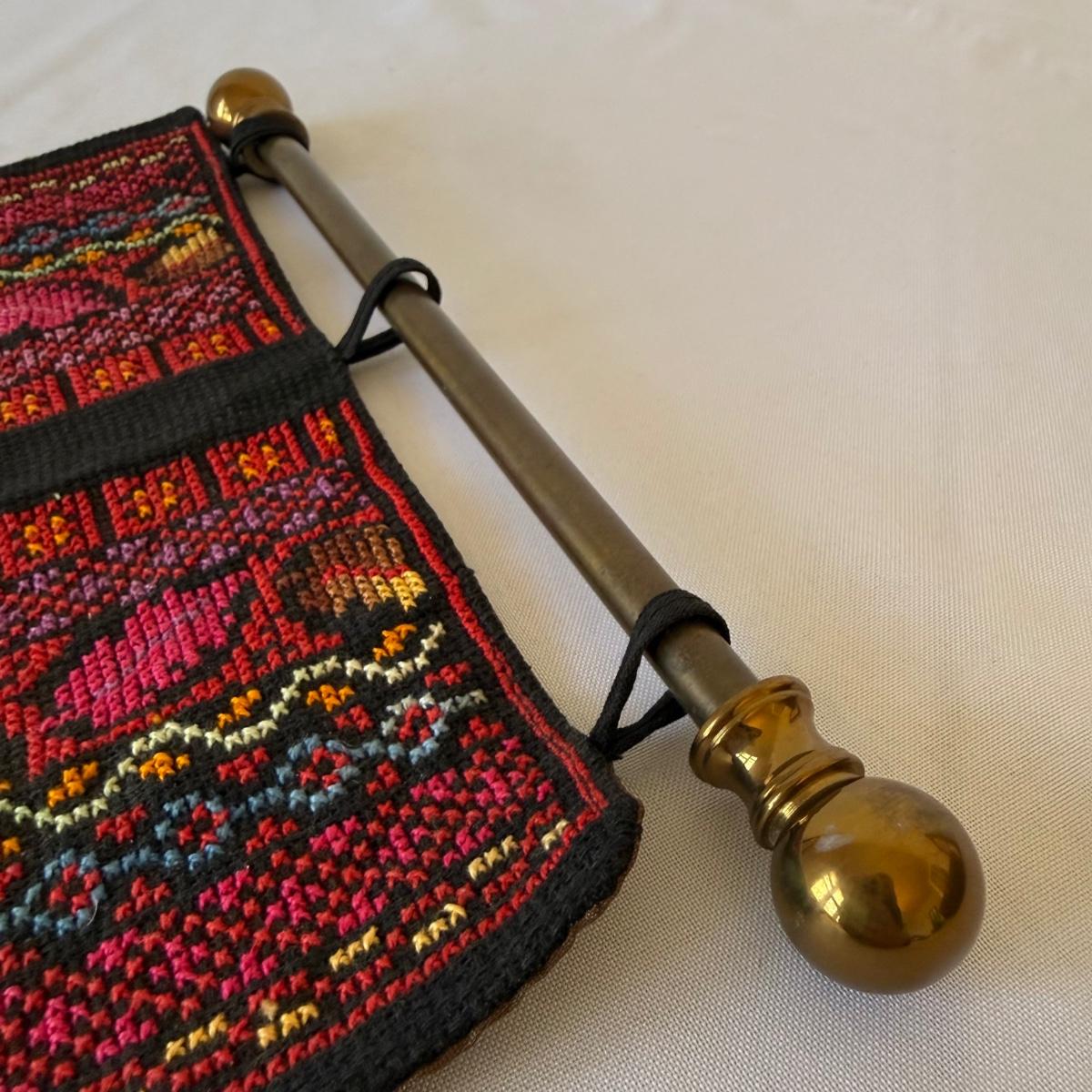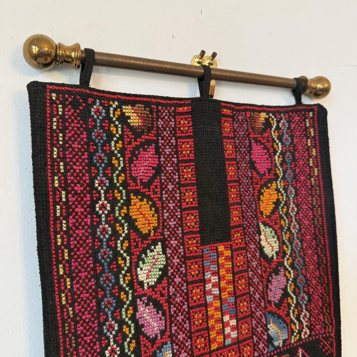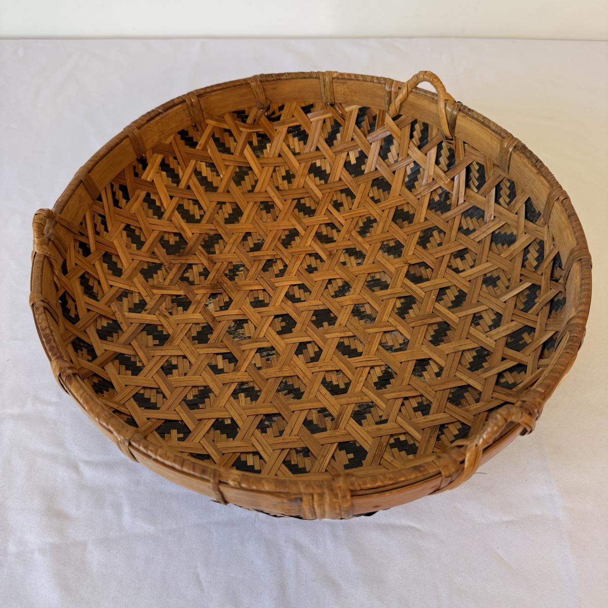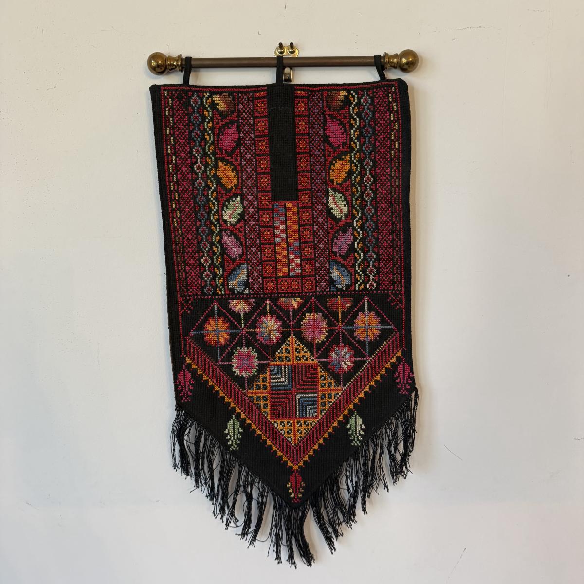 The shallow handwoven basket (13”D x 4”H) holds six Temari-style threaded balls. Basket has some small flaws shown in photos and one of the balls has a loose thread. Two cross stitch wall hangings are included as well. The black one hangs on a brass bar, and the other is matted and behind glass in a golden wood frame that measures 12” x 15.5”.