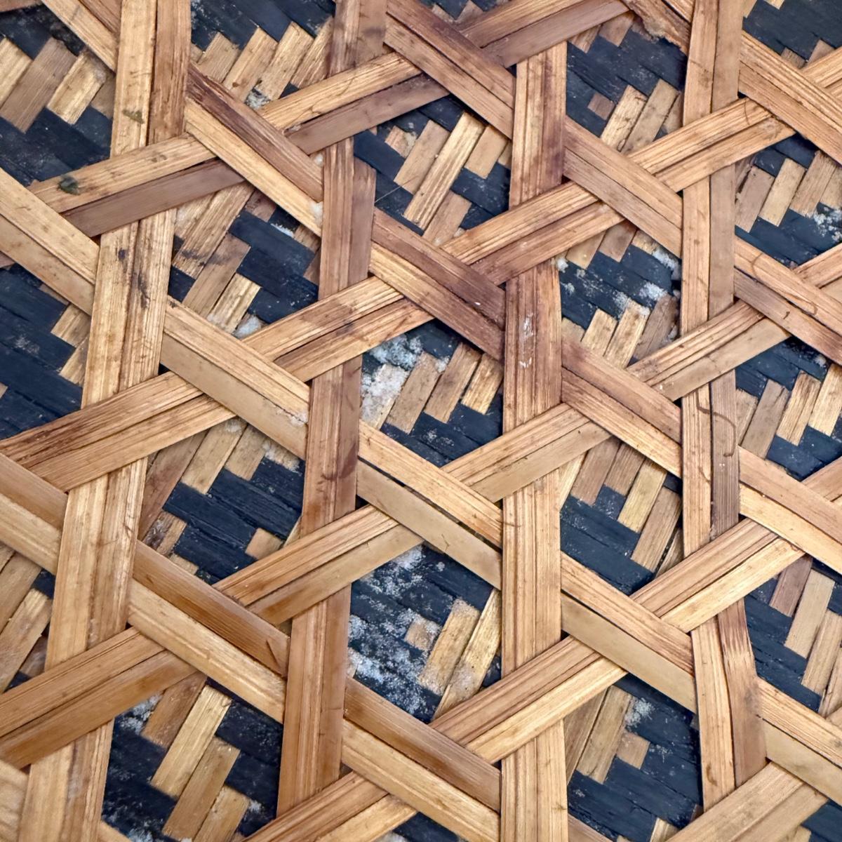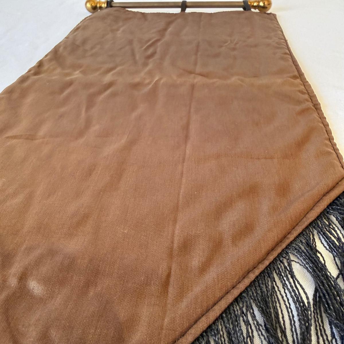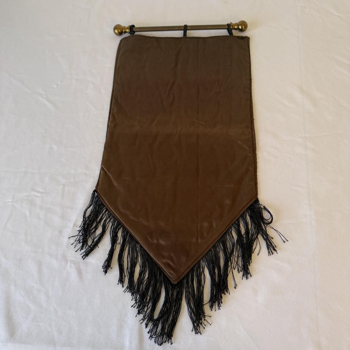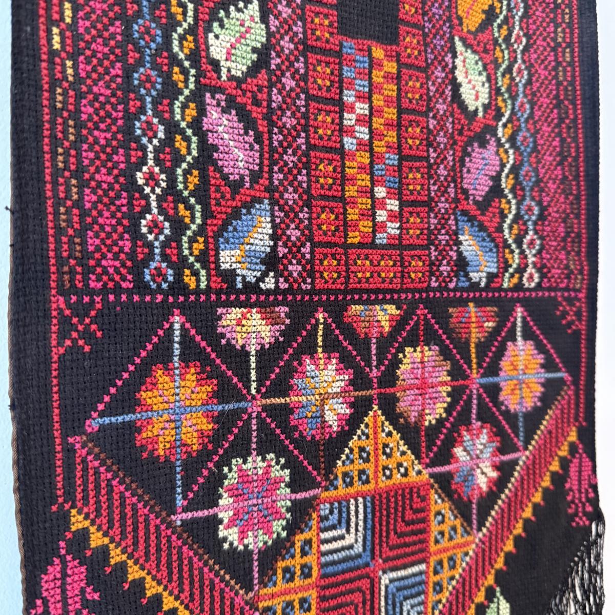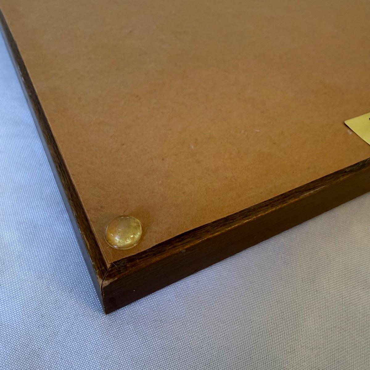 The shallow handwoven basket (13”D x 4”H) holds six Temari-style threaded balls. Basket has some small flaws shown in photos and one of the balls has a loose thread. Two cross stitch wall hangings are included as well. The black one hangs on a brass bar, and the other is matted and behind glass in a golden wood frame that measures 12” x 15.5”.