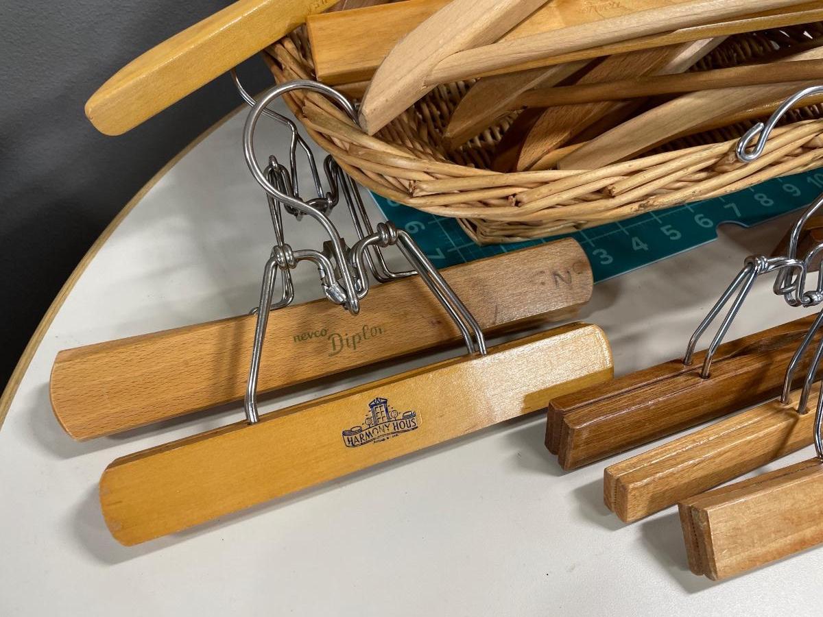 Basket of wood hangers & bag full of clothes pins