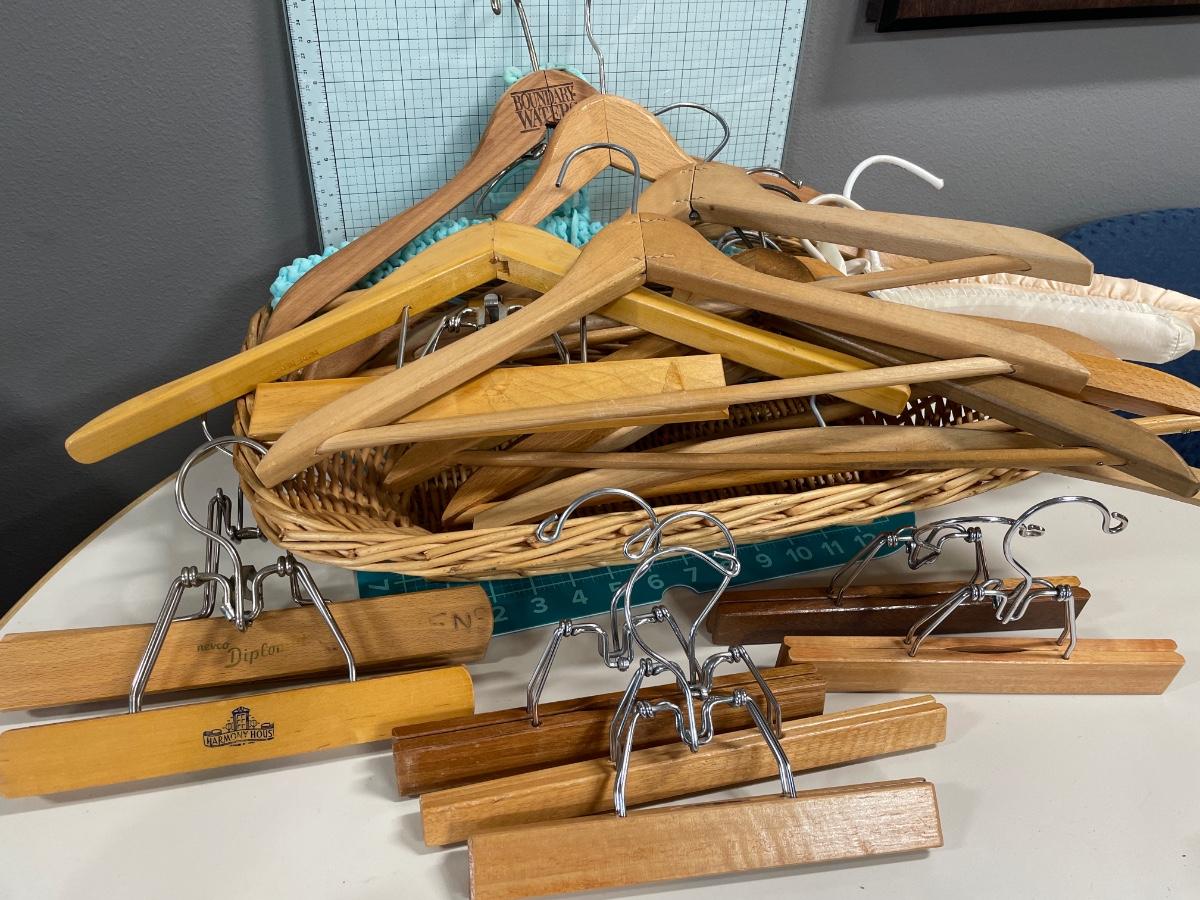Pants and shirt hangers in basket