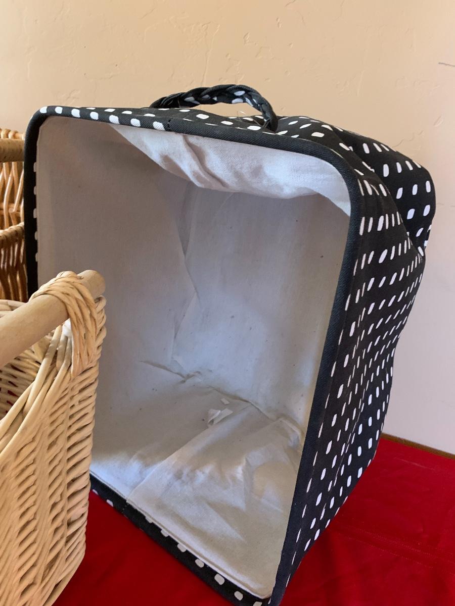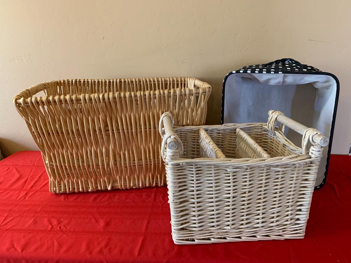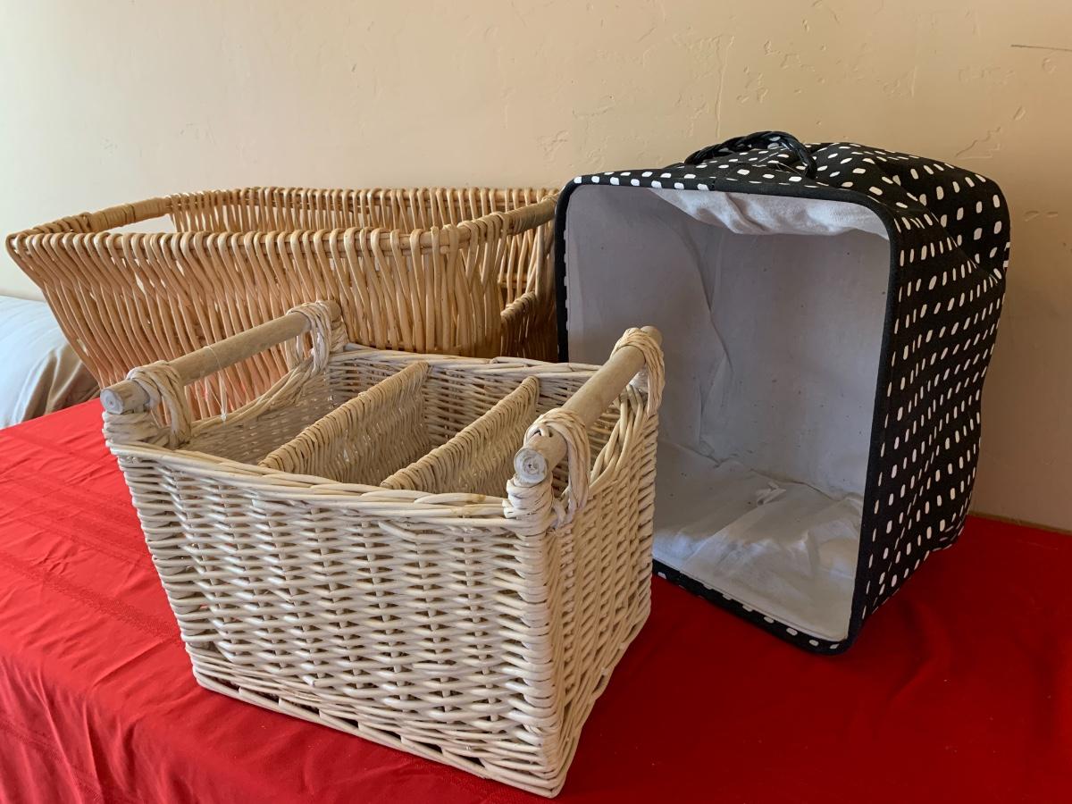 Lot includes a large wicker laundry/storage basket, a smaller wicker basket with 3 compartments and a black and white polka dot fabric storage bin. Largest basket is 26” x 18” x 15”