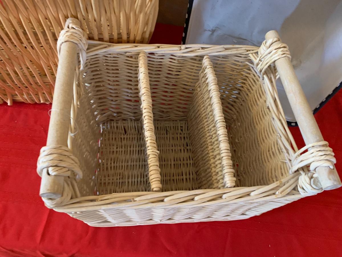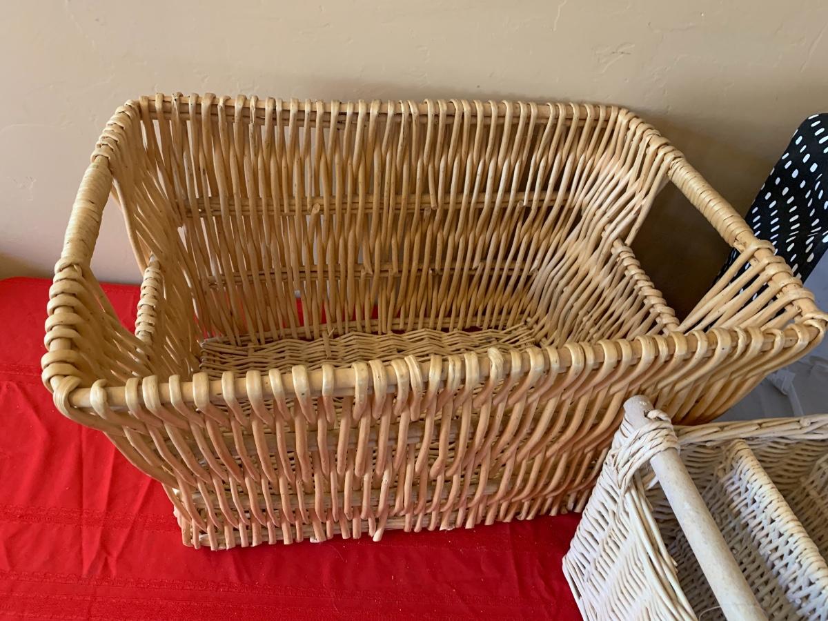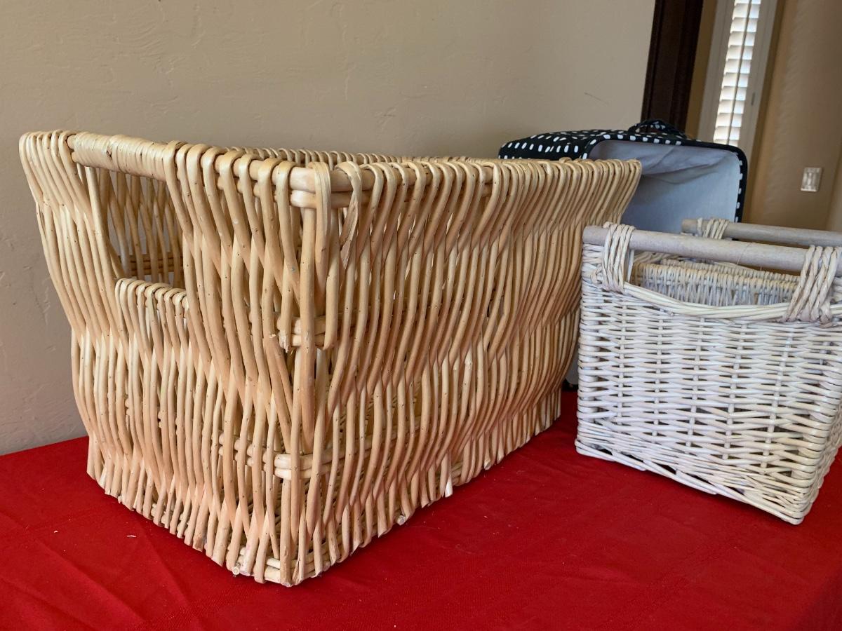 Lot includes a large wicker laundry/storage basket, a smaller wicker basket with 3 compartments and a black and white polka dot fabric storage bin. Largest basket is 26” x 18” x 15”