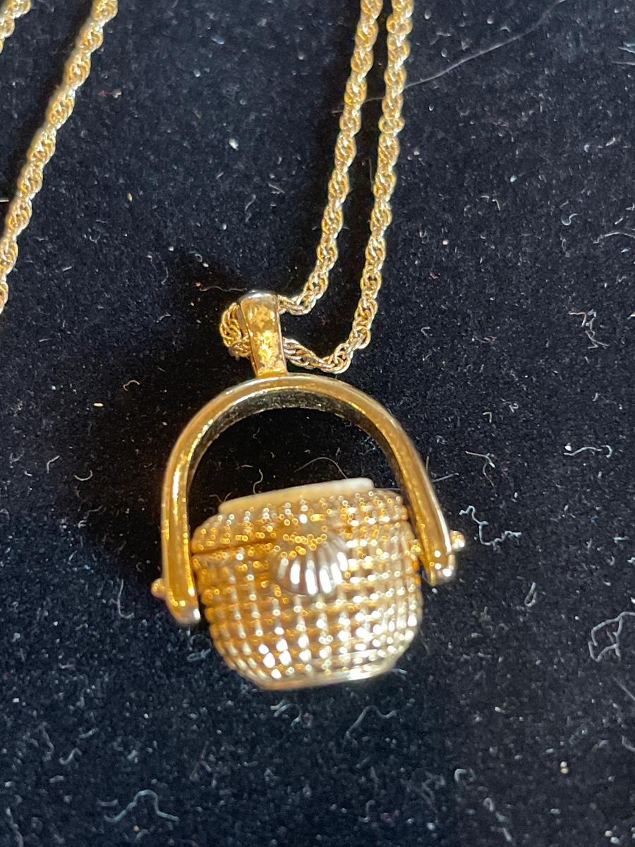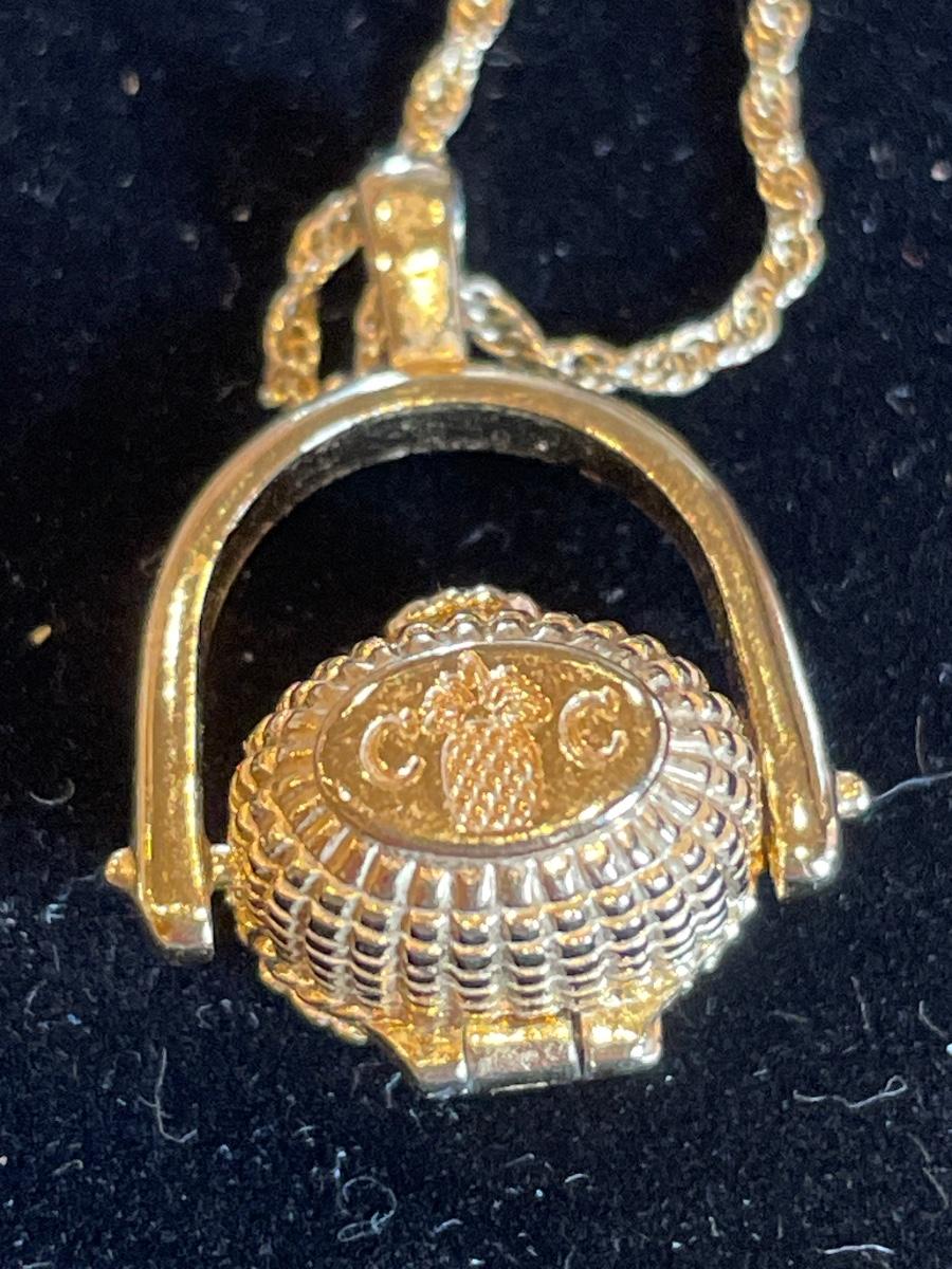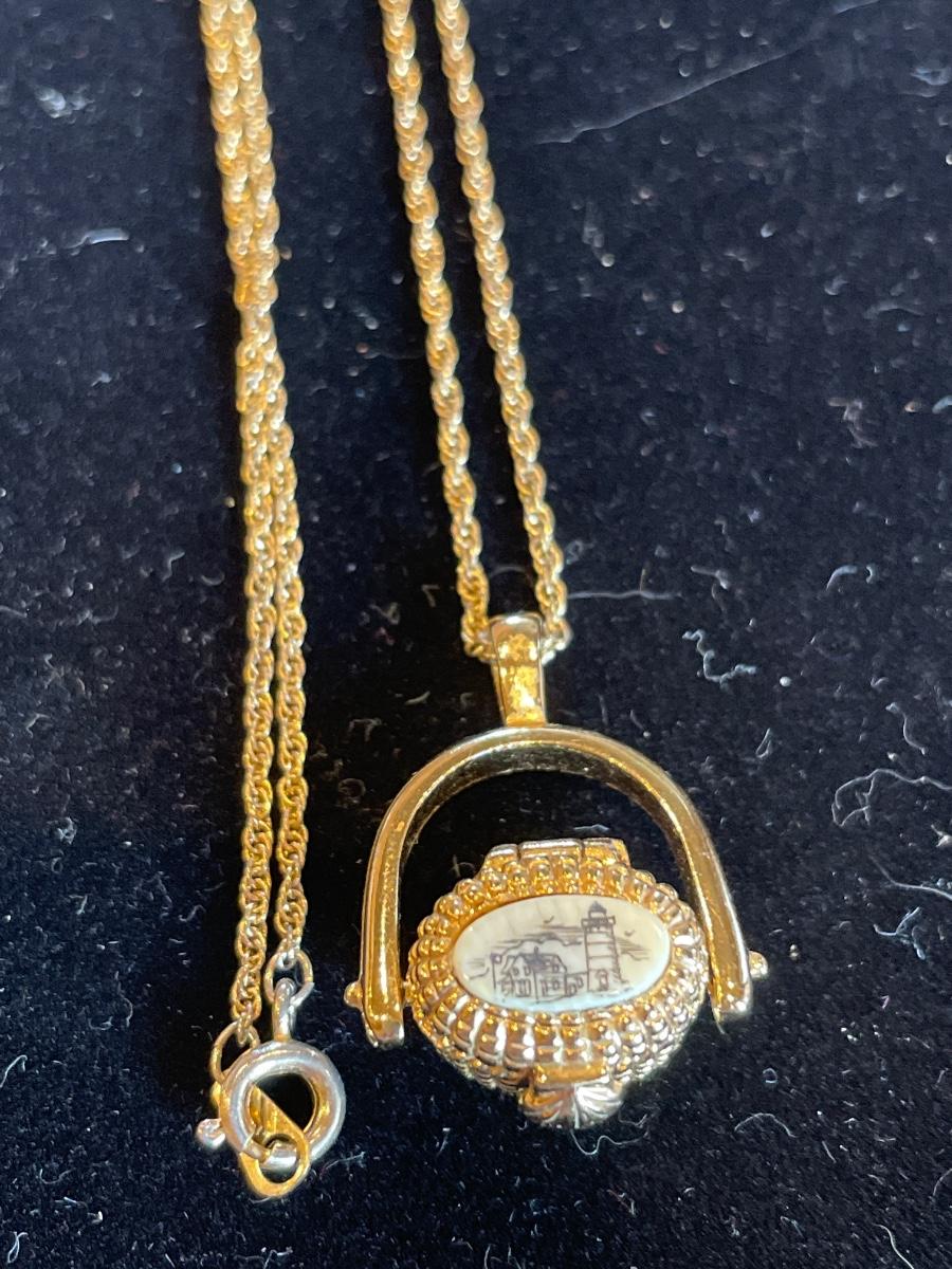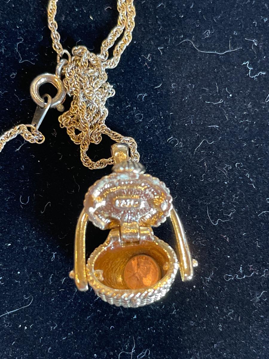 Scrimshaw Basket with penny charm on long gold tone necklace