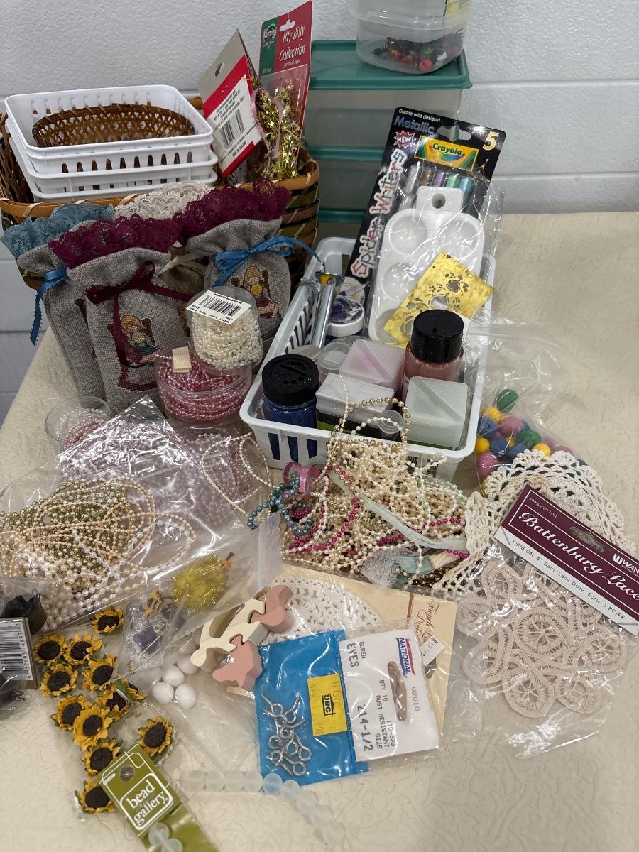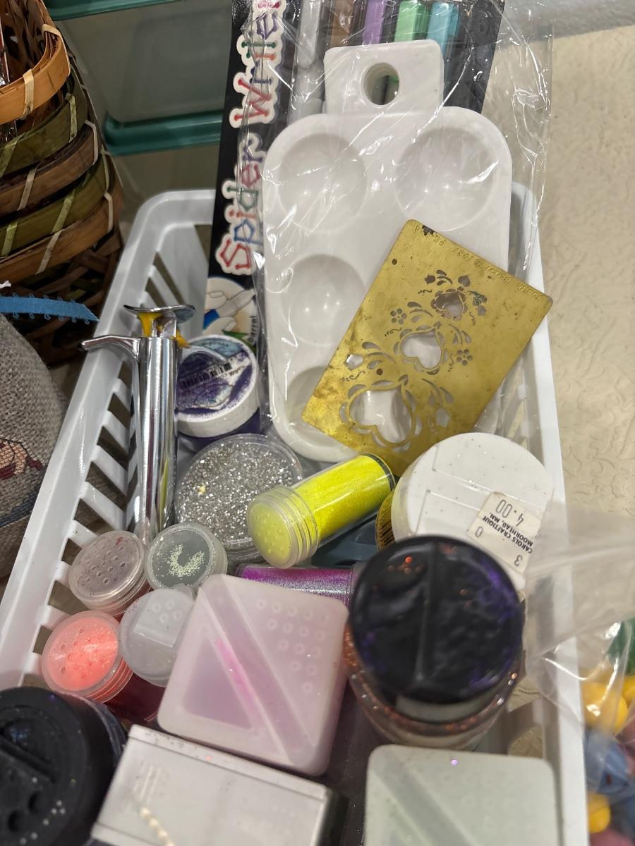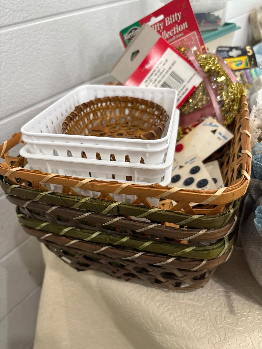 Miscellaneous crafting supplies, beating, and baskets for storage.
