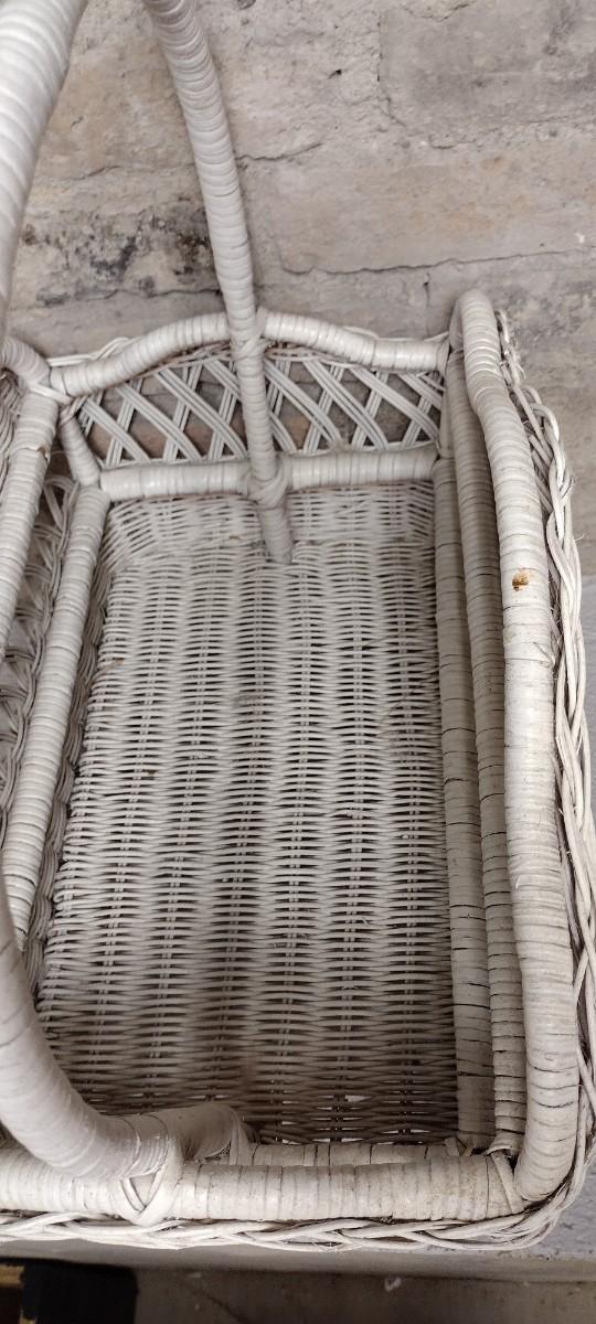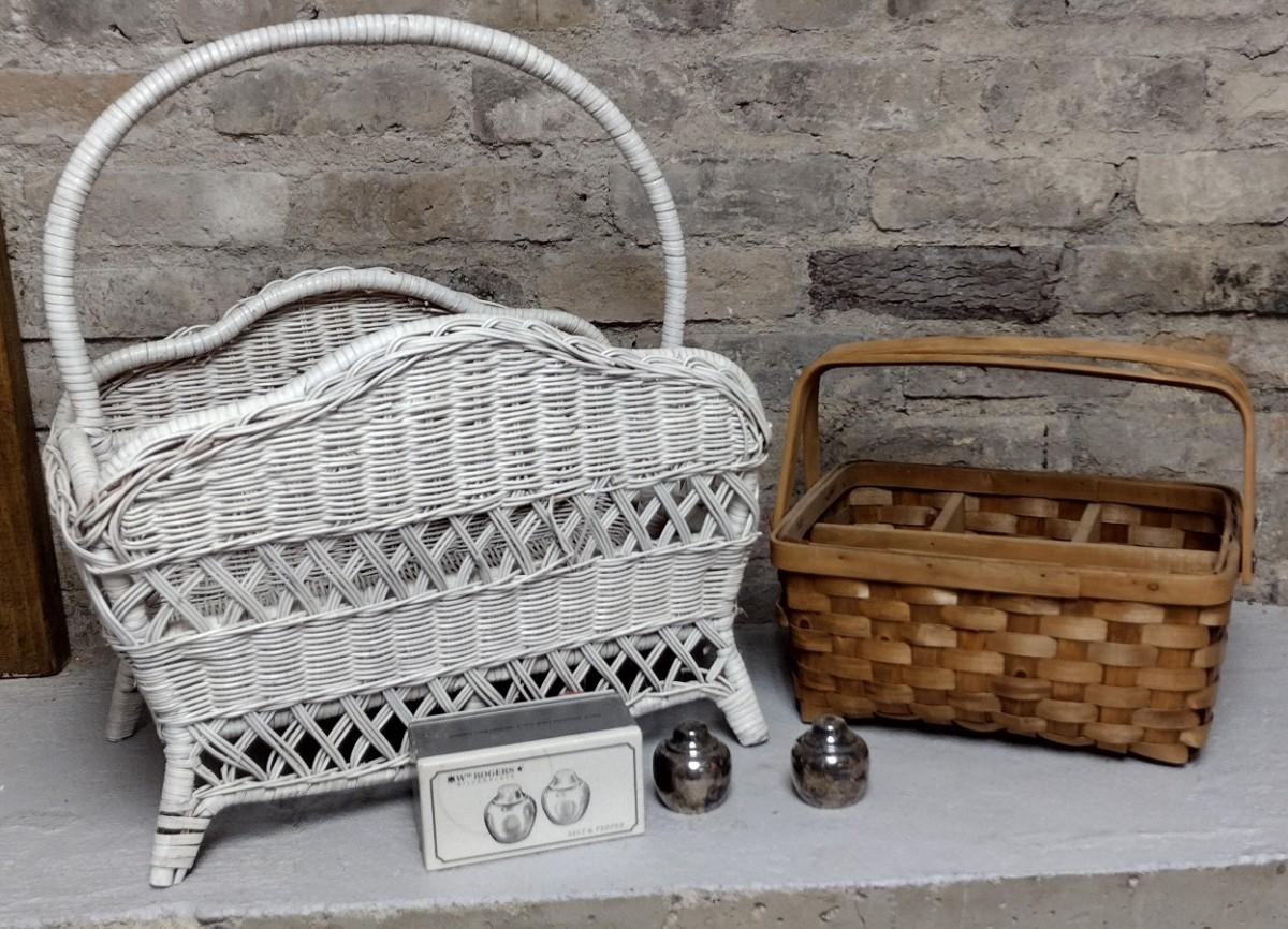 Vintage Wicker magazine holder, silverware basket and plated S & P