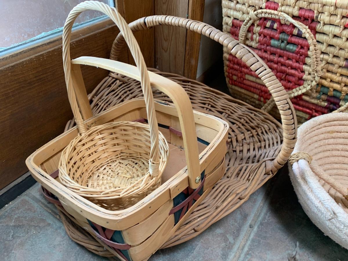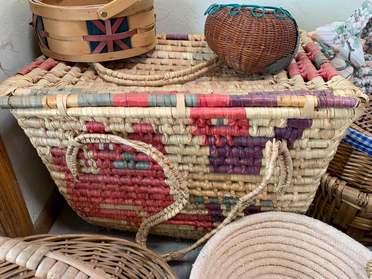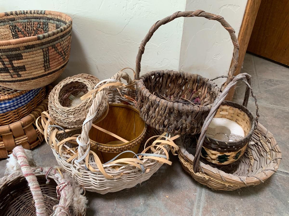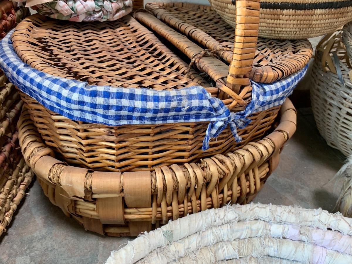 Assortment of baskets all in used and dusty condition, includes picnic baskets, storage baskets and fabric woven baskets