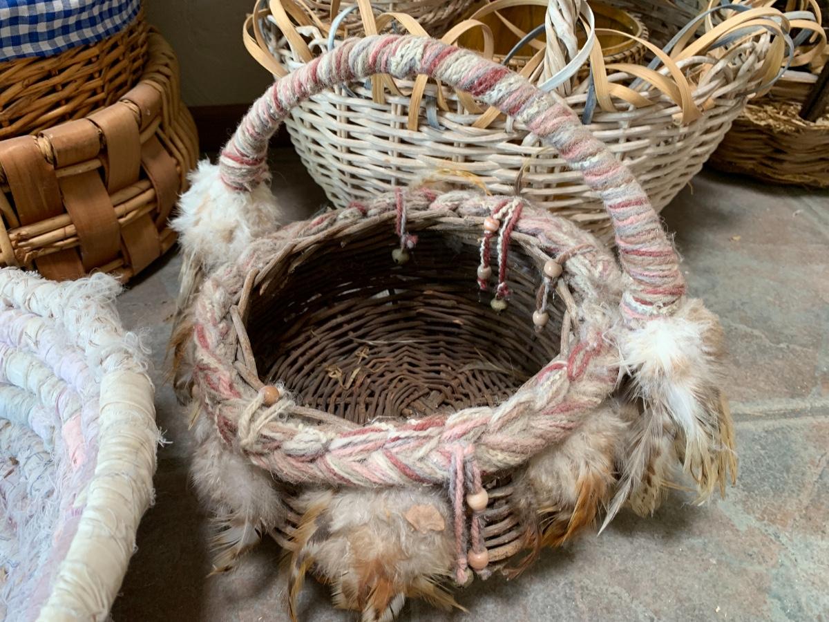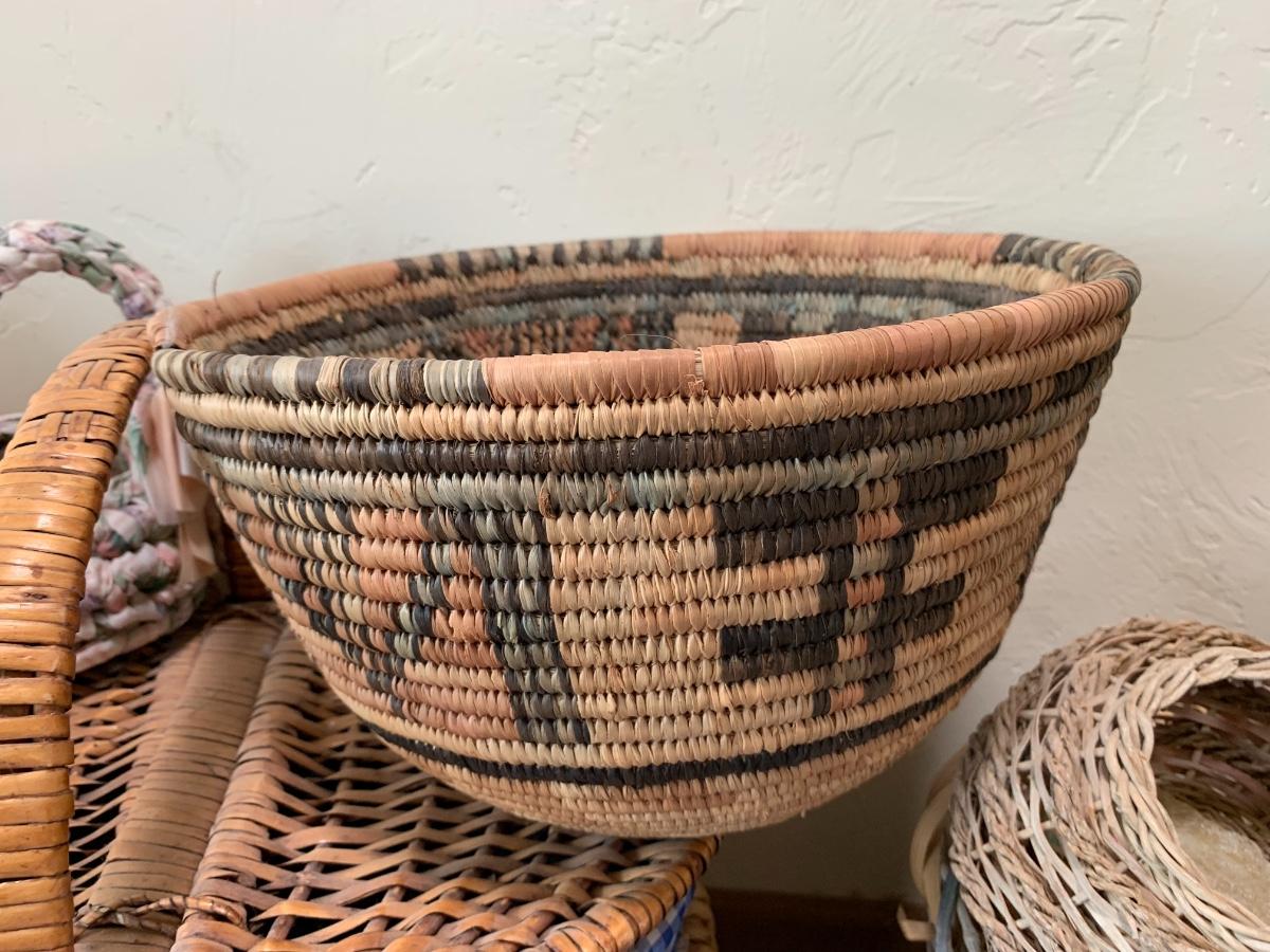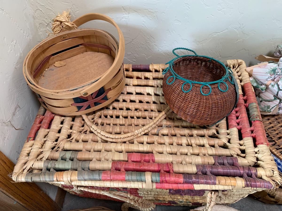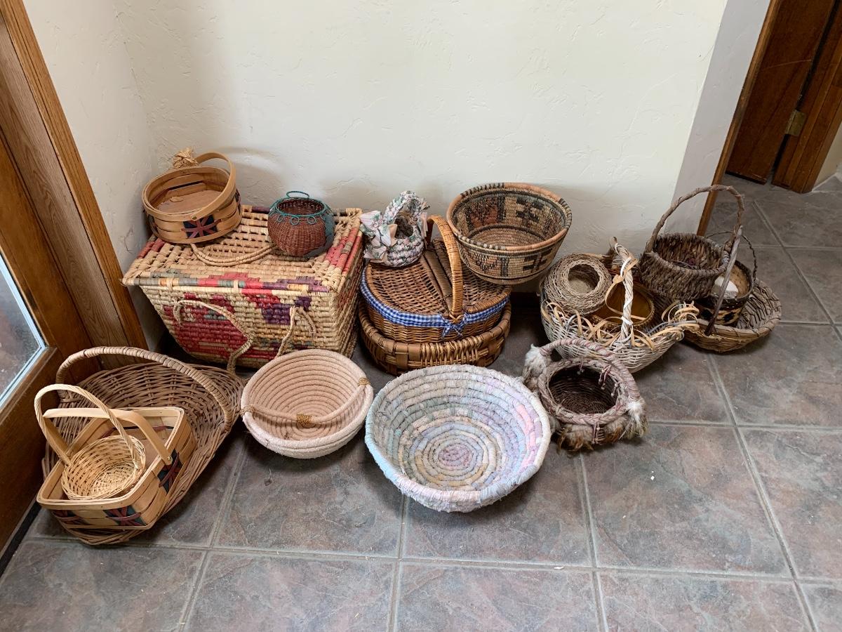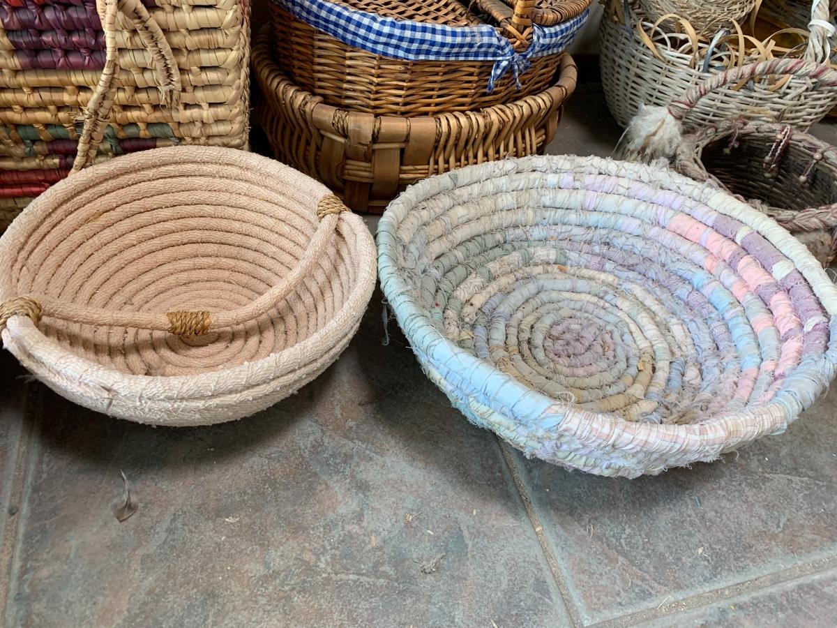 Assortment of baskets all in used and dusty condition, includes picnic baskets, storage baskets and fabric woven baskets