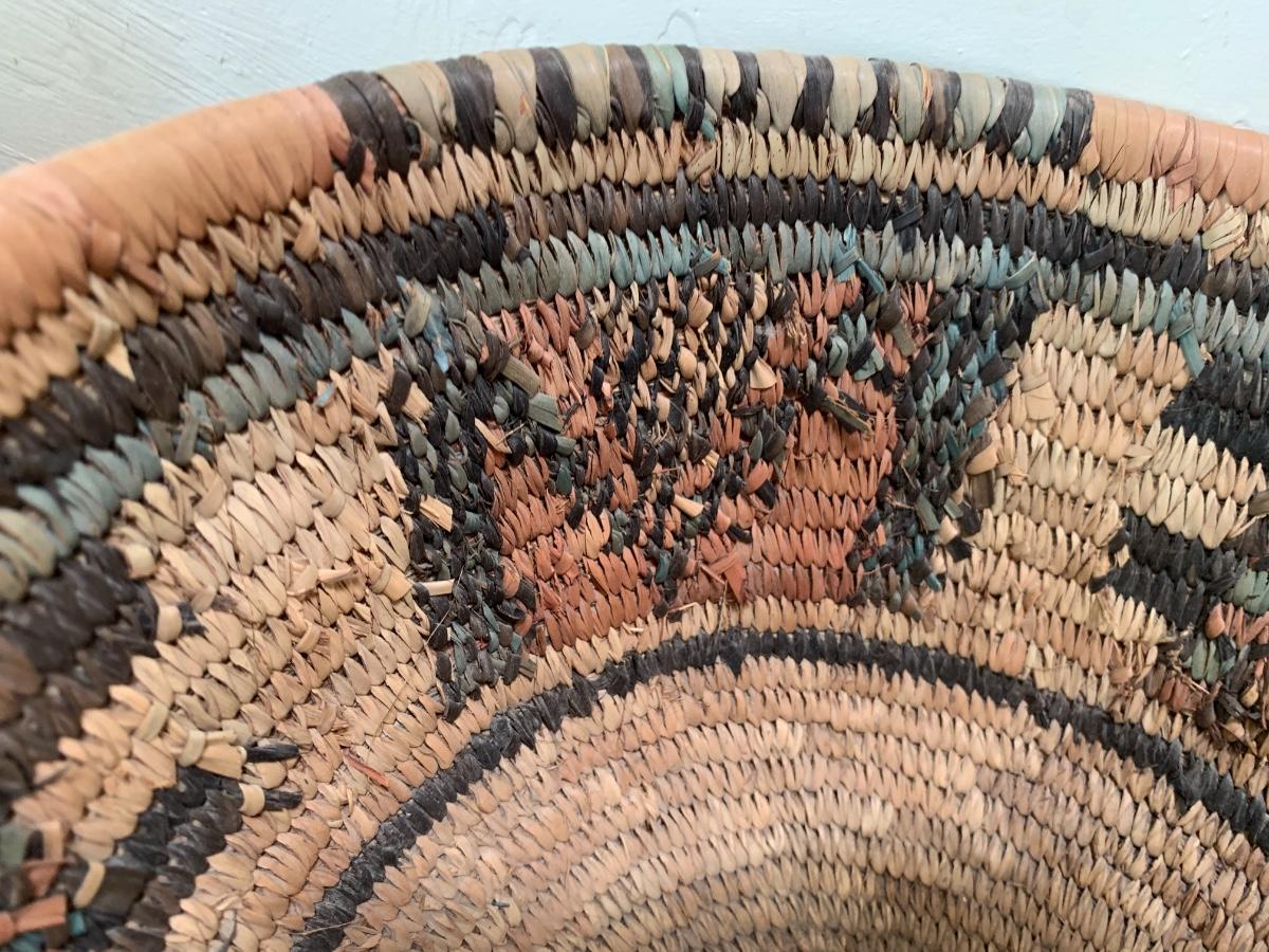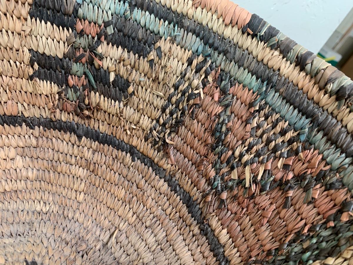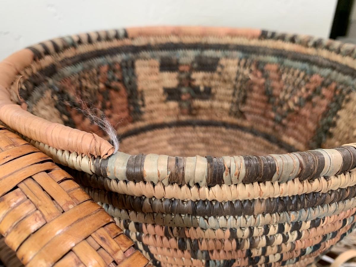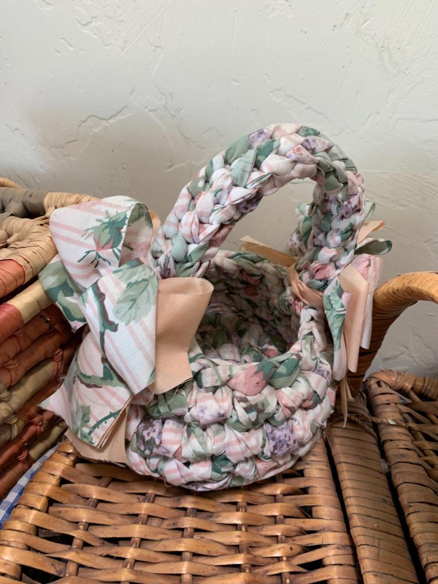 Assortment of baskets all in used and dusty condition, includes picnic baskets, storage baskets and fabric woven baskets