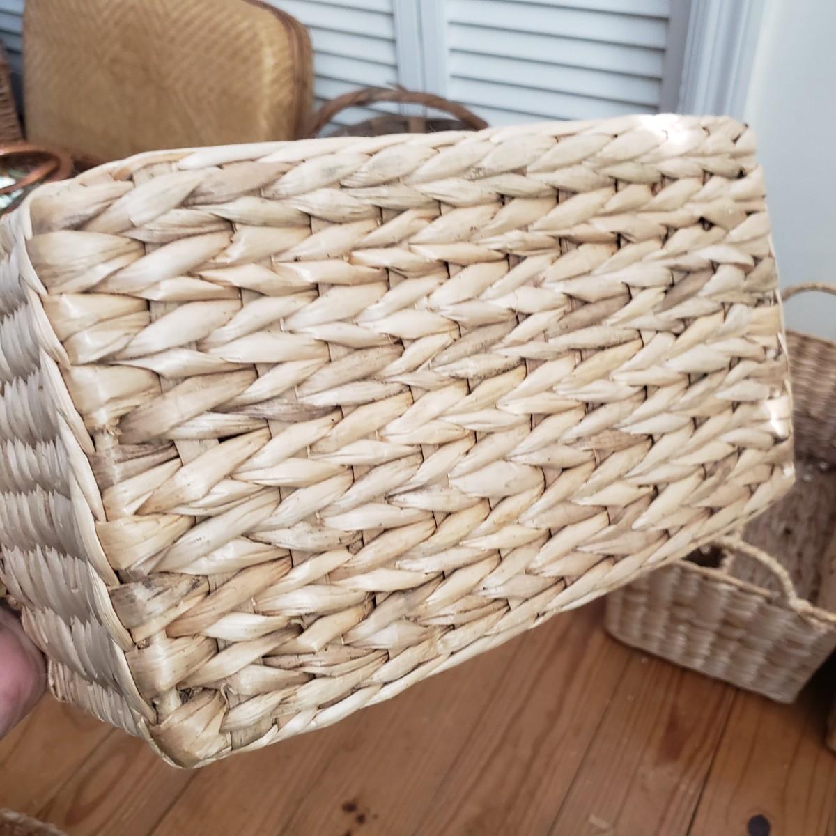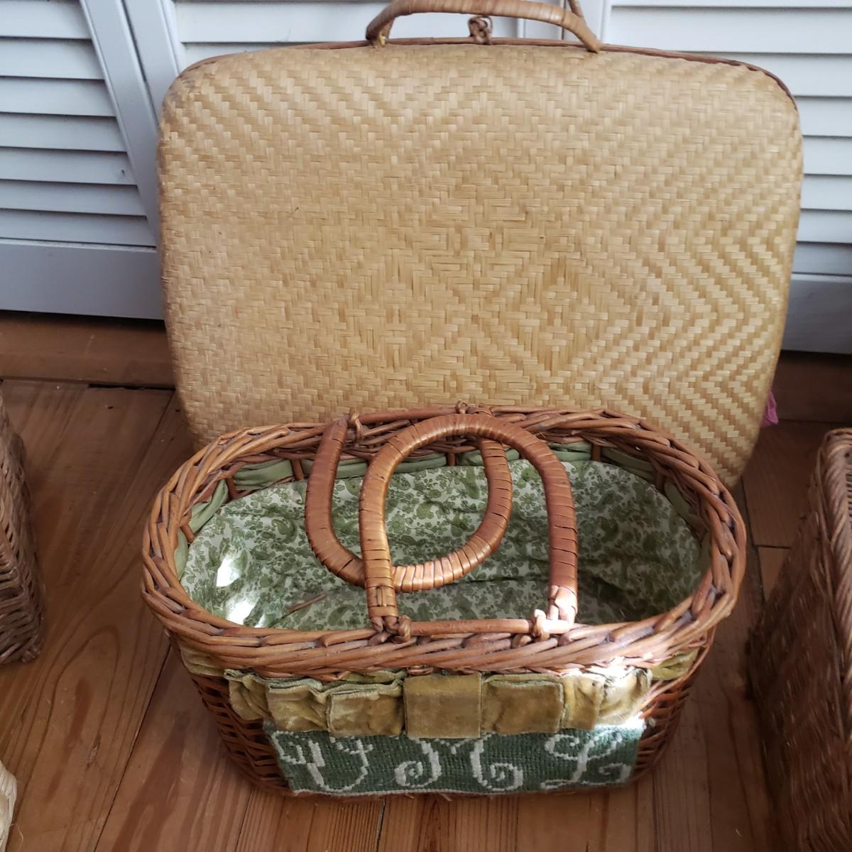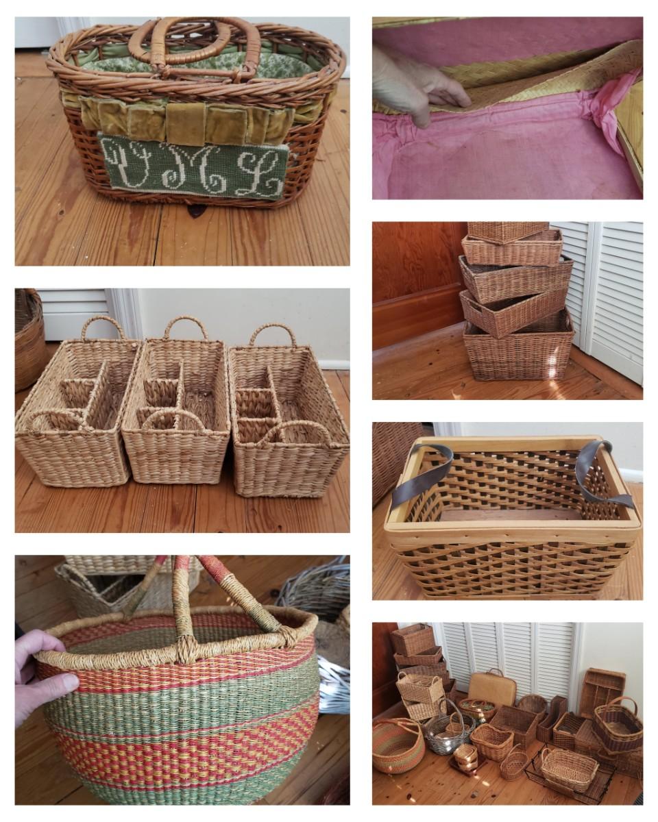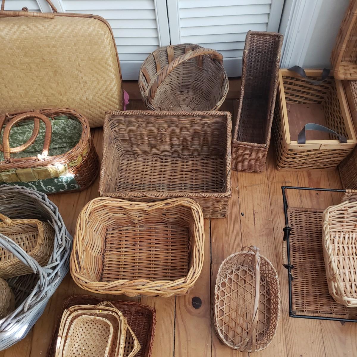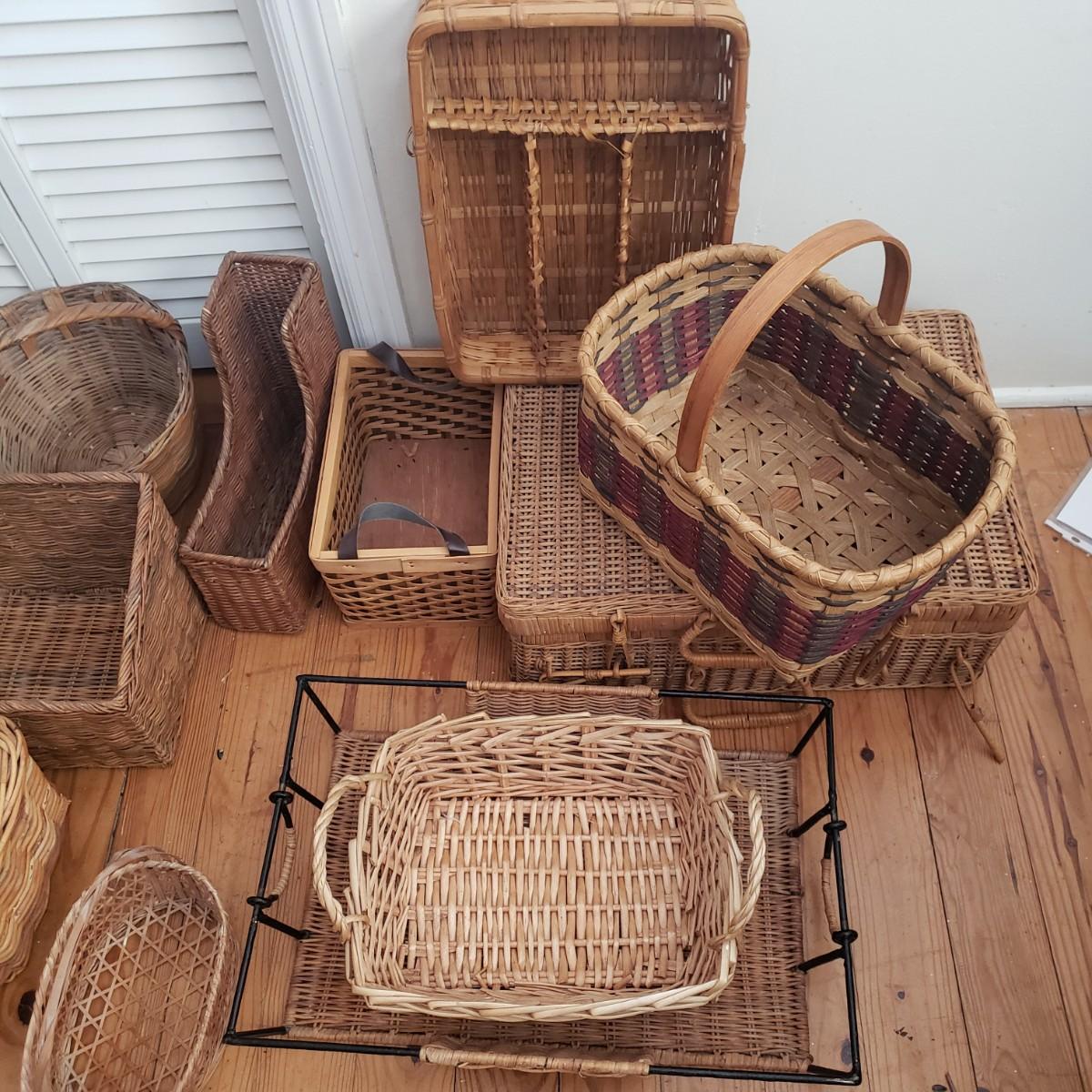 This large lot of baskets has such a variety! There is a wicker suitcase, a vintage purse, wire wrapped rectangular baskets for extra support and a handmade market basket with a leather wrapped handle. The three wicker utensil holders measure 12" x 7" x 6"H each. The purse with fabric lining the inside has "VML" embroidered on it with a sweet green velvet, yet a little faded, bow.