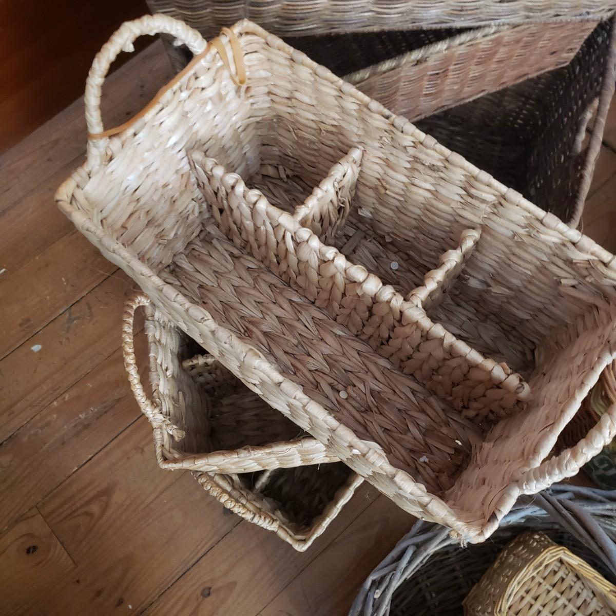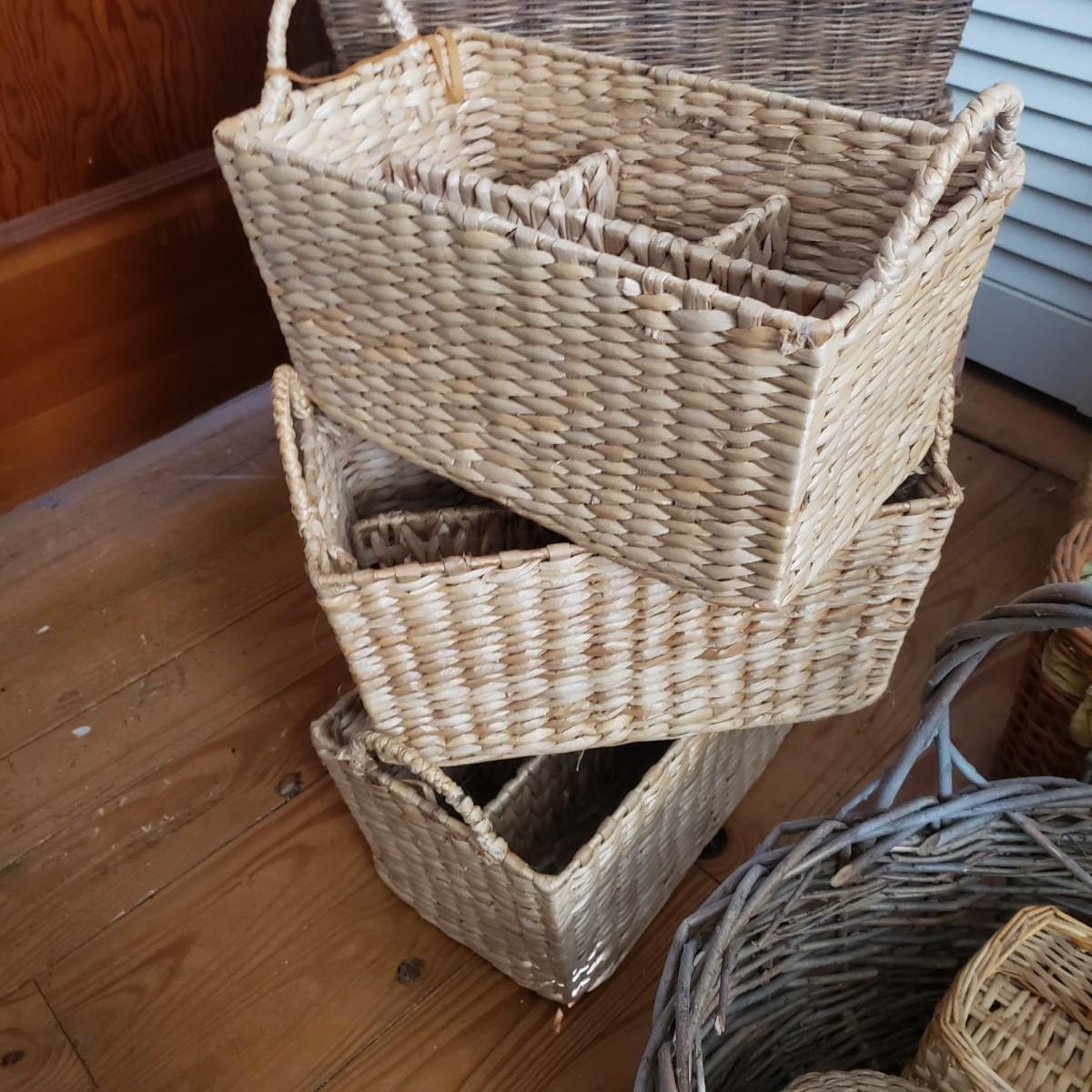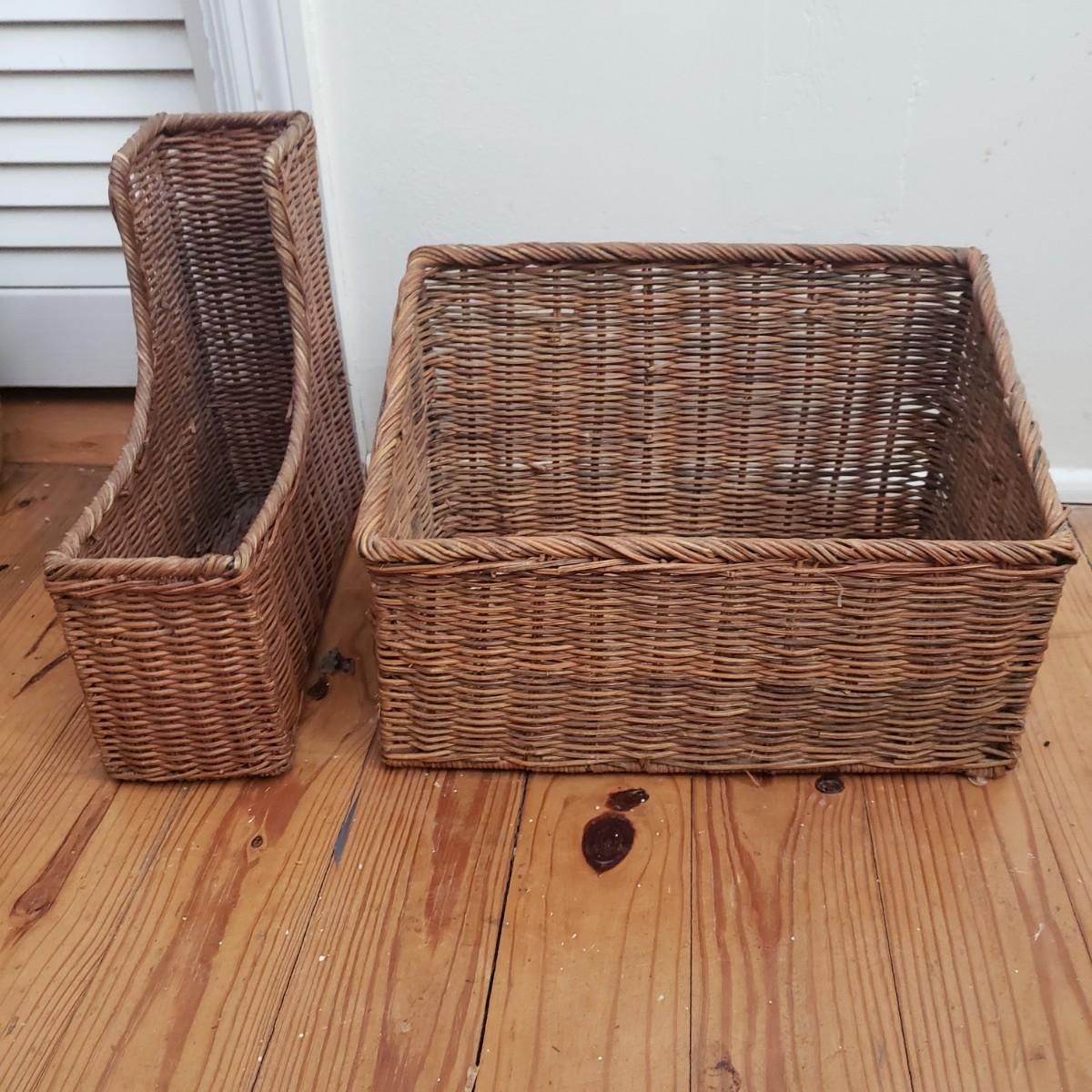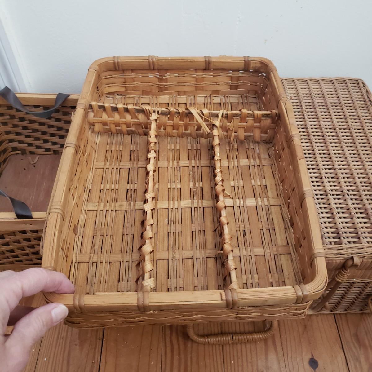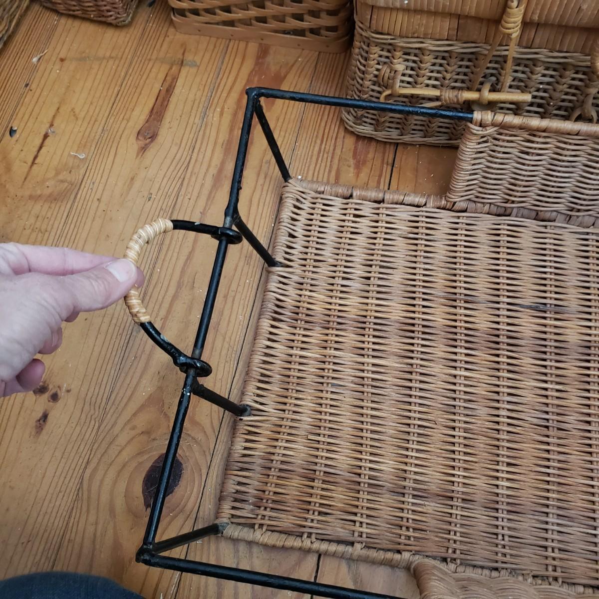 This large lot of baskets has such a variety! There is a wicker suitcase, a vintage purse, wire wrapped rectangular baskets for extra support and a handmade market basket with a leather wrapped handle. The three wicker utensil holders measure 12" x 7" x 6"H each. The purse with fabric lining the inside has "VML" embroidered on it with a sweet green velvet, yet a little faded, bow.