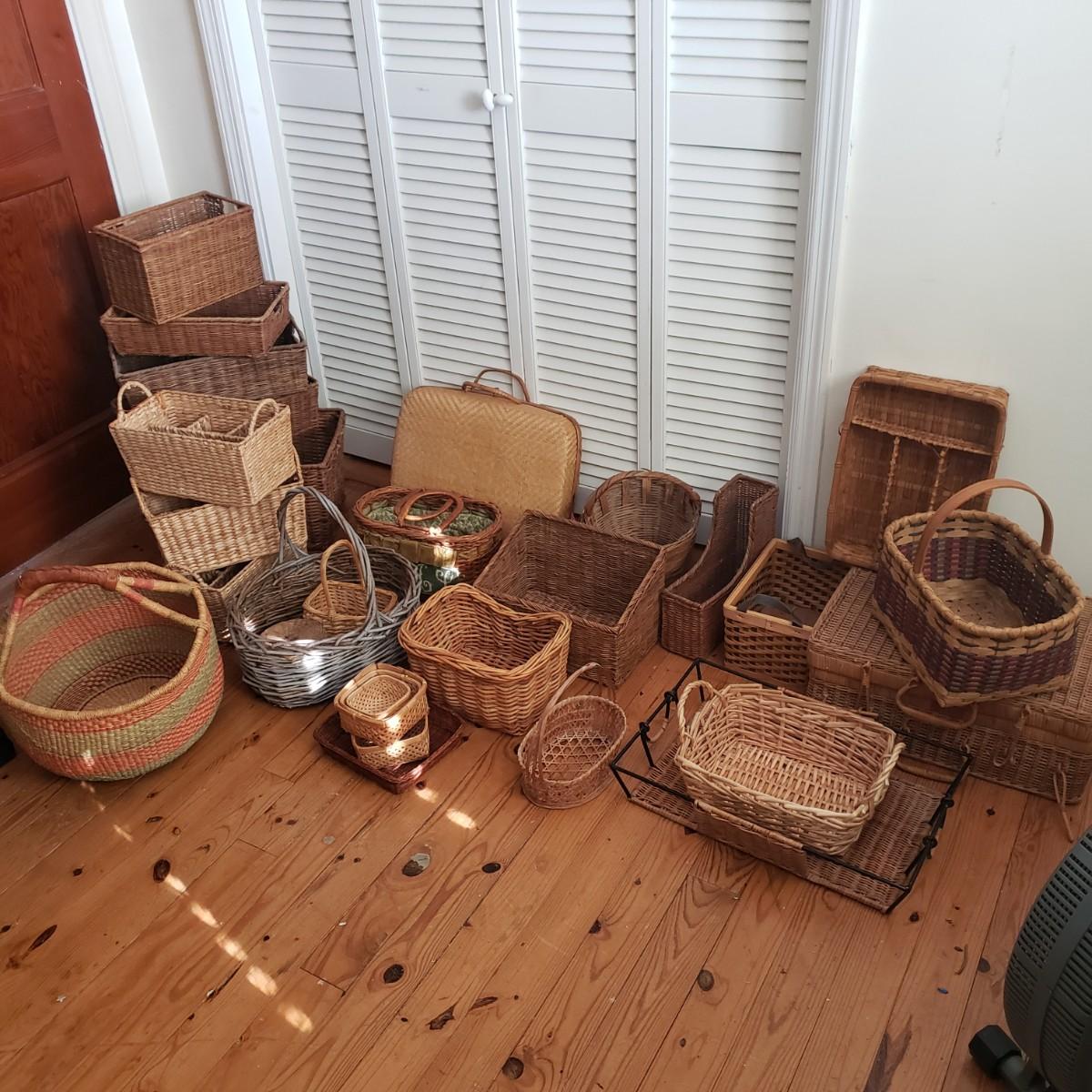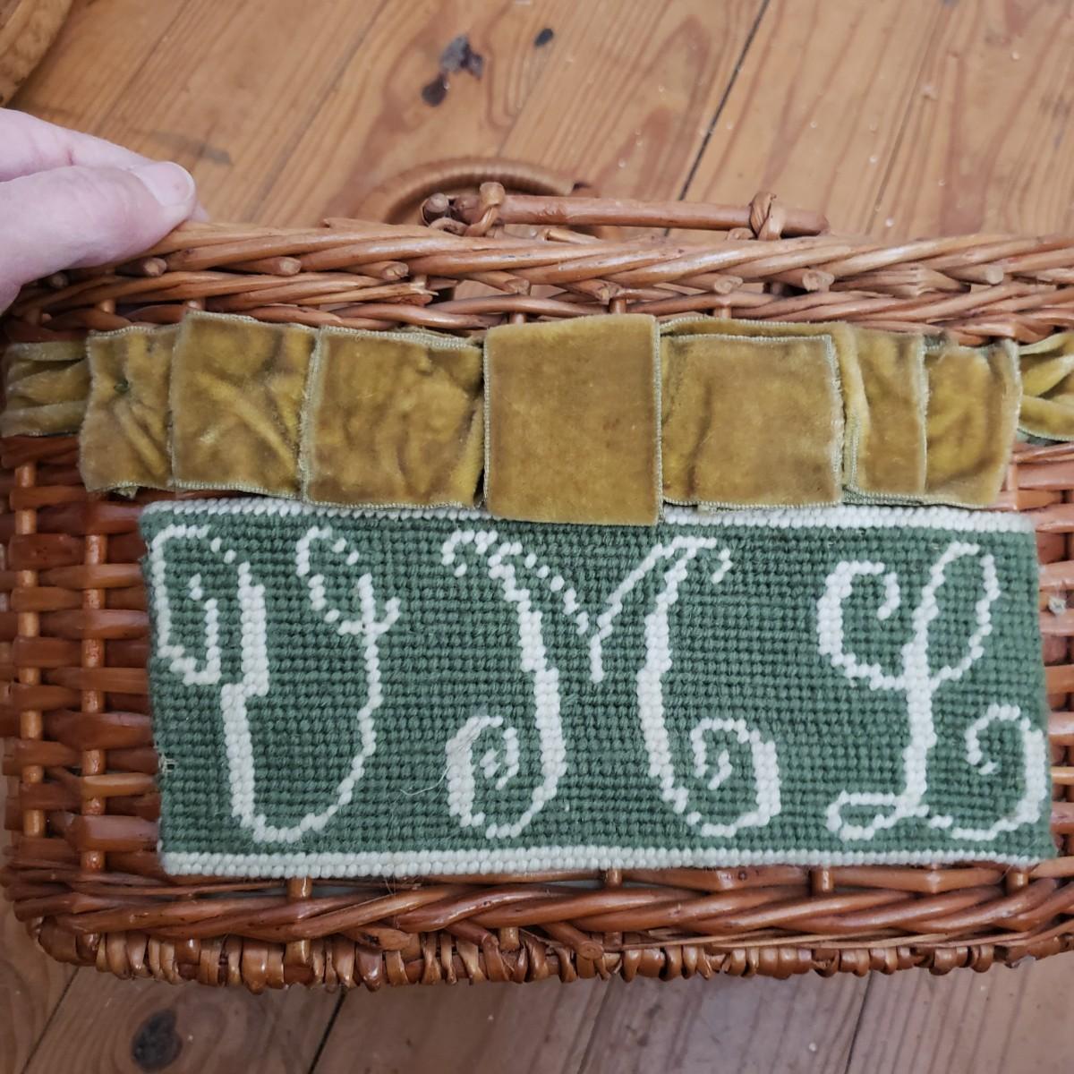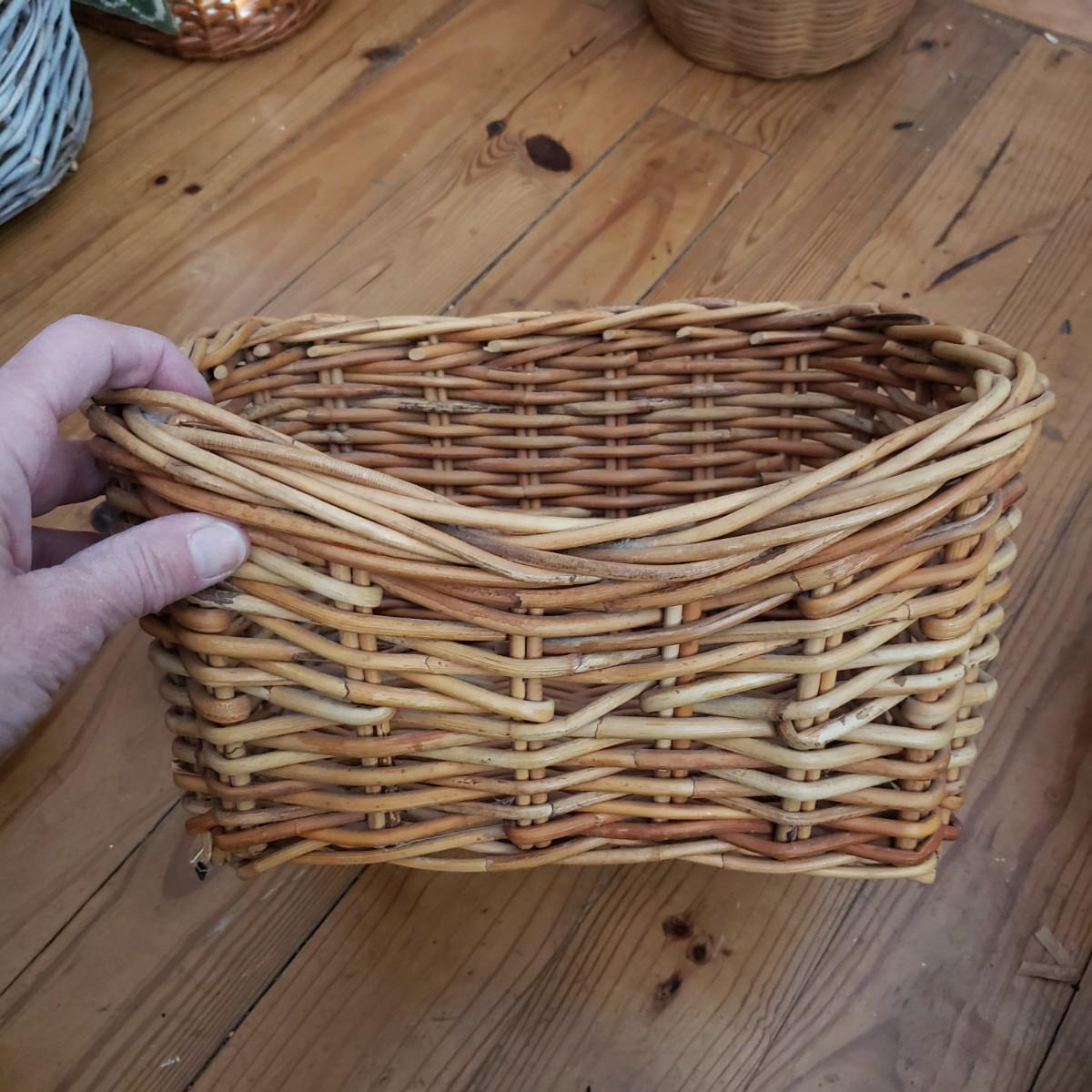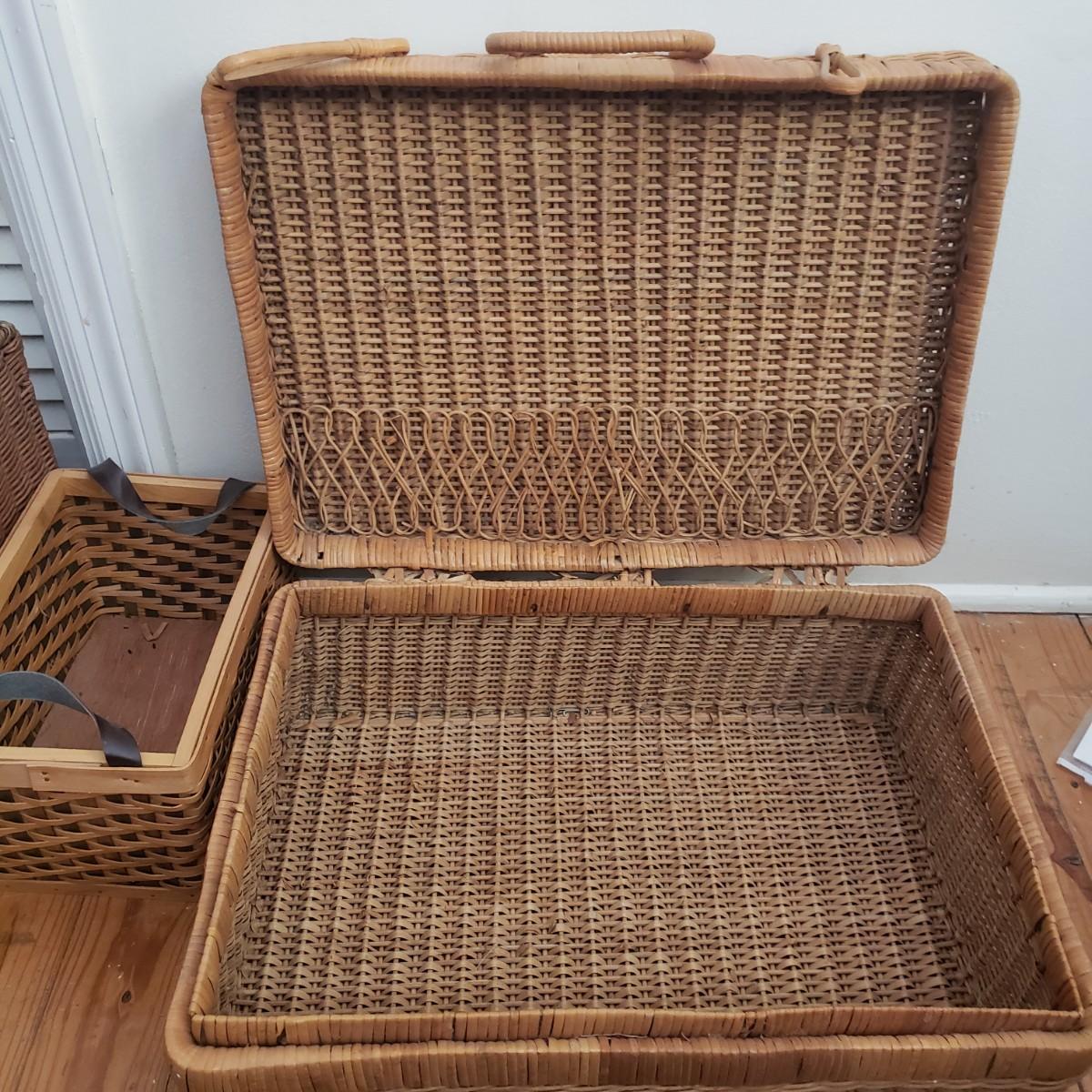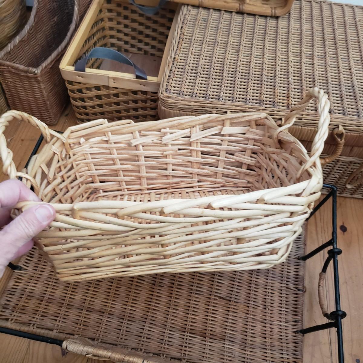 This large lot of baskets has such a variety! There is a wicker suitcase, a vintage purse, wire wrapped rectangular baskets for extra support and a handmade market basket with a leather wrapped handle. The three wicker utensil holders measure 12" x 7" x 6"H each. The purse with fabric lining the inside has "VML" embroidered on it with a sweet green velvet, yet a little faded, bow.