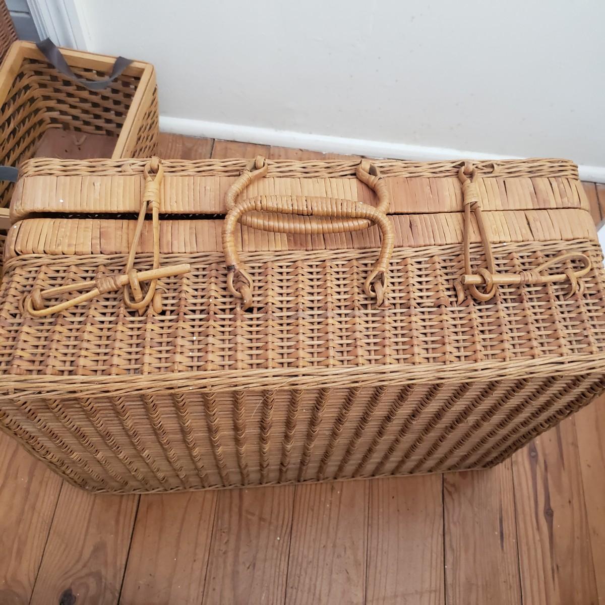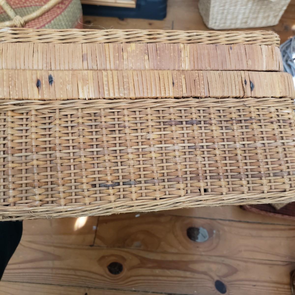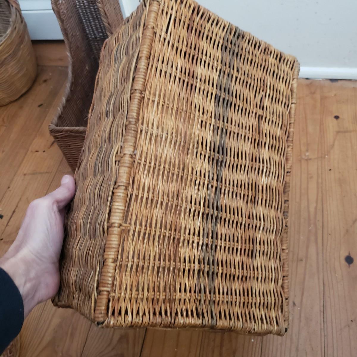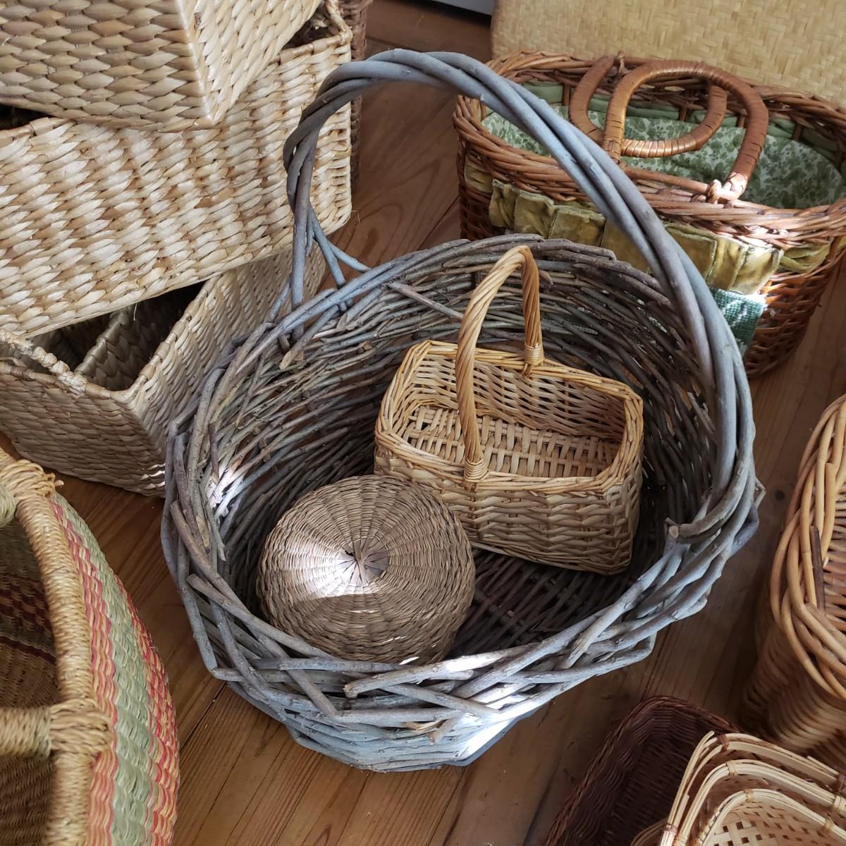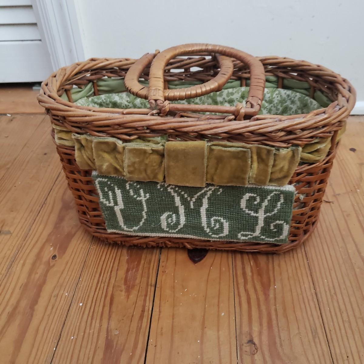 This large lot of baskets has such a variety! There is a wicker suitcase, a vintage purse, wire wrapped rectangular baskets for extra support and a handmade market basket with a leather wrapped handle. The three wicker utensil holders measure 12" x 7" x 6"H each. The purse with fabric lining the inside has "VML" embroidered on it with a sweet green velvet, yet a little faded, bow.